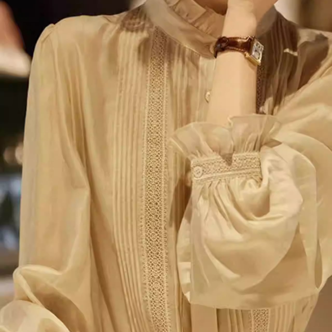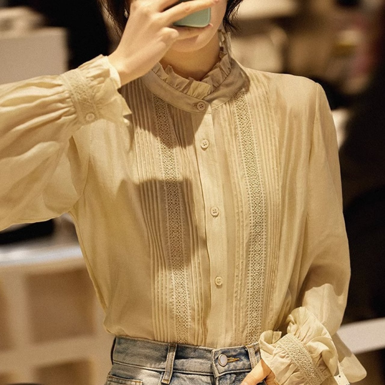 さりげないフリルが上品な印象をプラスするブラウス。