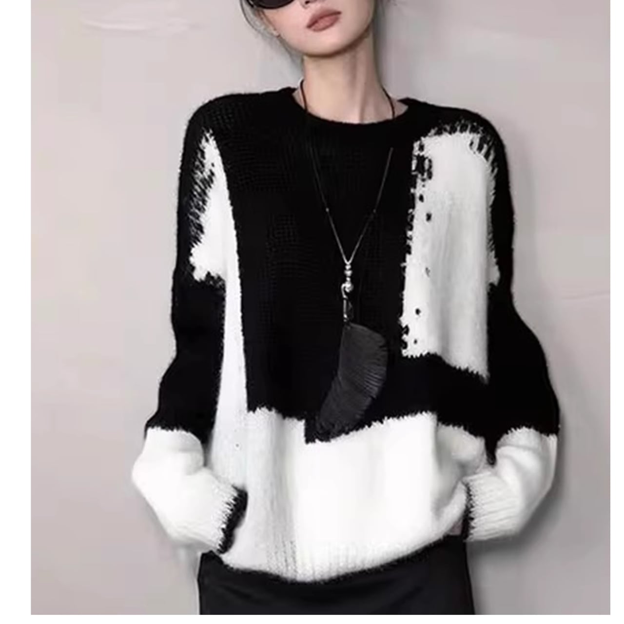 大胆なブロックパターンが目を引くニットは、着るだけでコーディネートの主役になる一枚。