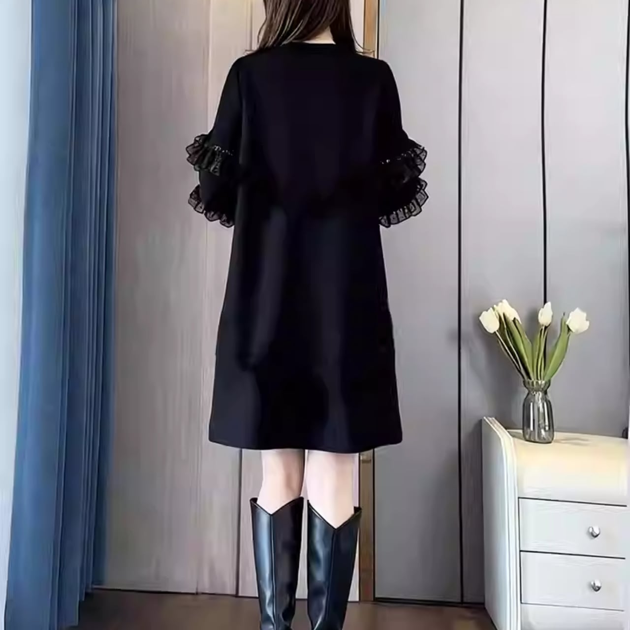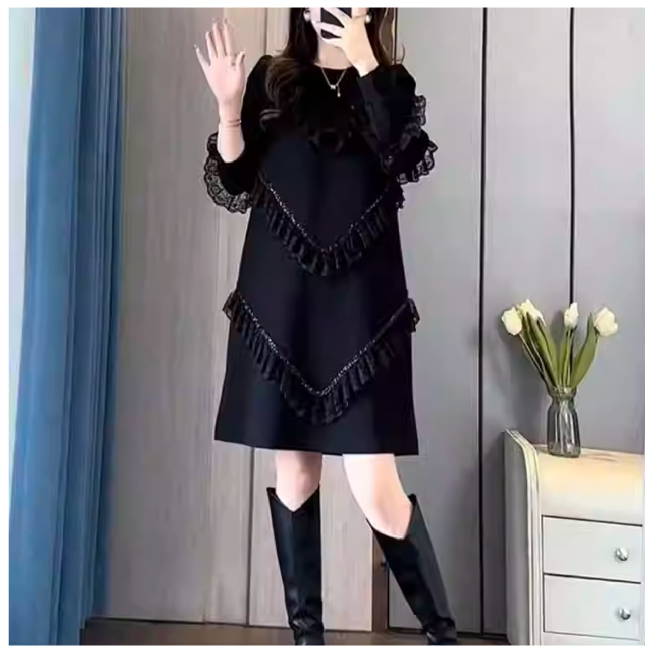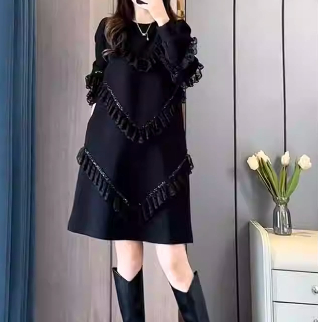 デコルテとスカート部分にあしらわれたフリルが、華やかさをプラス。アクセサリーなしでも、着るだけでコーディネートが完成します。