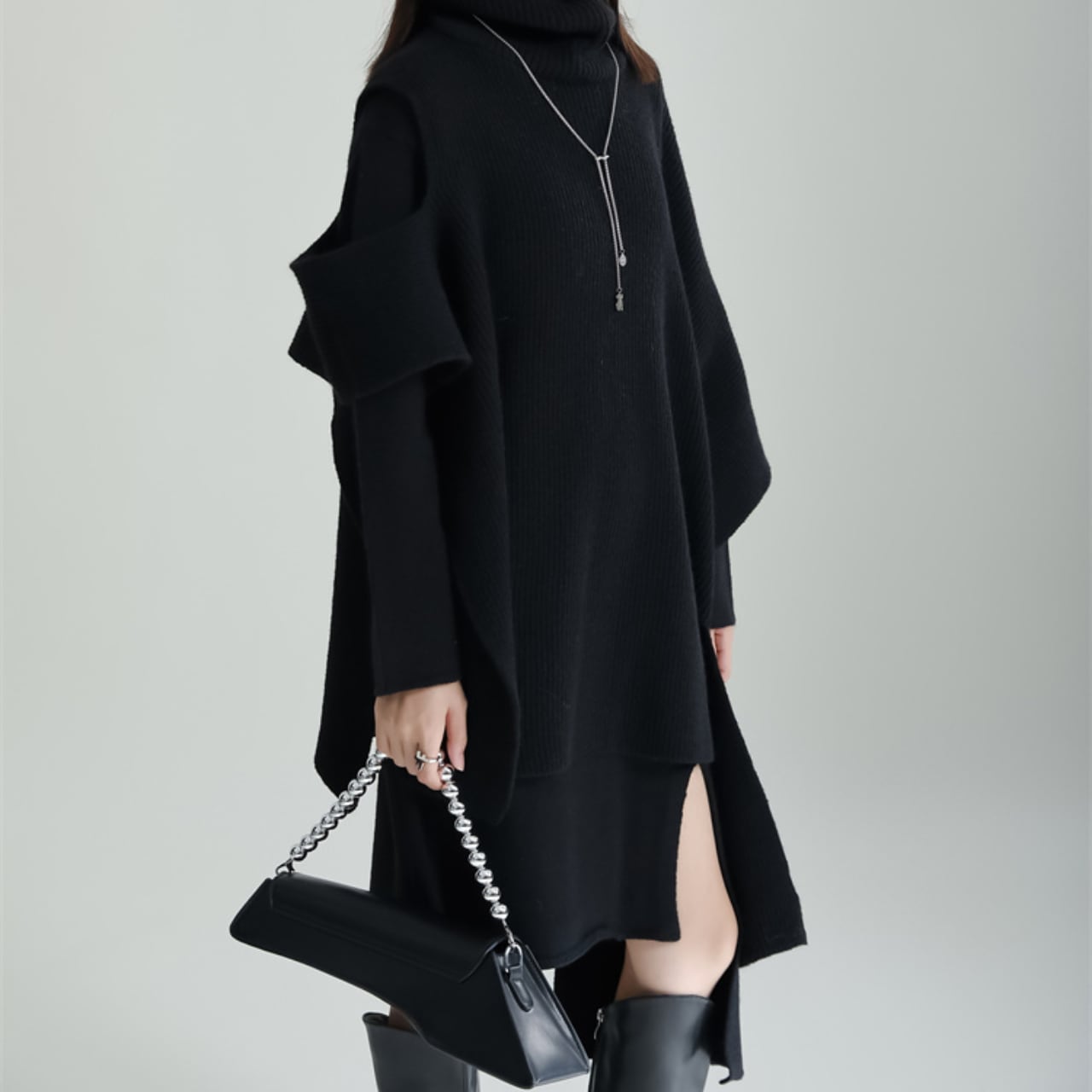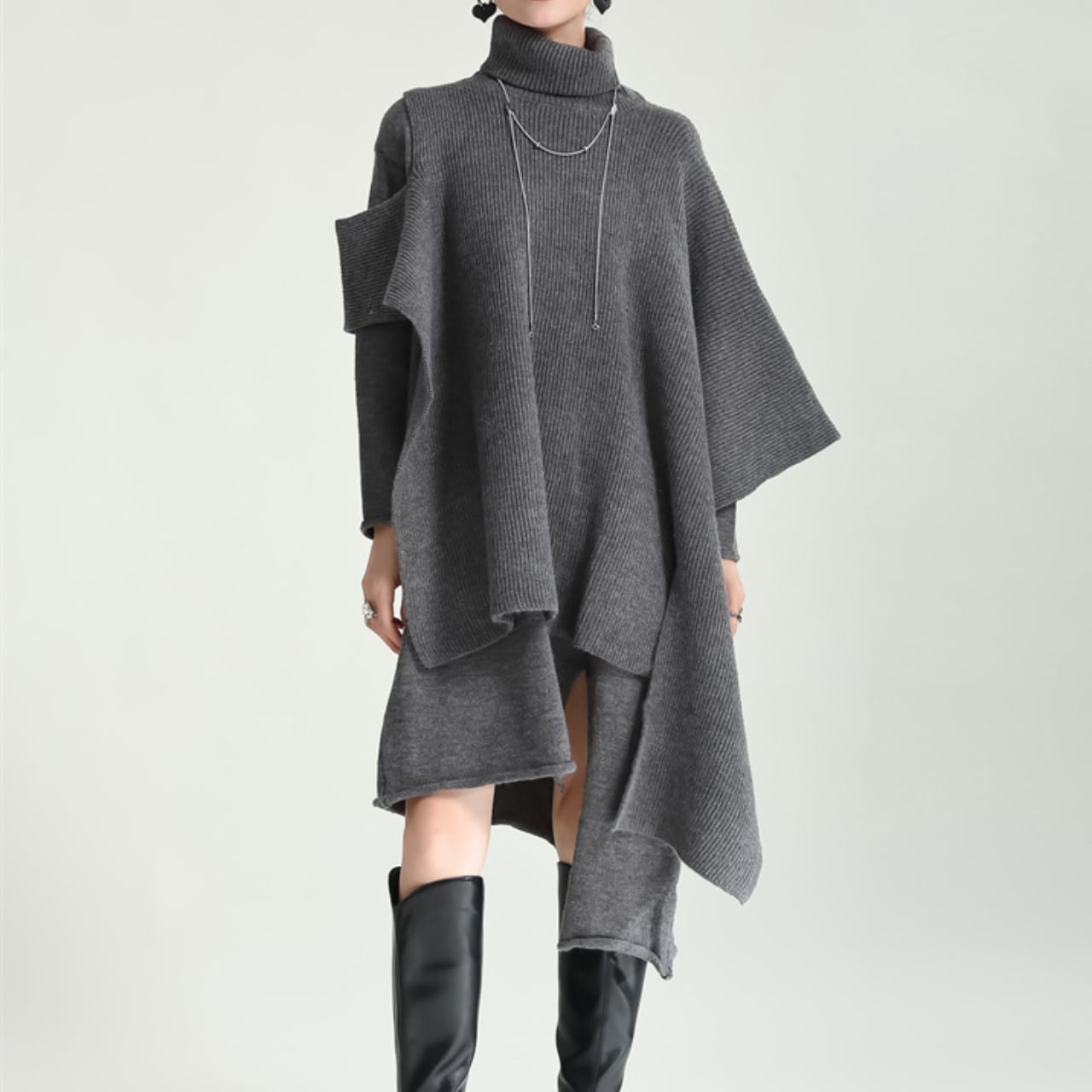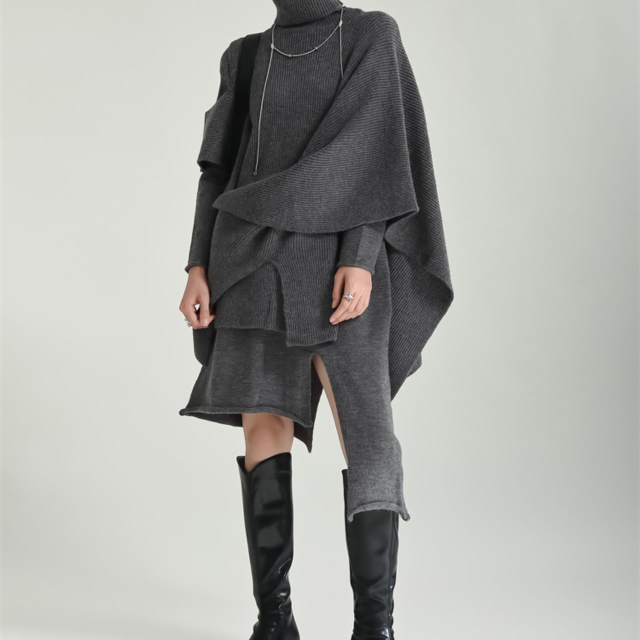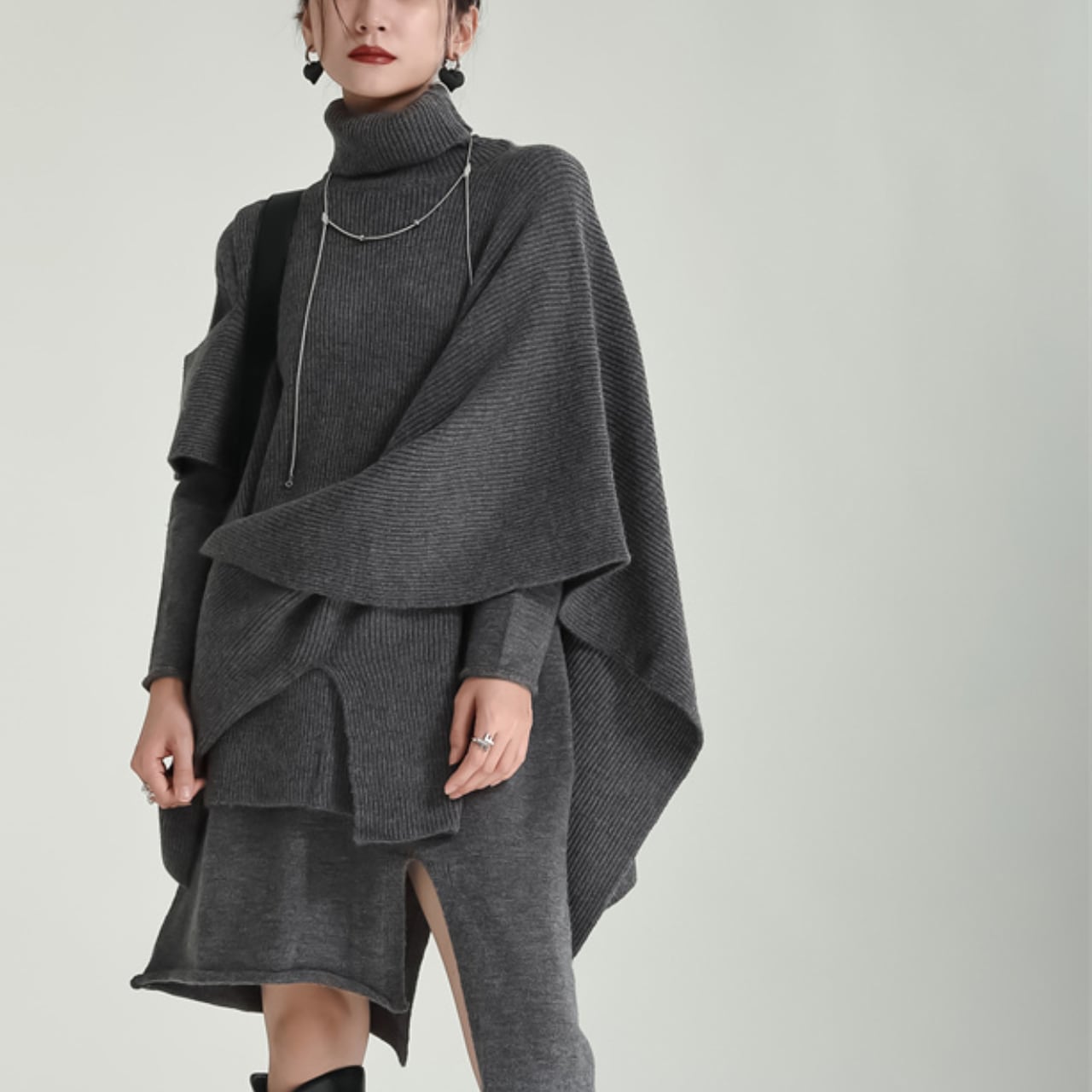 アシンメトリーなデザインが目を引くワンピースとショールのセット