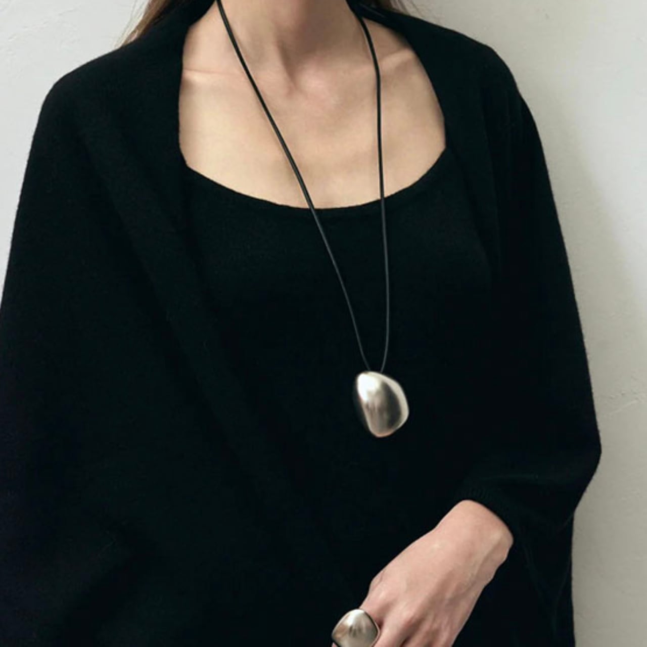 長めのチェーンが、縦のラインを強調し、すっきりとした印象に。