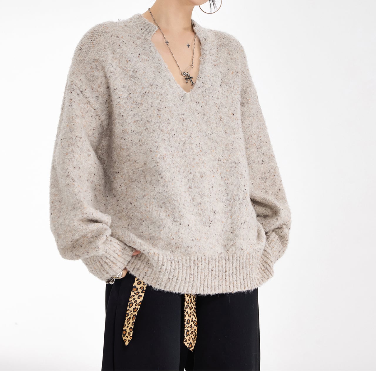 深すぎないVネックが、顔まわりをすっきりと見せてくれます。