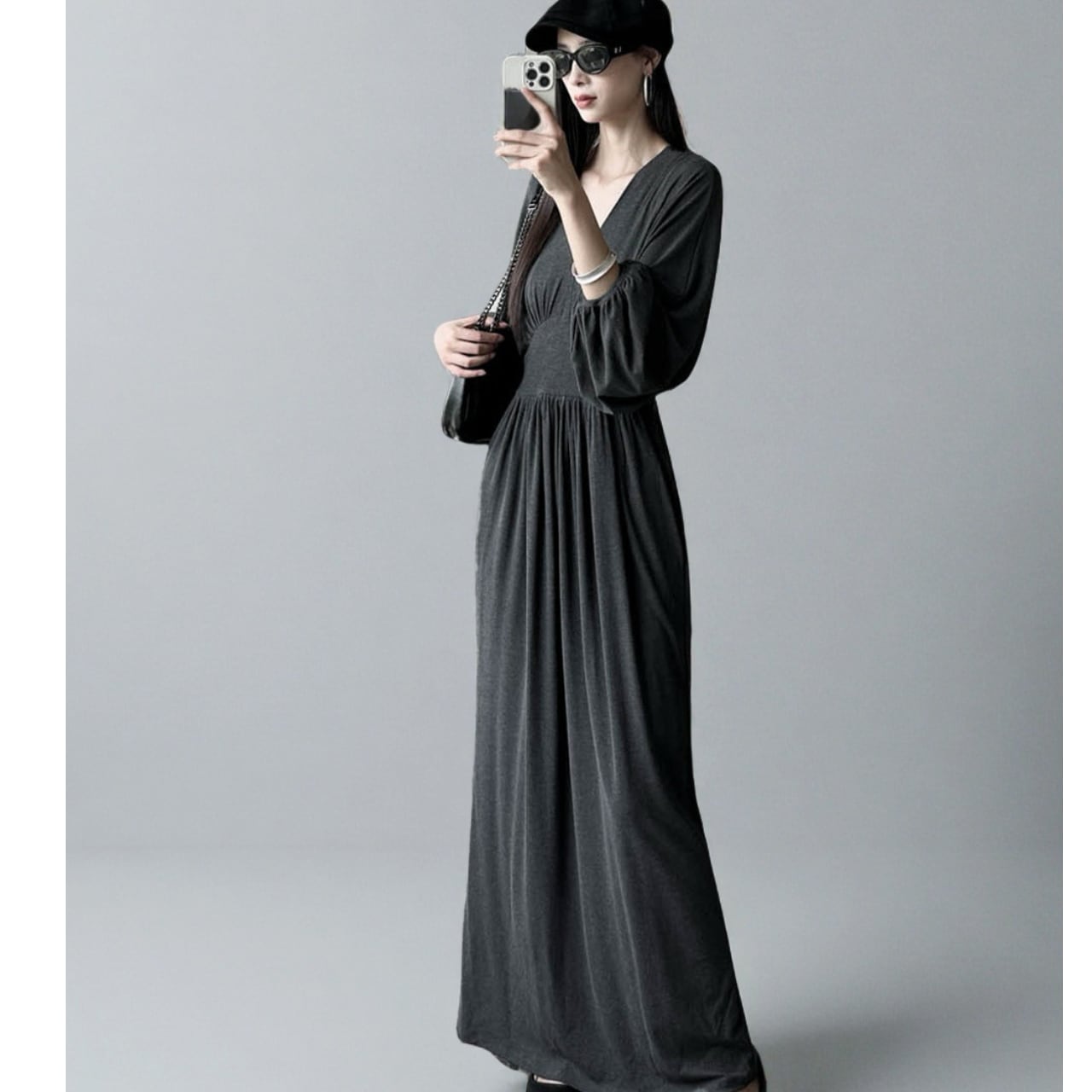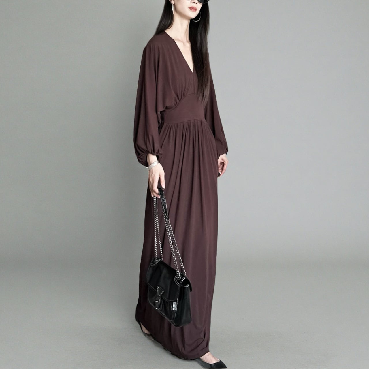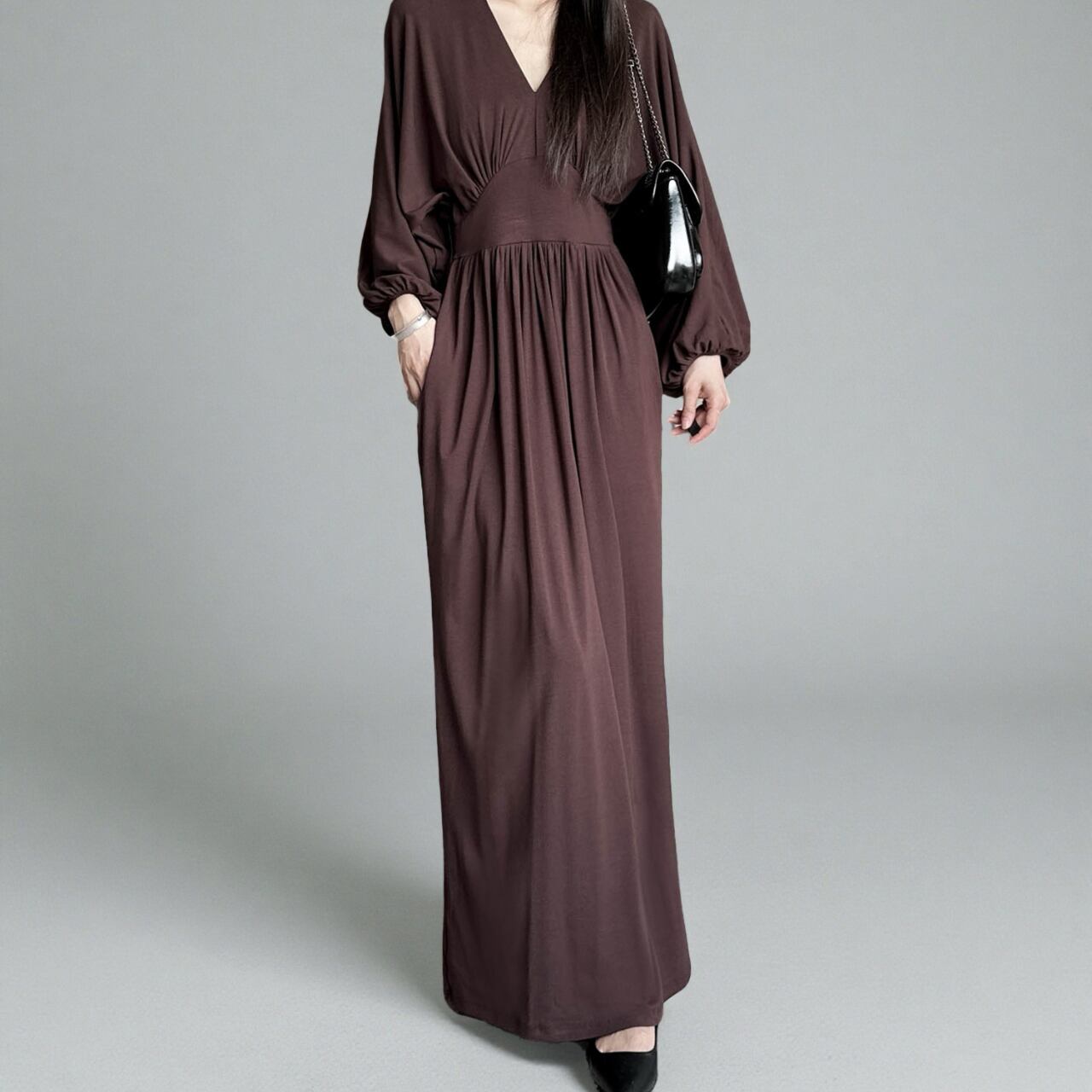 Vネックが顔まわりをすっきりと見せてくれるロングワンピース。