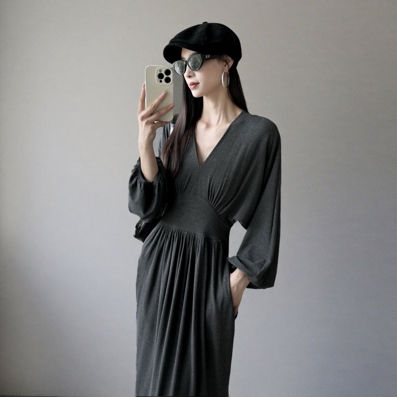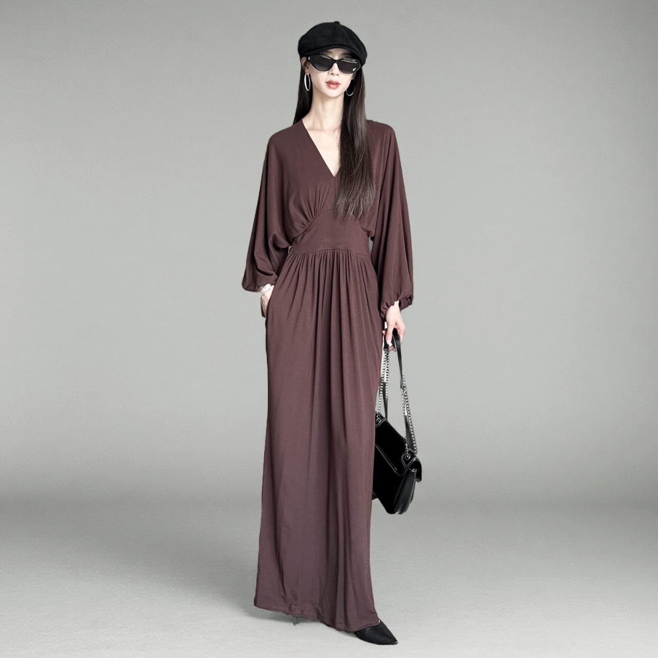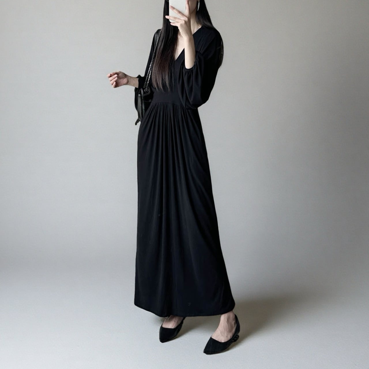Vネックが顔まわりをすっきりと見せてくれるロングワンピース。