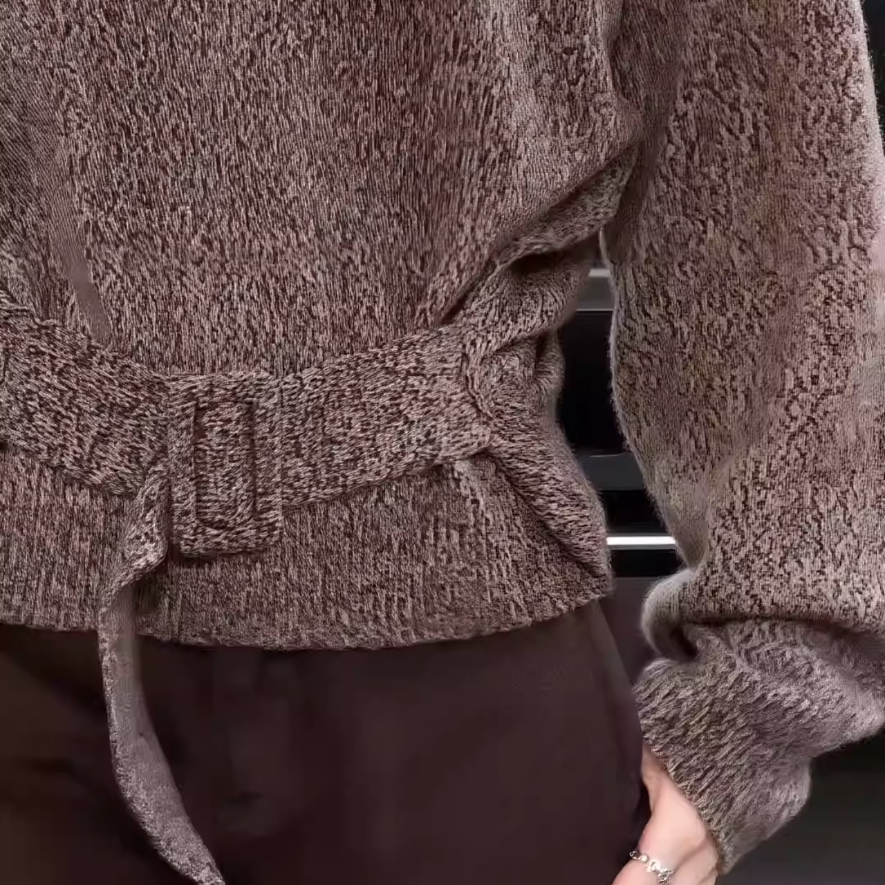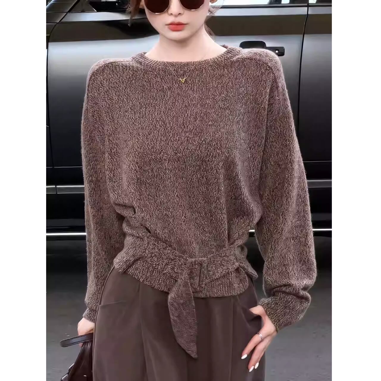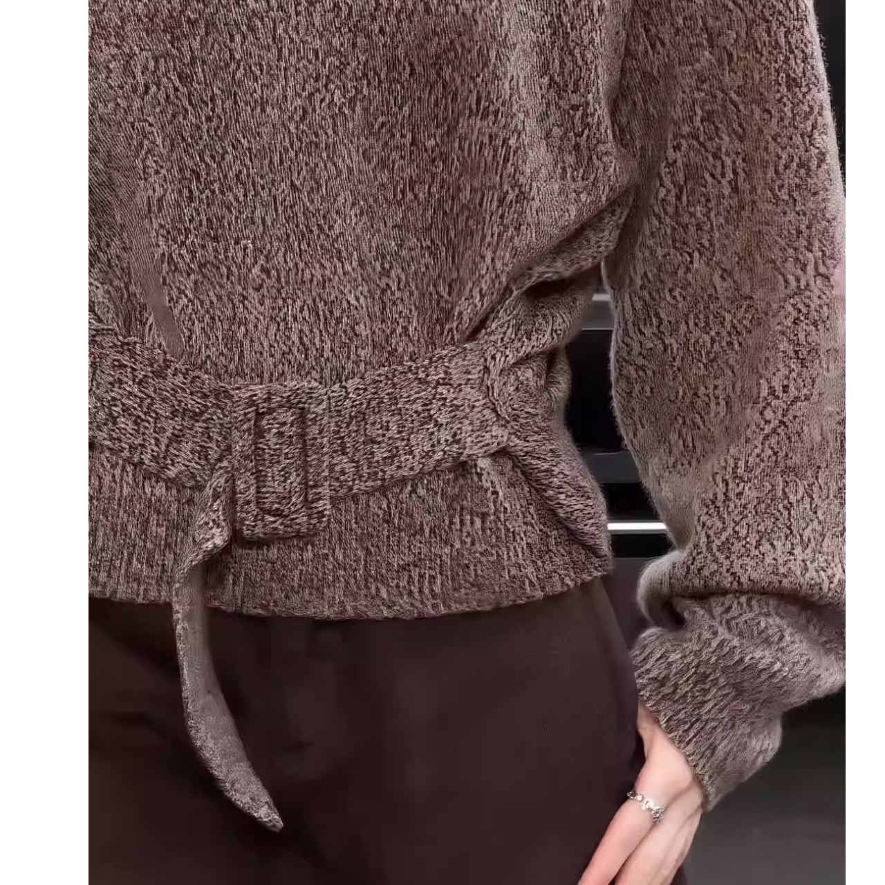 ウエストベルトがアクセントになるニットトップスは、スタイルアップ効果も期待できます。