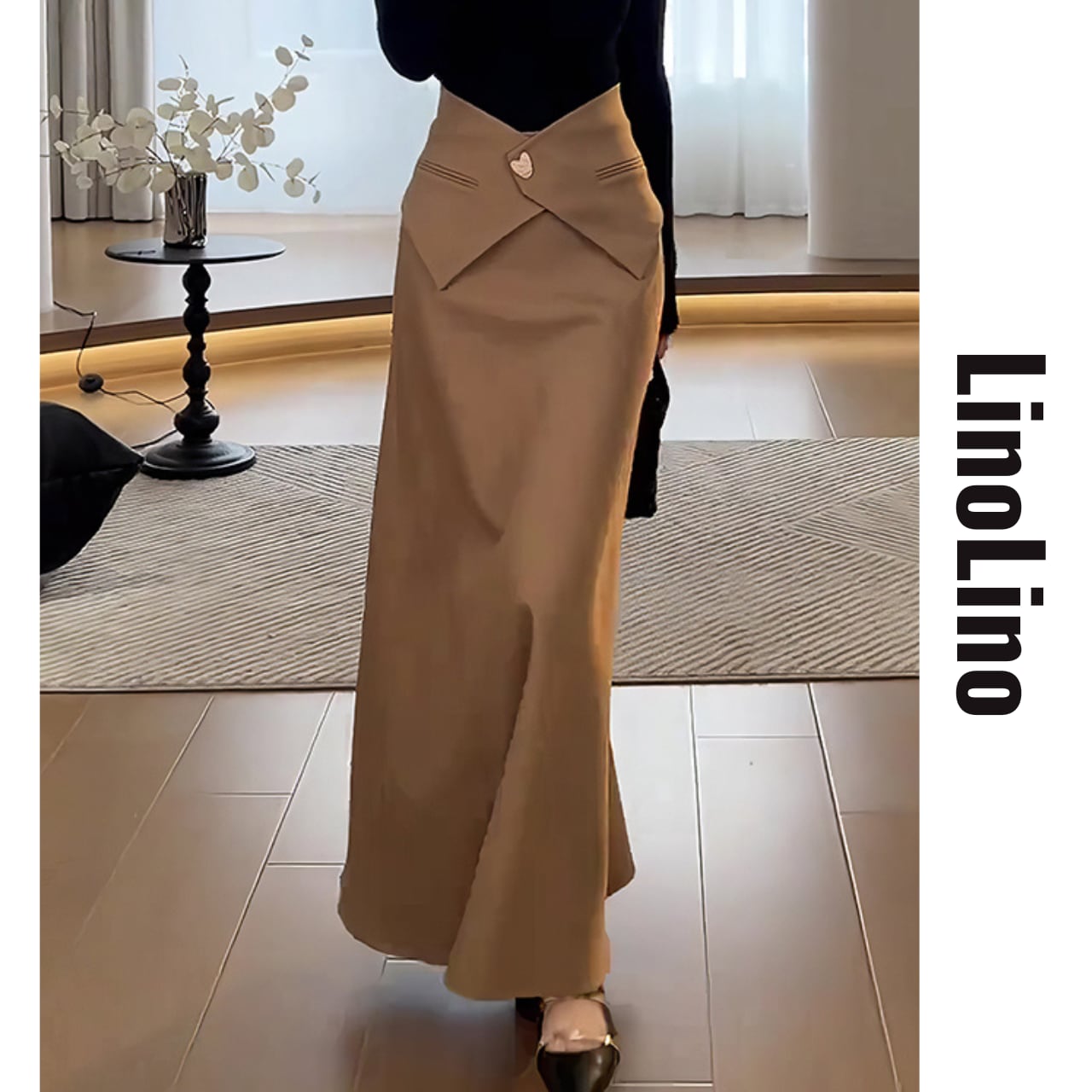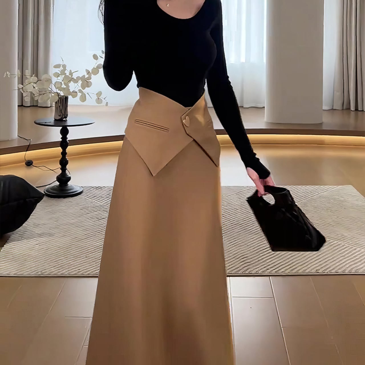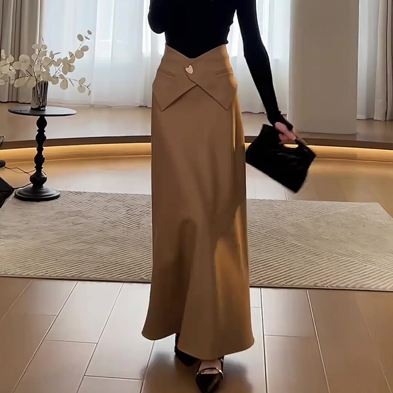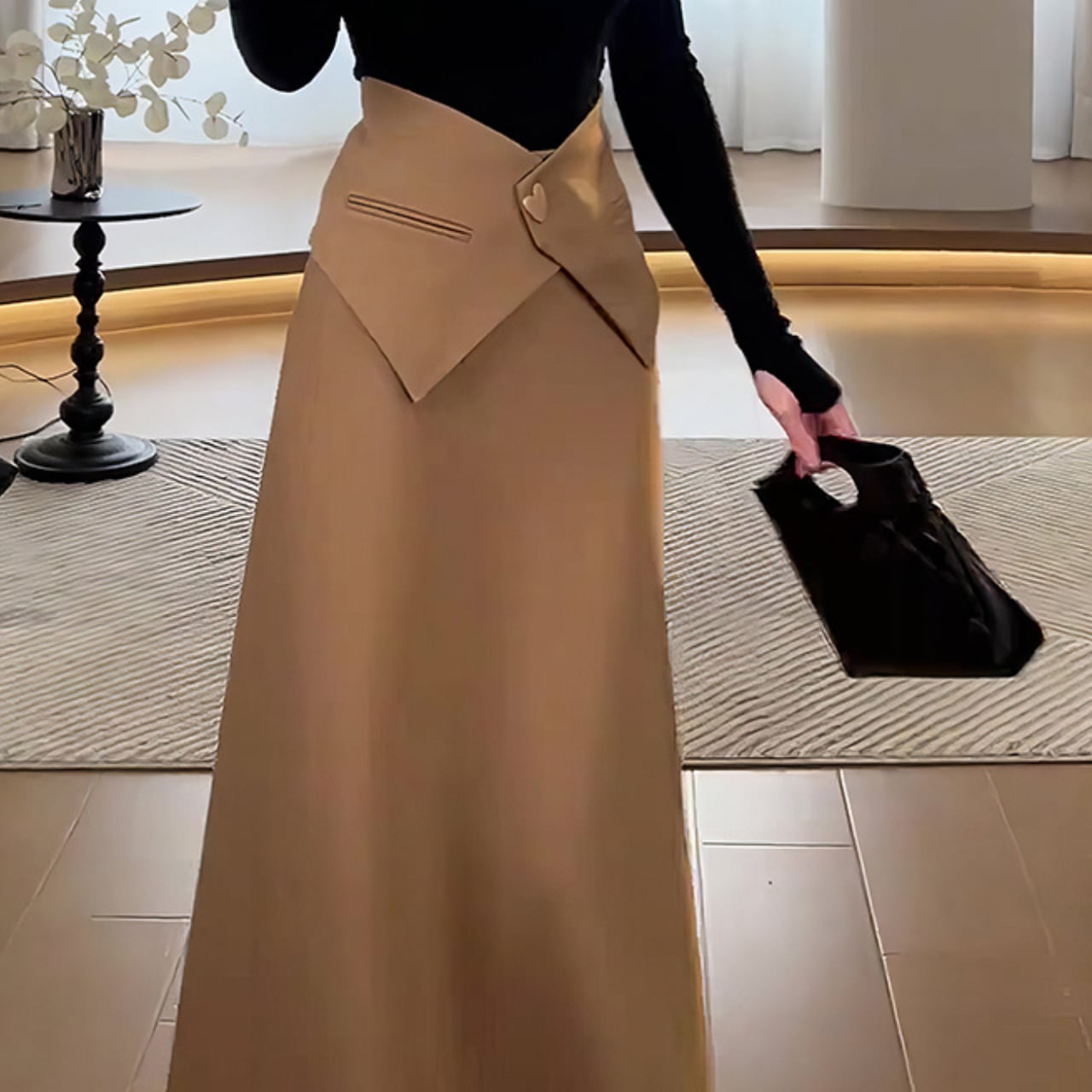 アシンメトリーなデザインが目を引く、ロングタイトスカート。