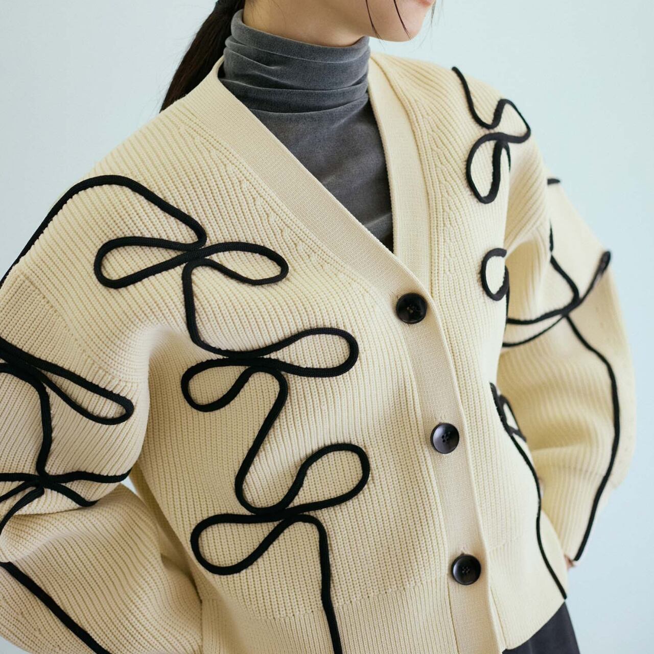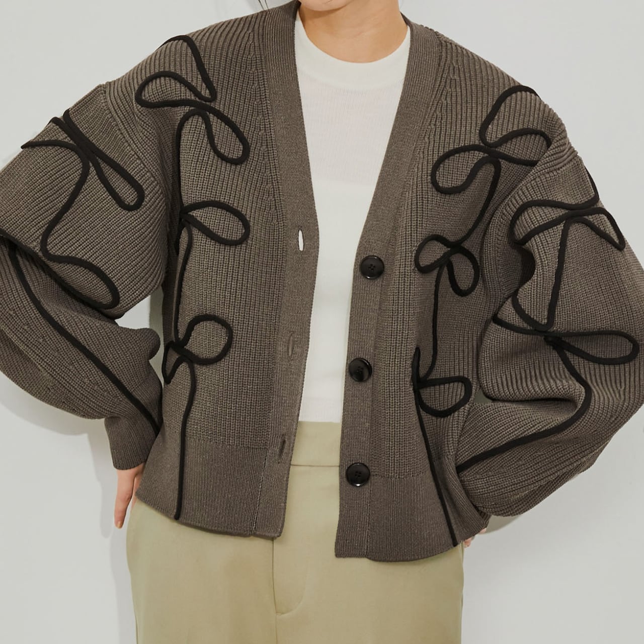 存在感のあるデザインが目を惹く、Vネックカーディガンです。