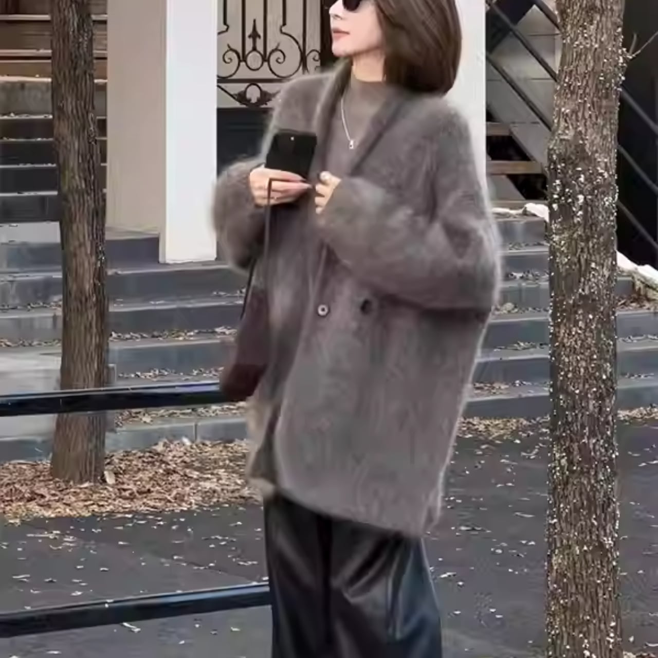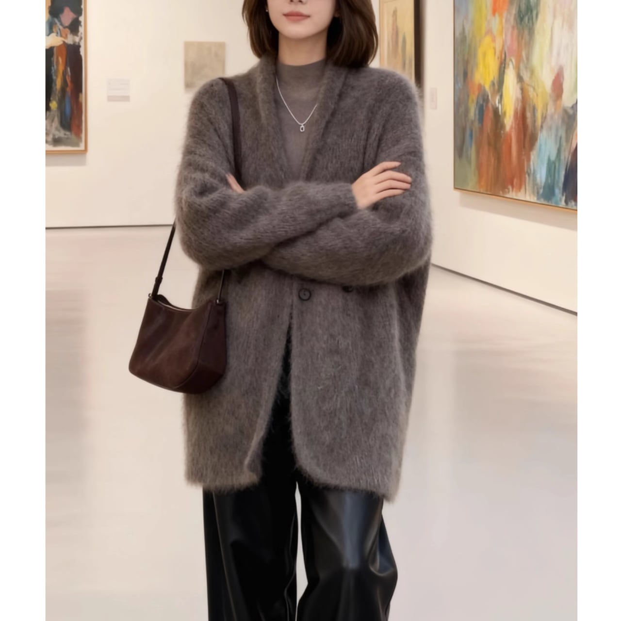 ふんわりとしたシルエットが魅力のニットコートは、気になる部分をさりげなくカバーしつつ、上品な印象を与えます。ゆったりとしたオーバーサイズで、リラックス感のある着心地。