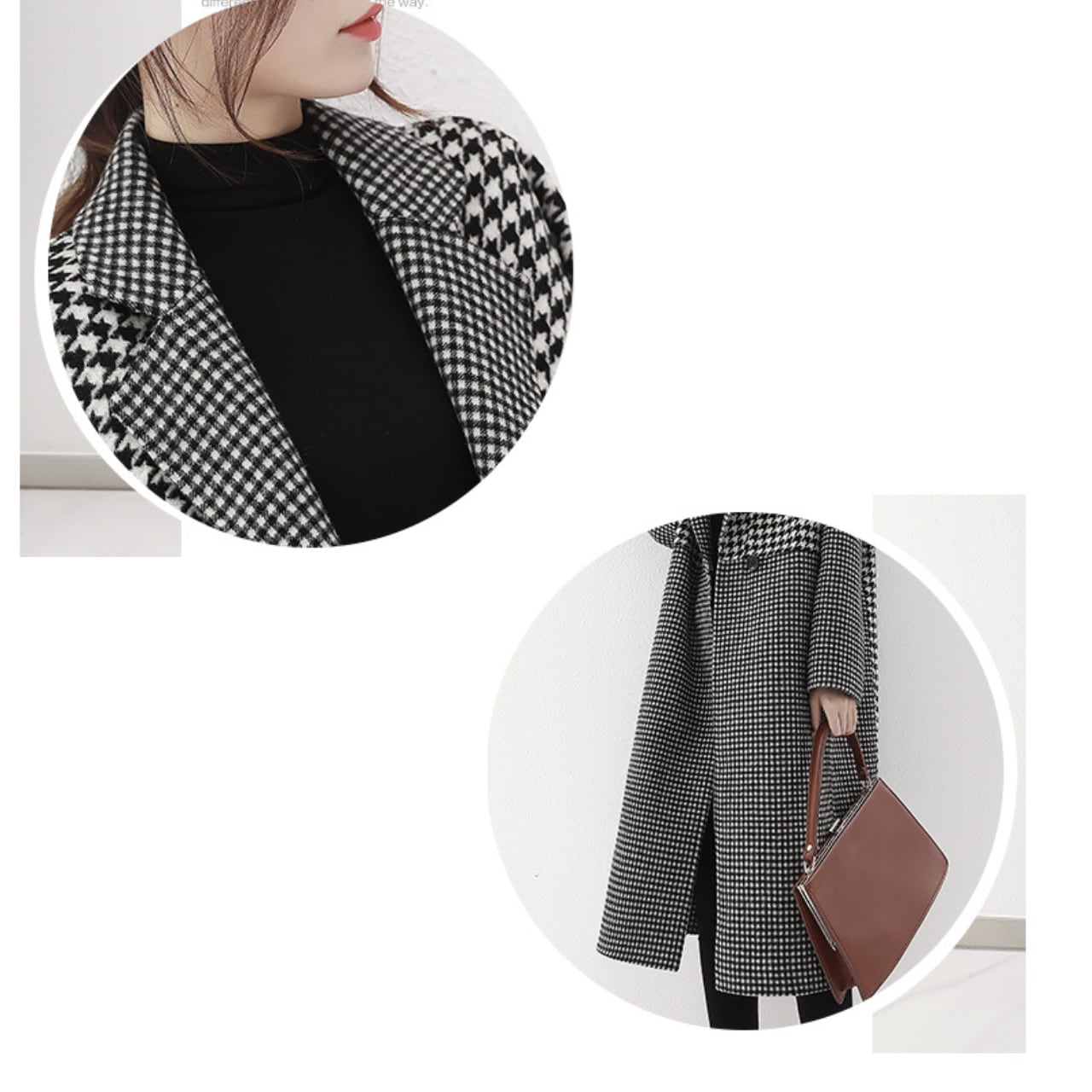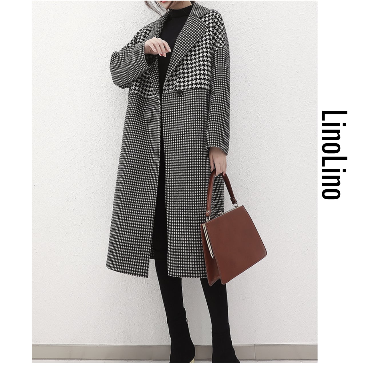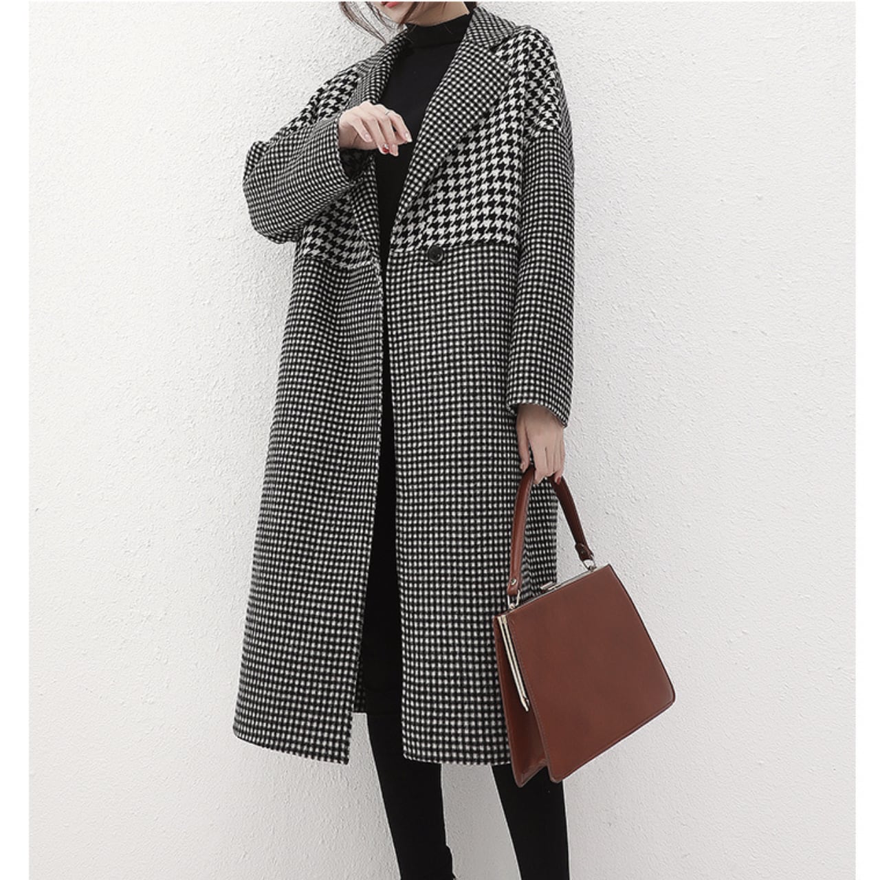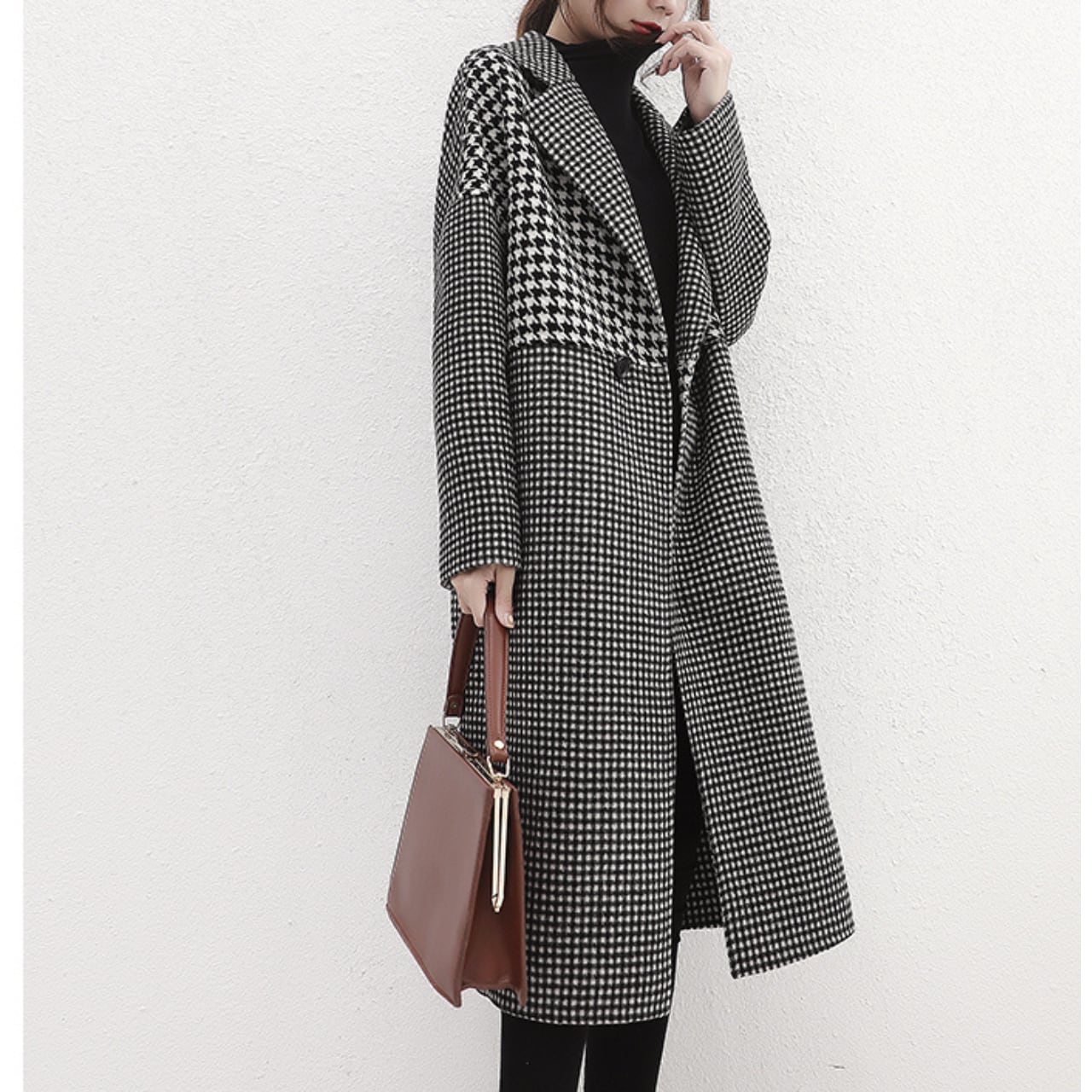 Double-breasted long houndstooth coat L00708