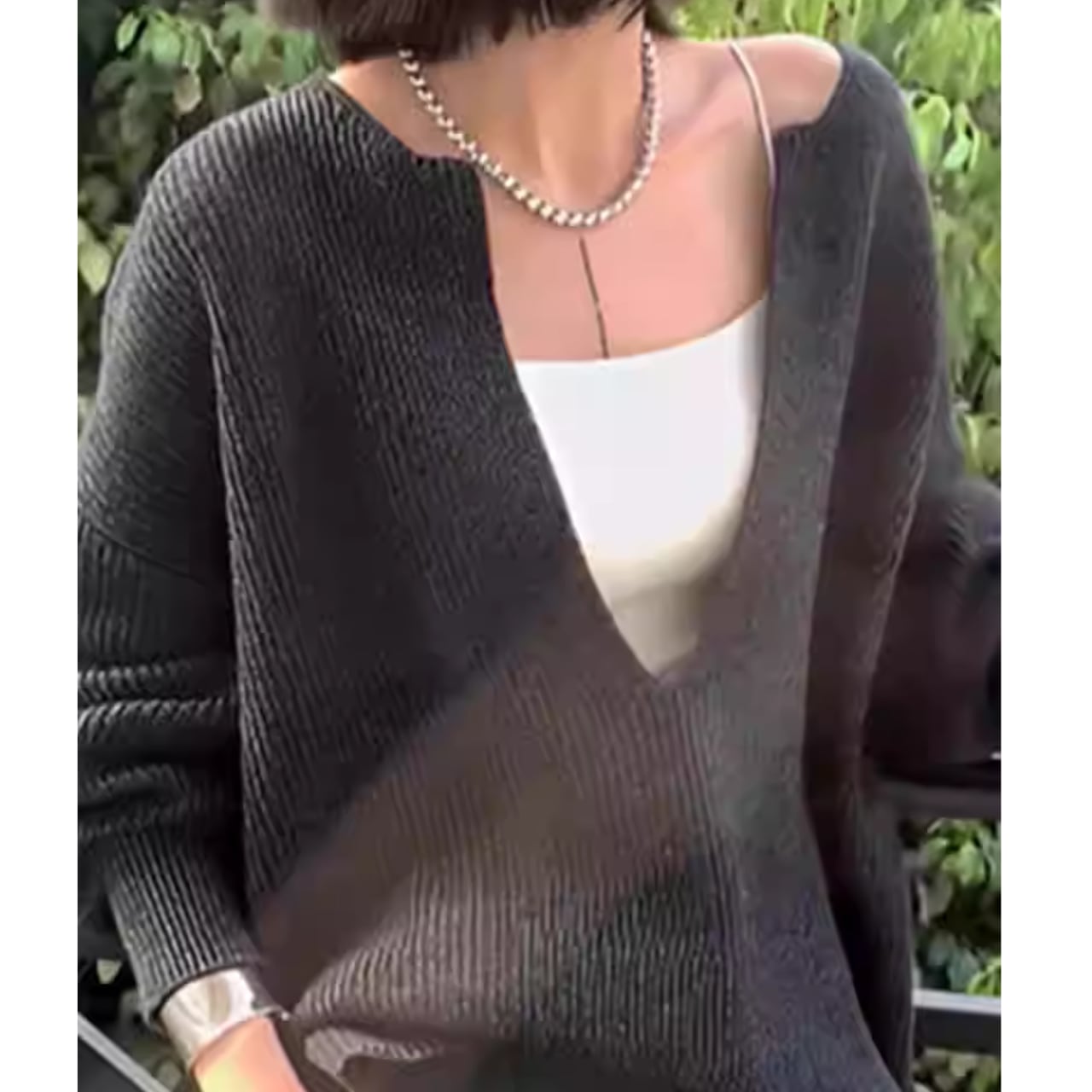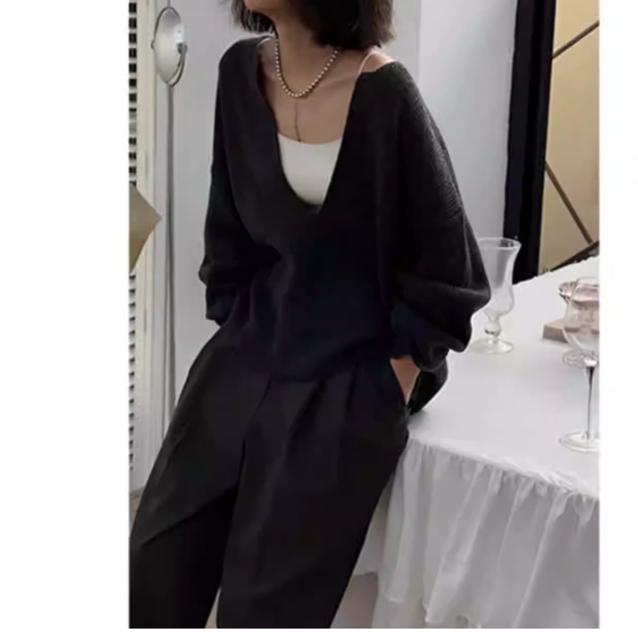 深めのVネックが、顔まわりをすっきりと見せてくれるニット。