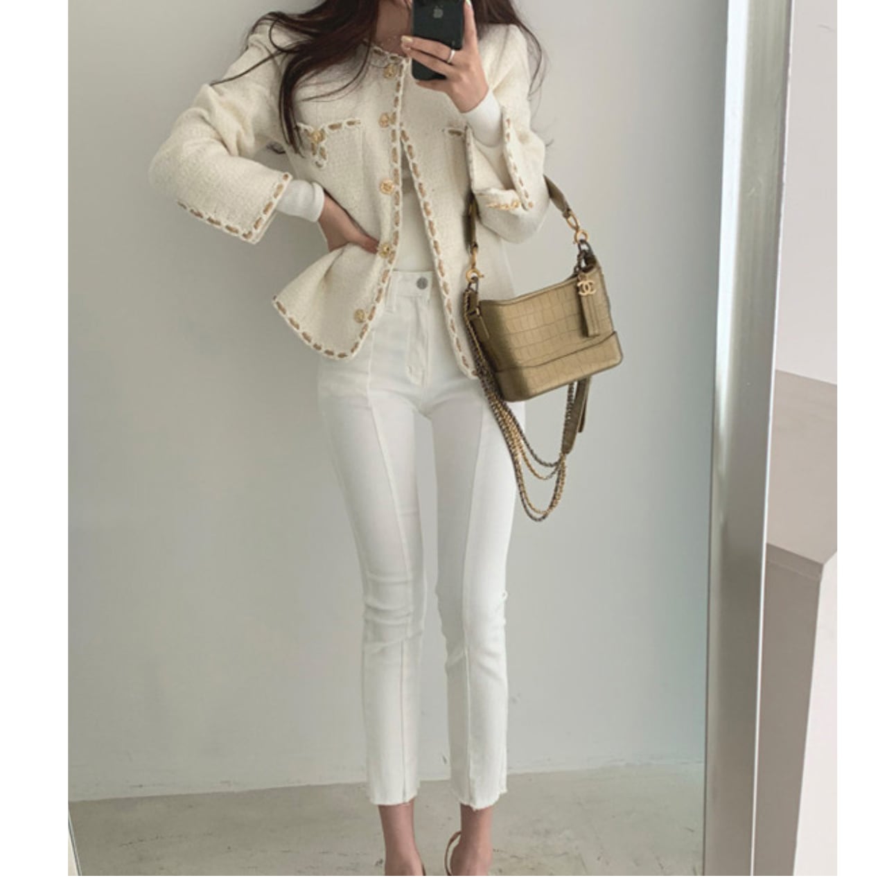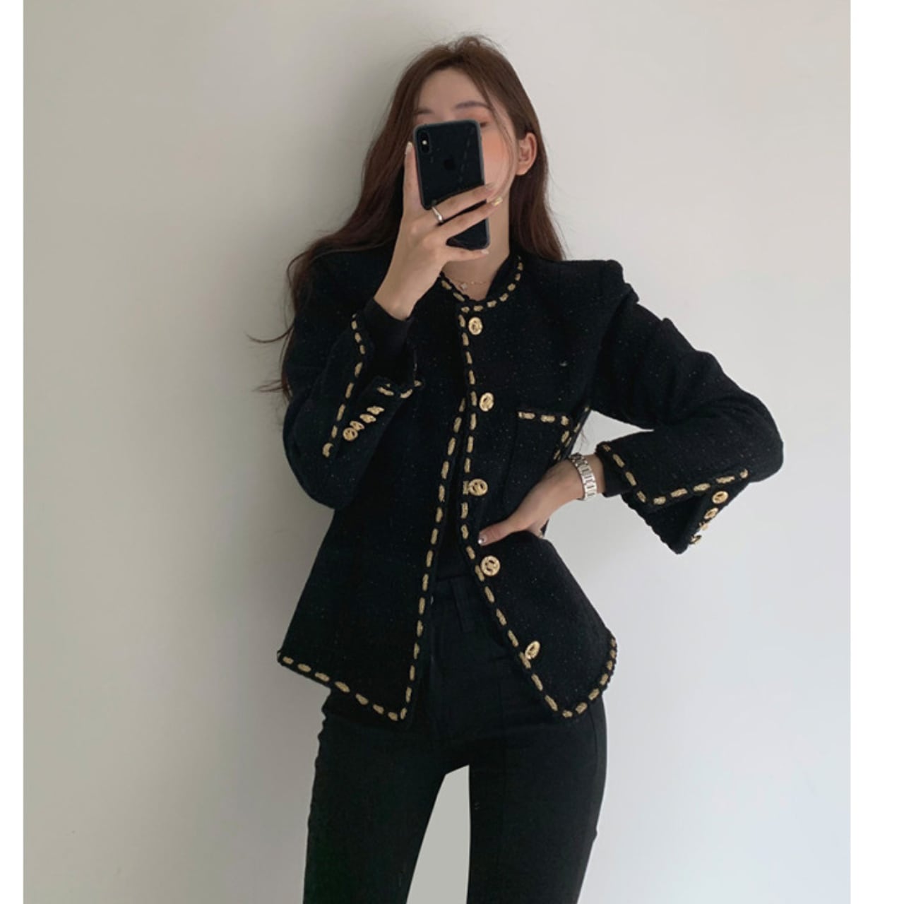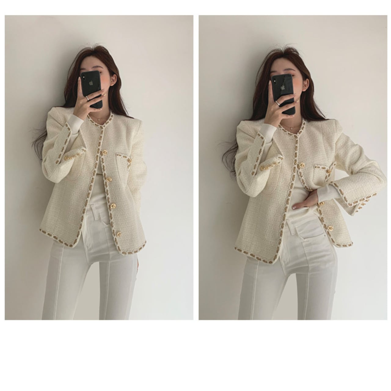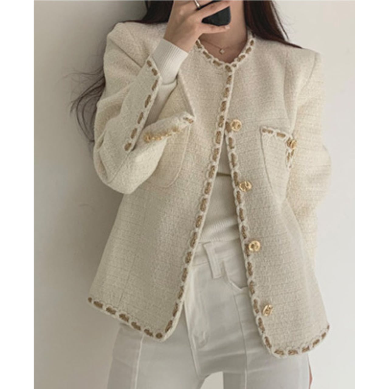 さっと羽織るだけで、上品な印象をプラスするノーカラージャケット。