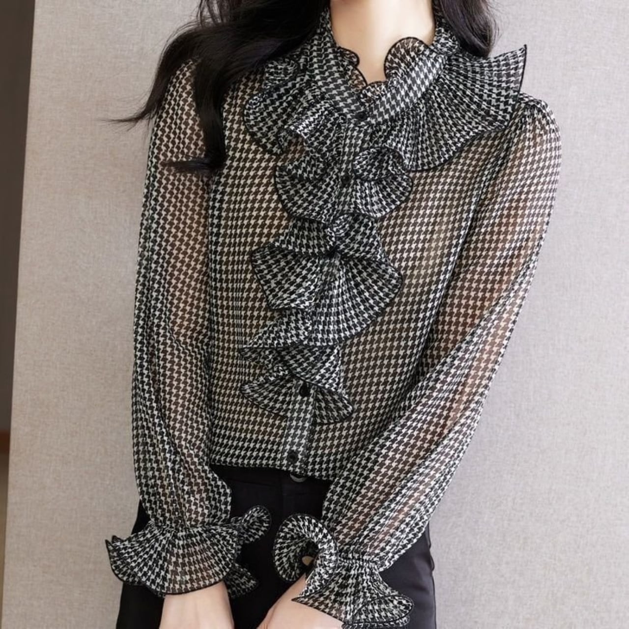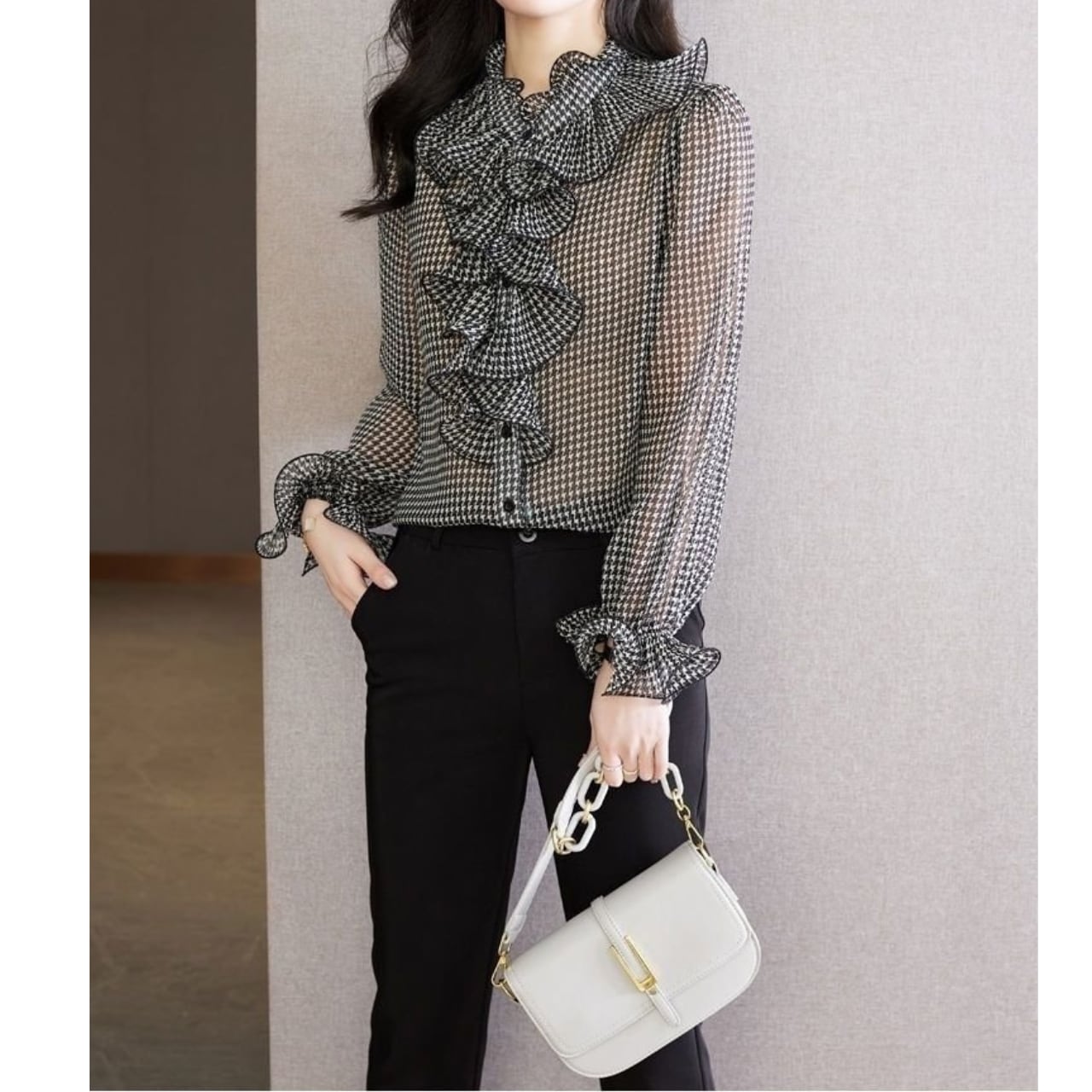 ふんわりとしたフリルが目を惹くブラウスは、上品な印象を与えつつ、気になる部分をさりげなくカバーしてくれます。