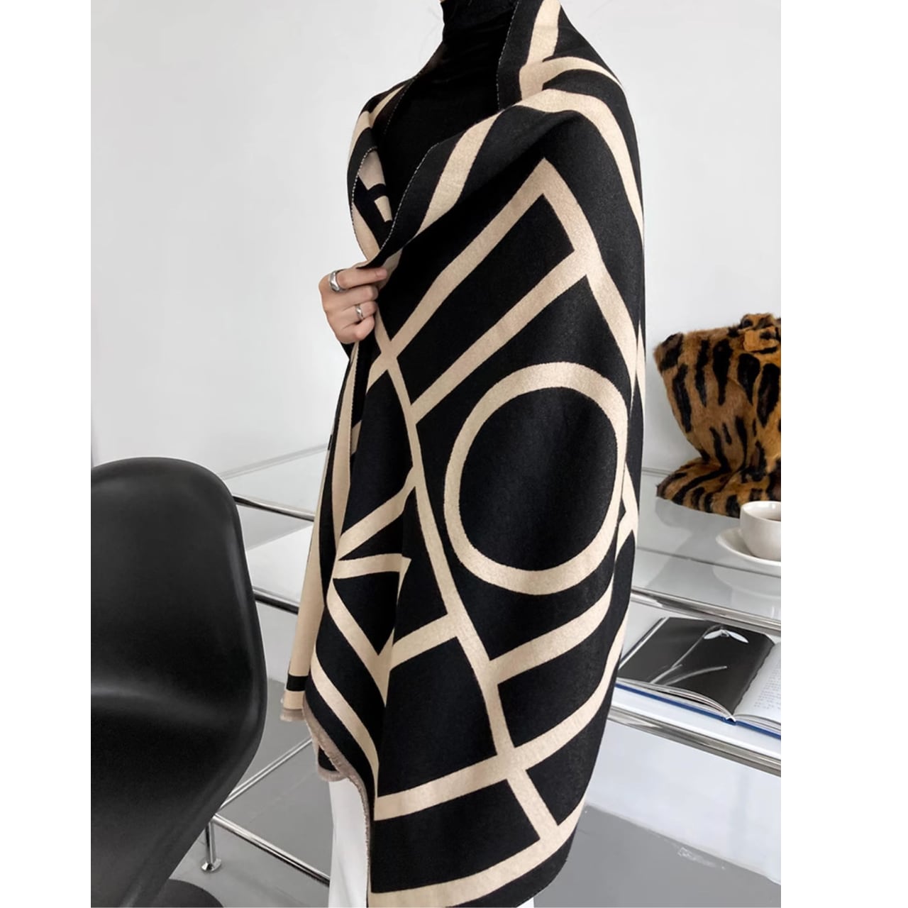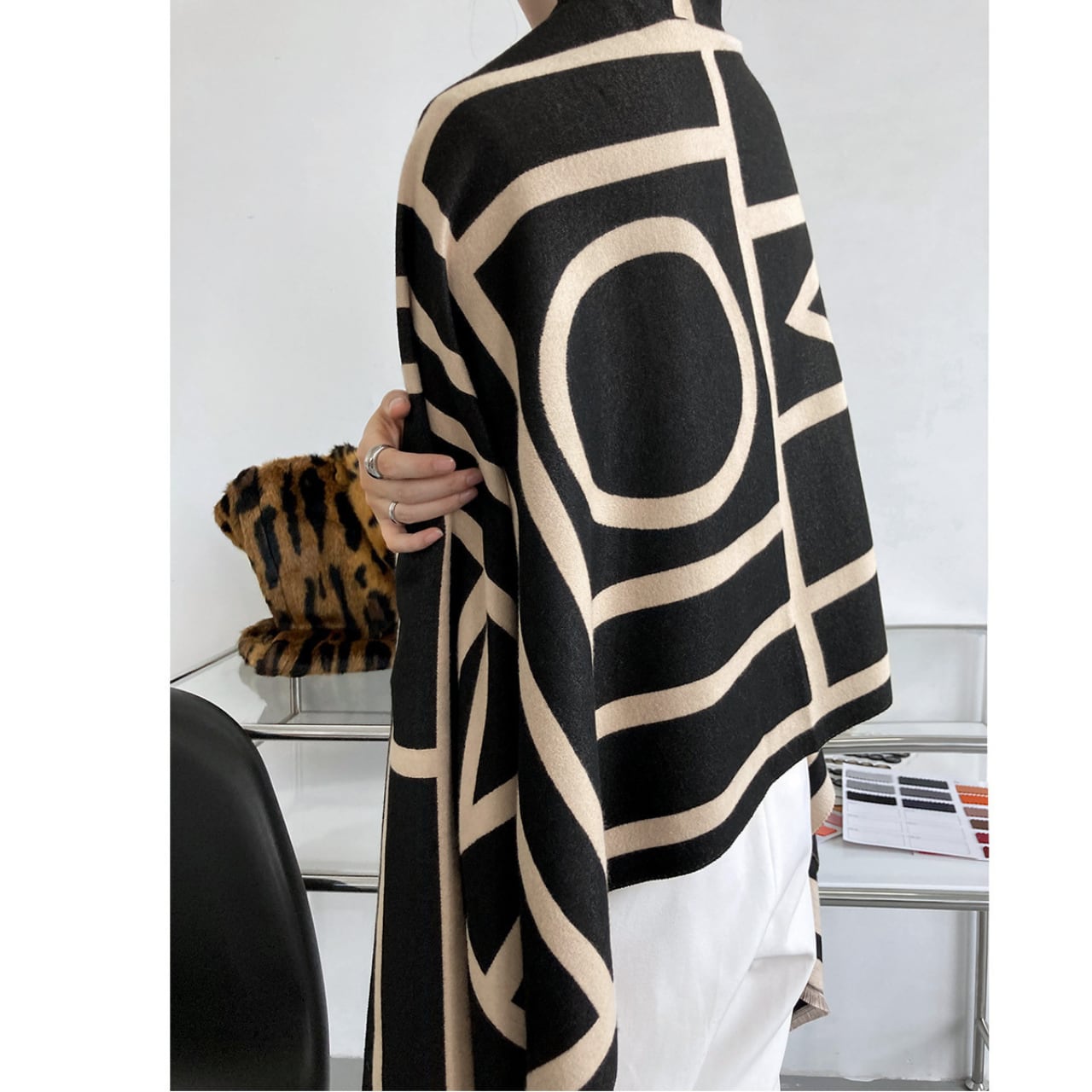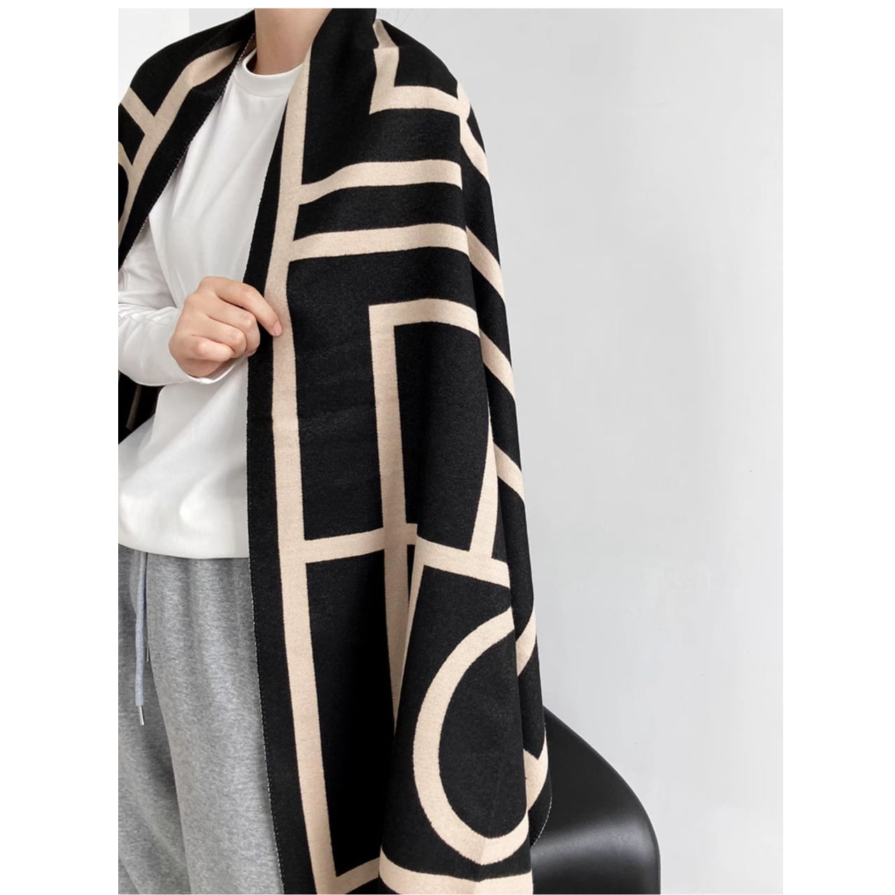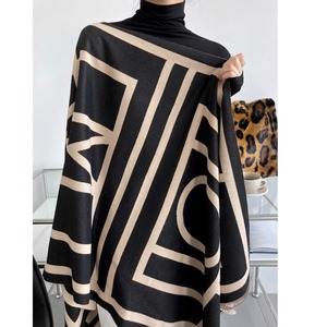 大胆なジオメトリック柄が目を引く、大判ニットストールです。