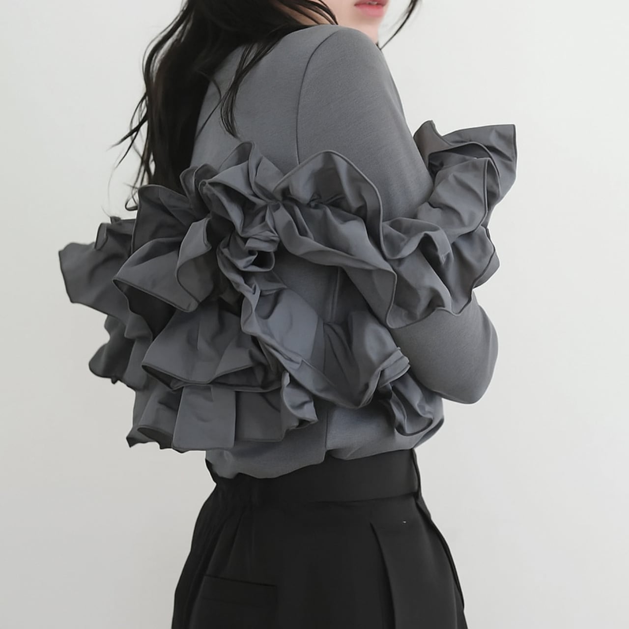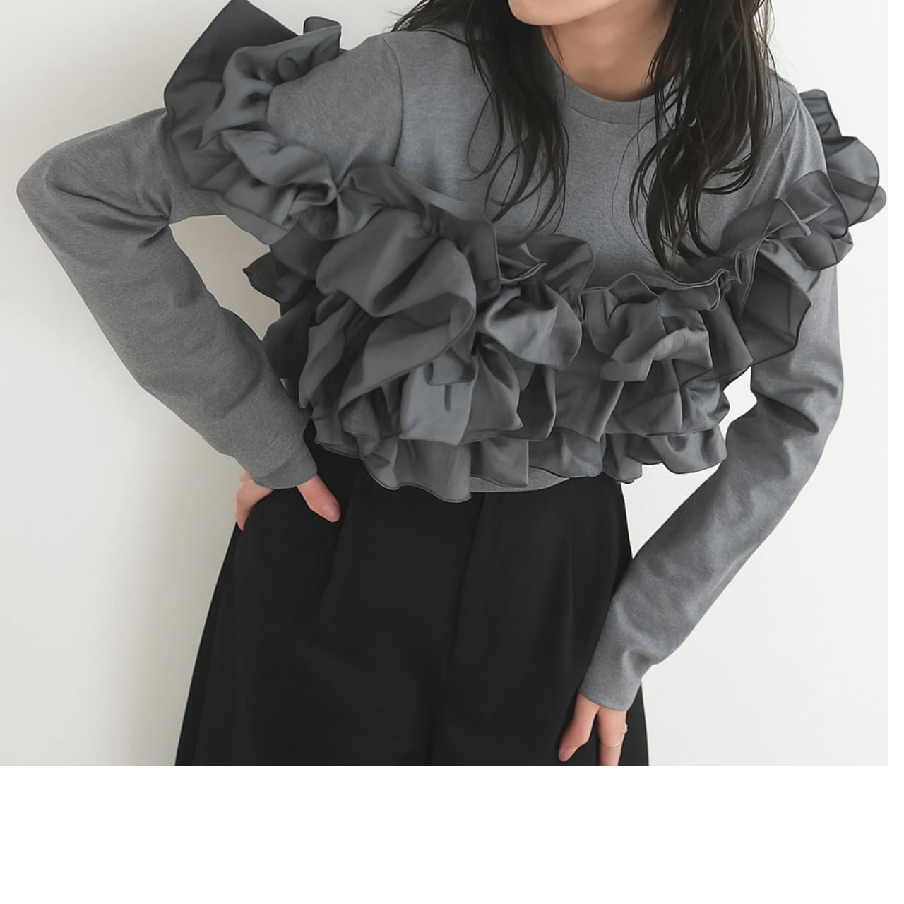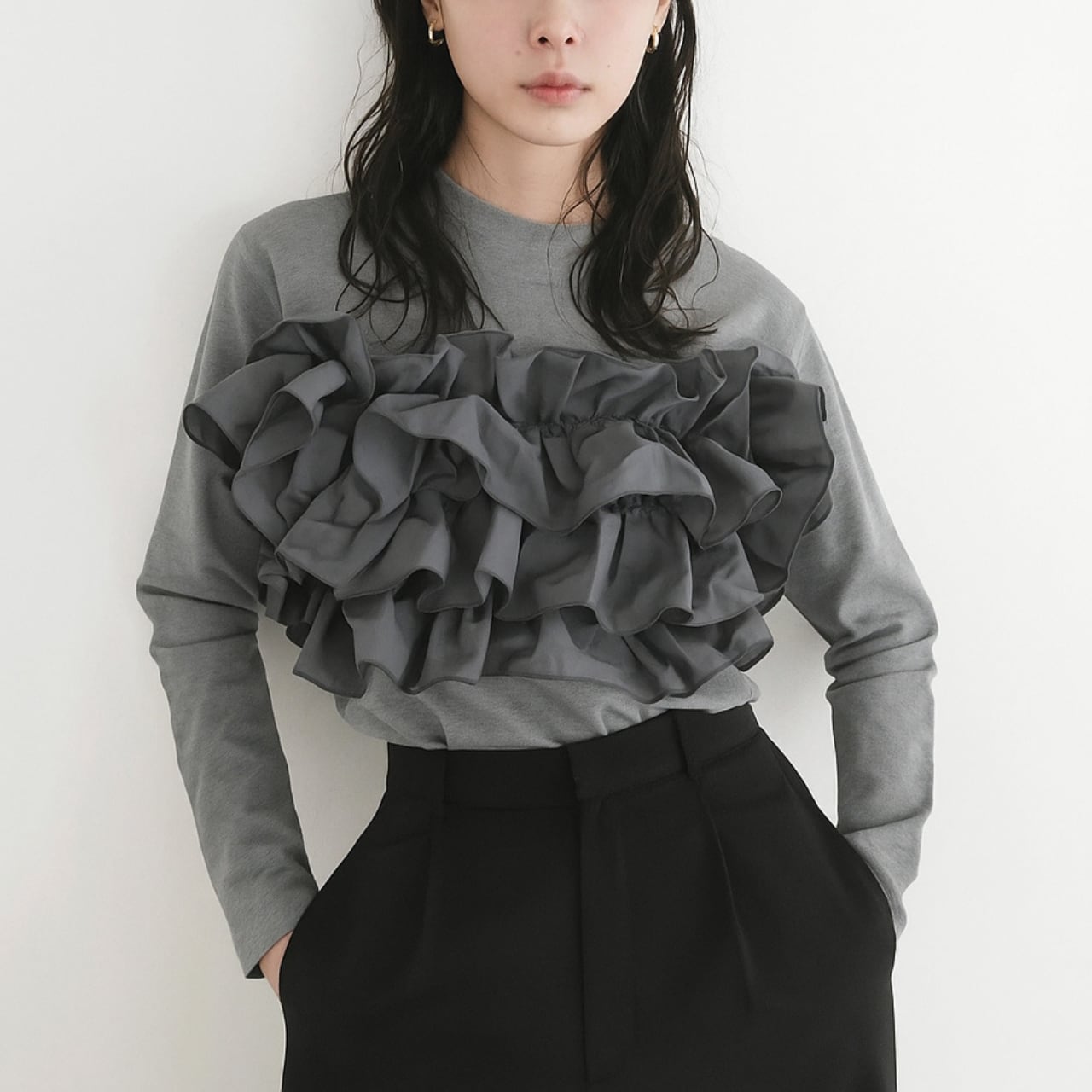 立体的なフリルを贅沢にあしらった、存在感たっぷりのレイヤードトップスです。