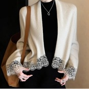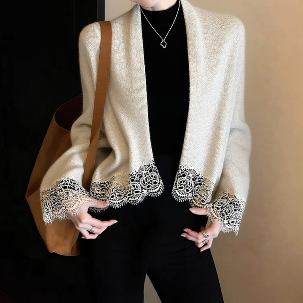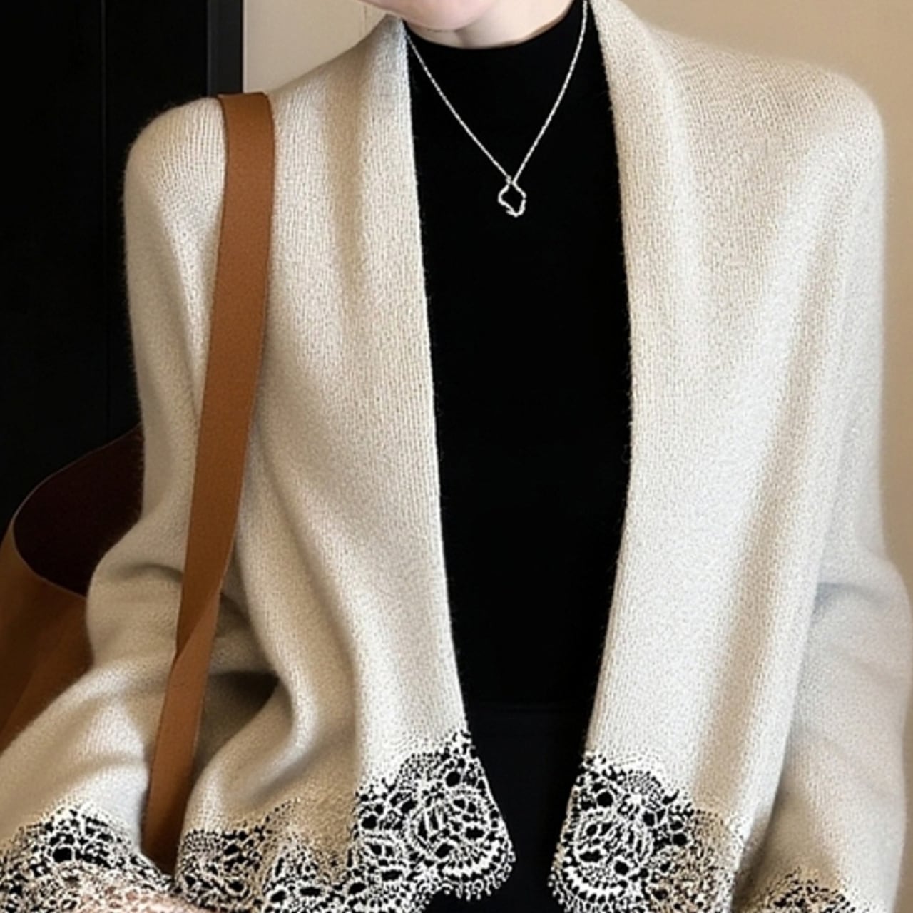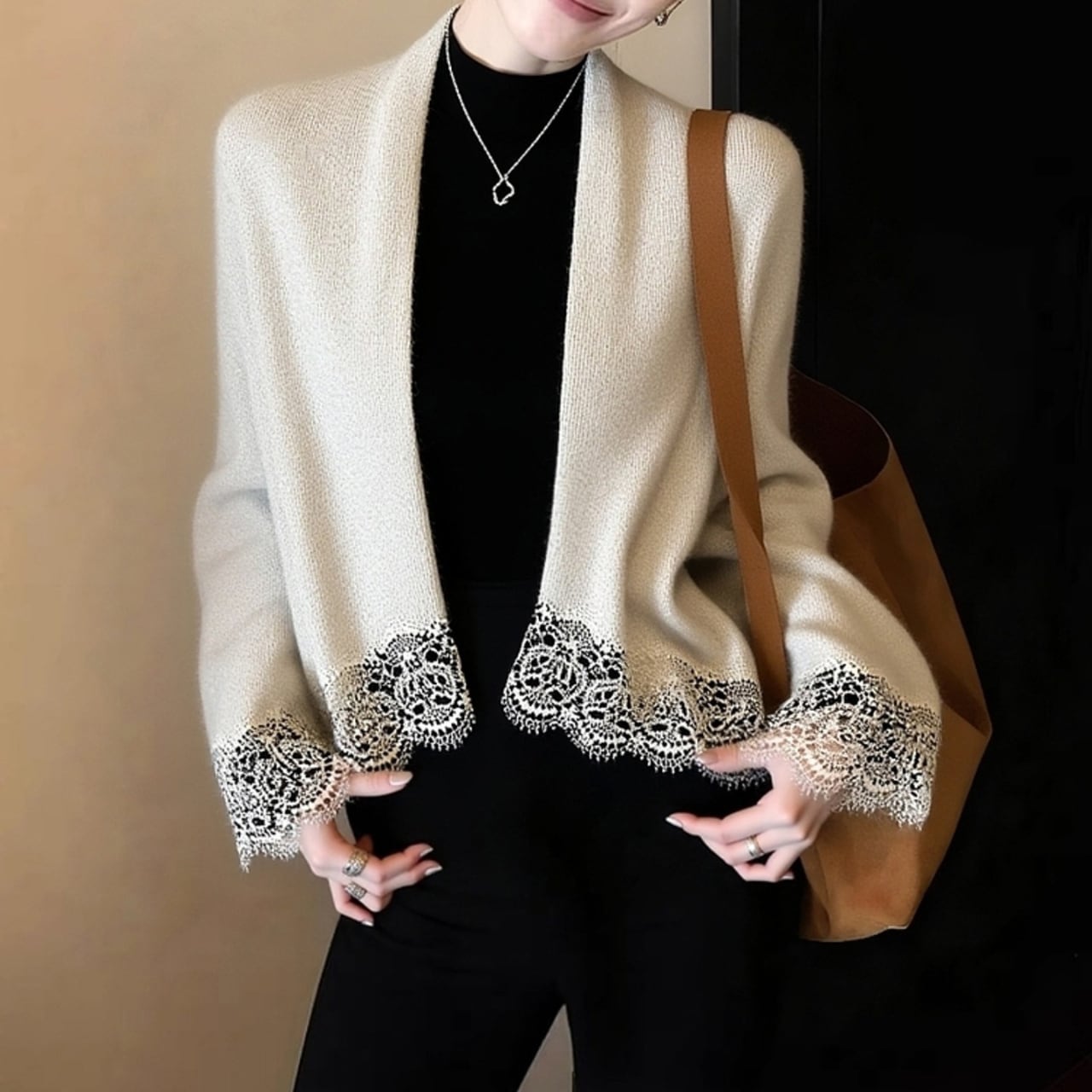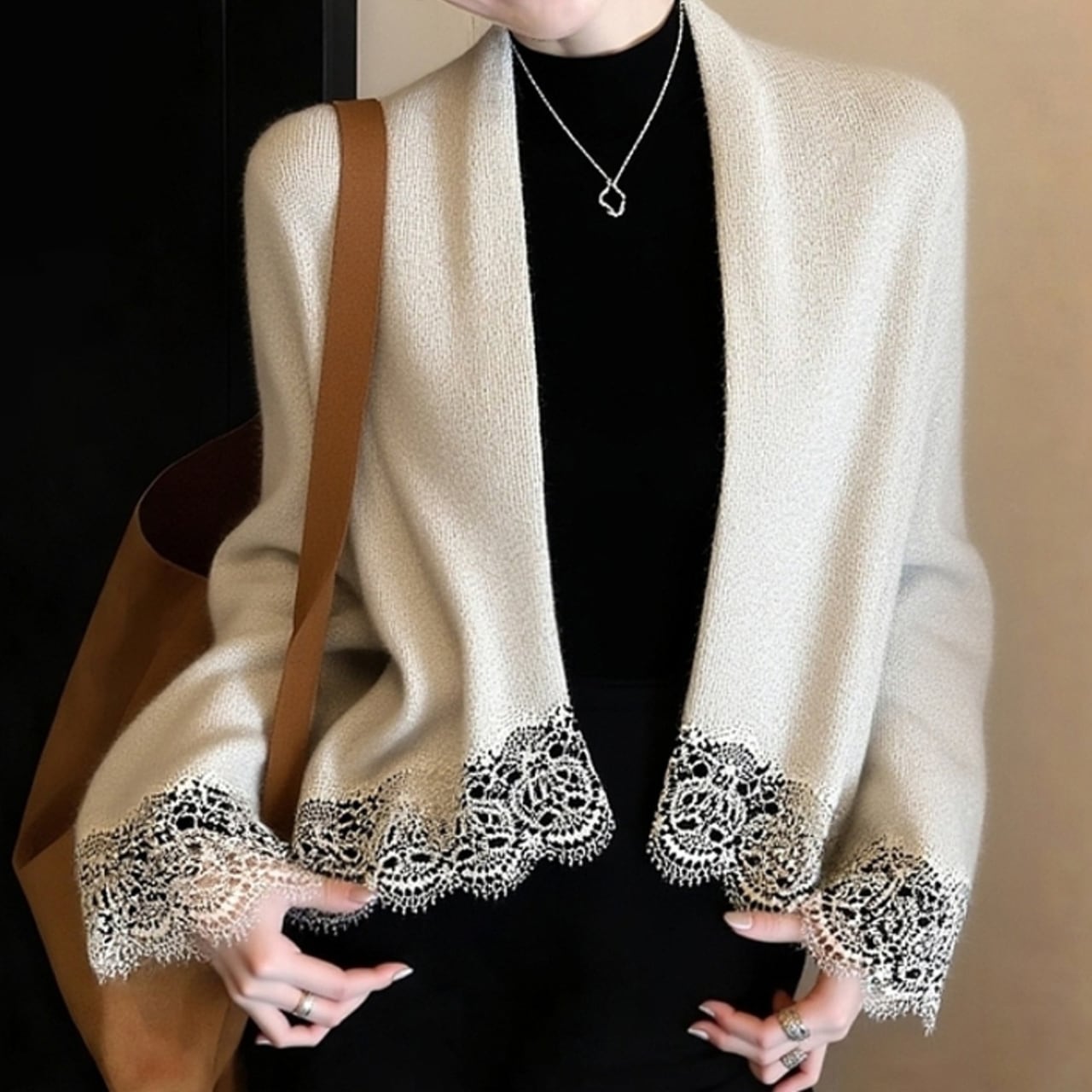 裾と袖口に施されたレースディテールが、シンプルなコーディネートに程よい華やかさをプラス。インナーにはタートルネックやカットソーを合わせるだけで、洗練された大人スタイルが完成します。