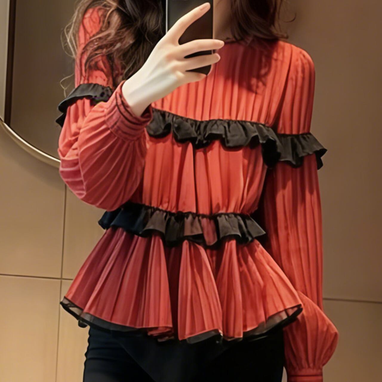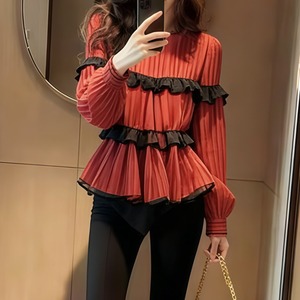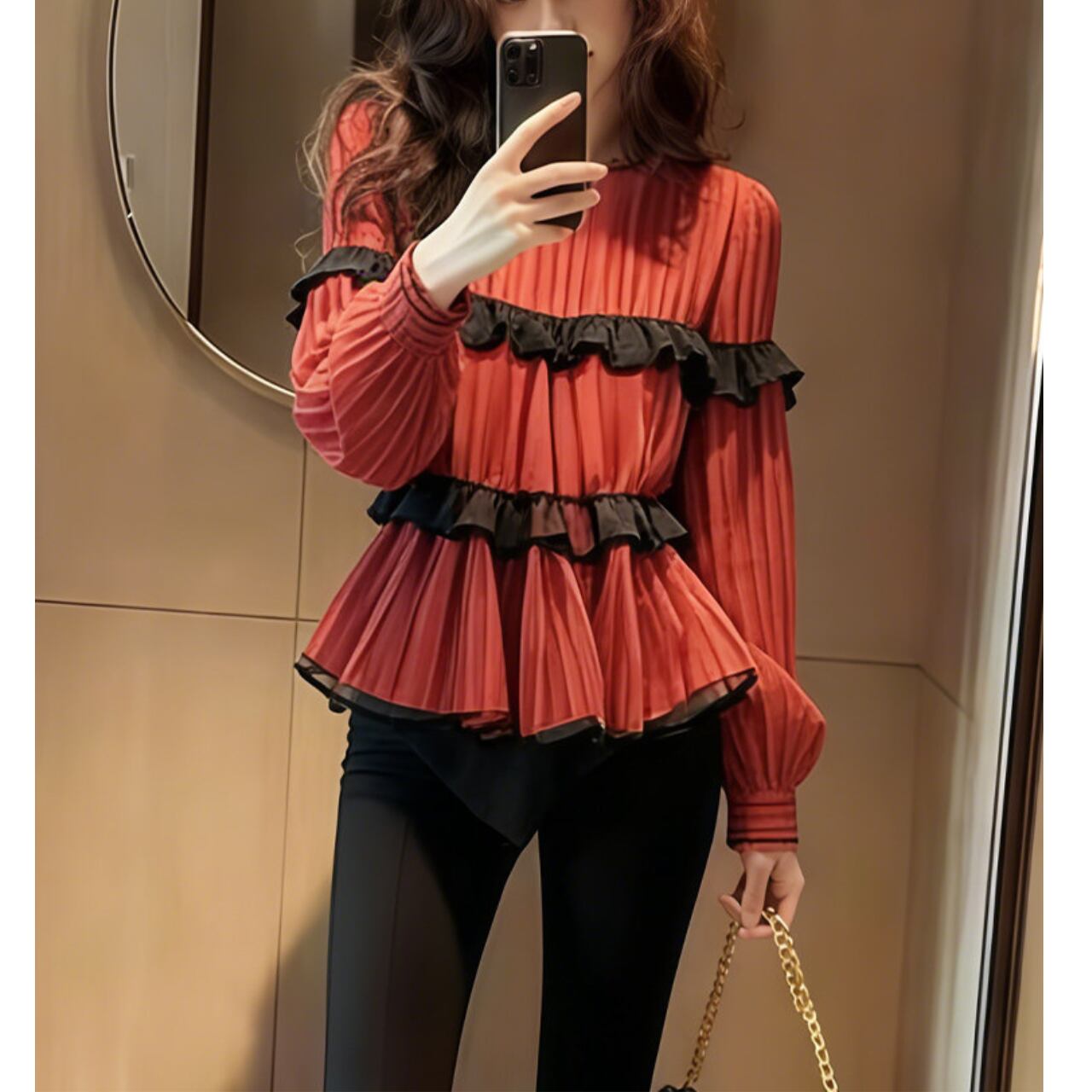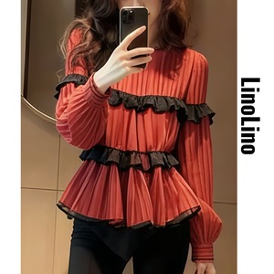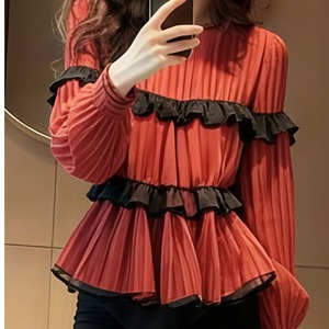 縦プリーツの入った生地に、ブラックのフリルラインを効かせたデザインブラウスです。