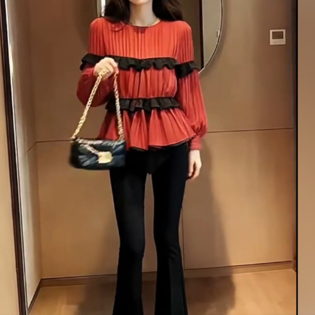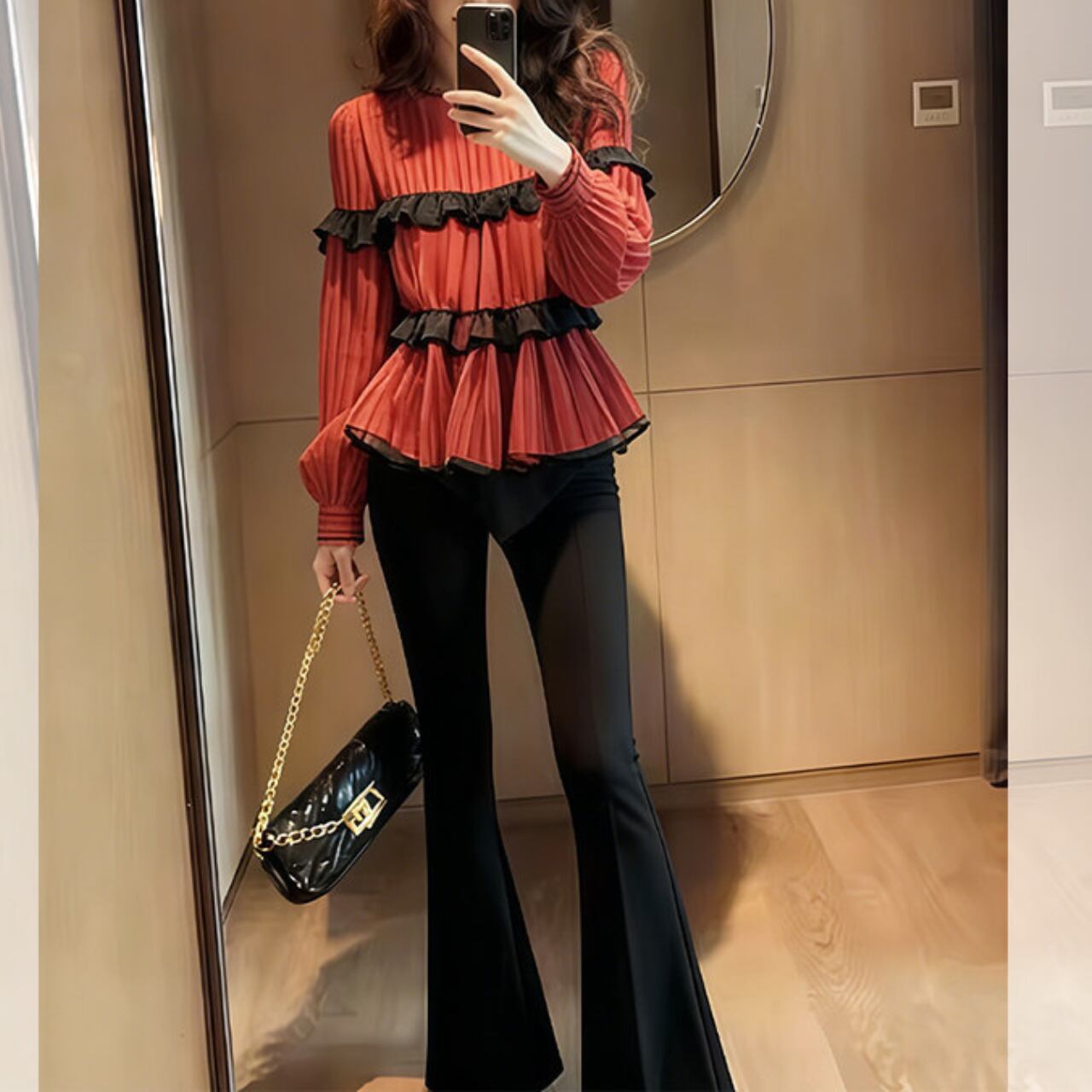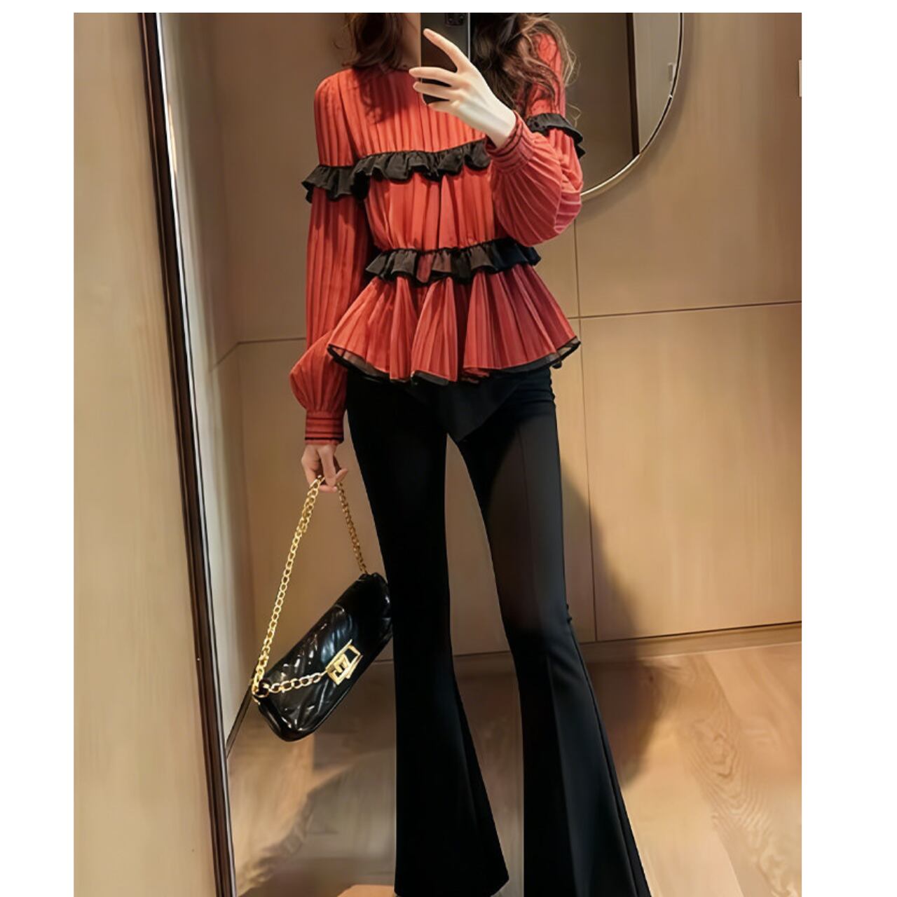 縦プリーツの入った生地に、ブラックのフリルラインを効かせたデザインブラウスです。