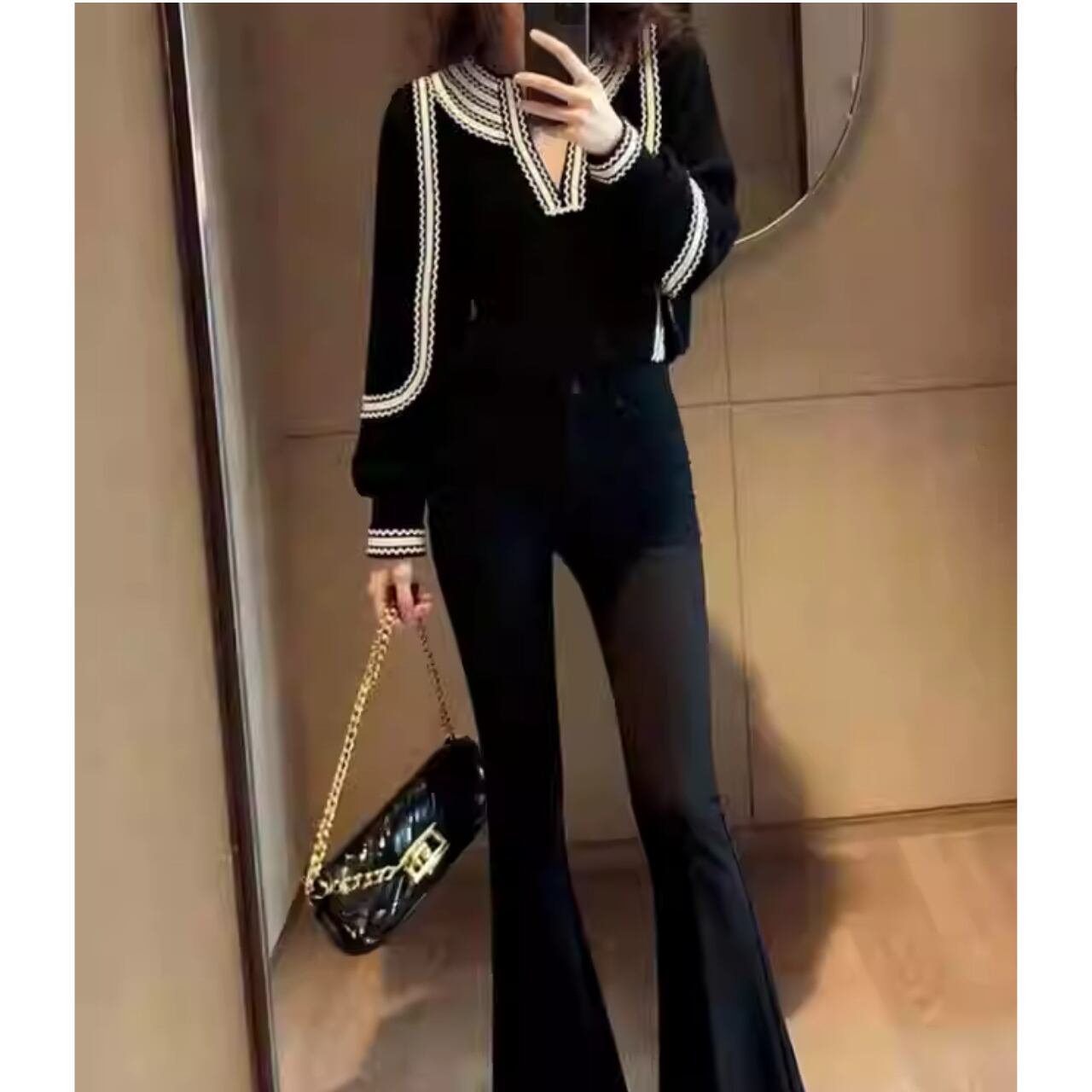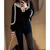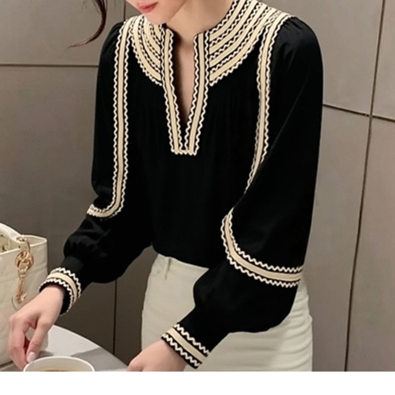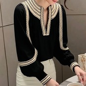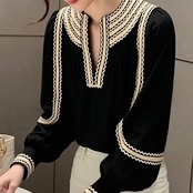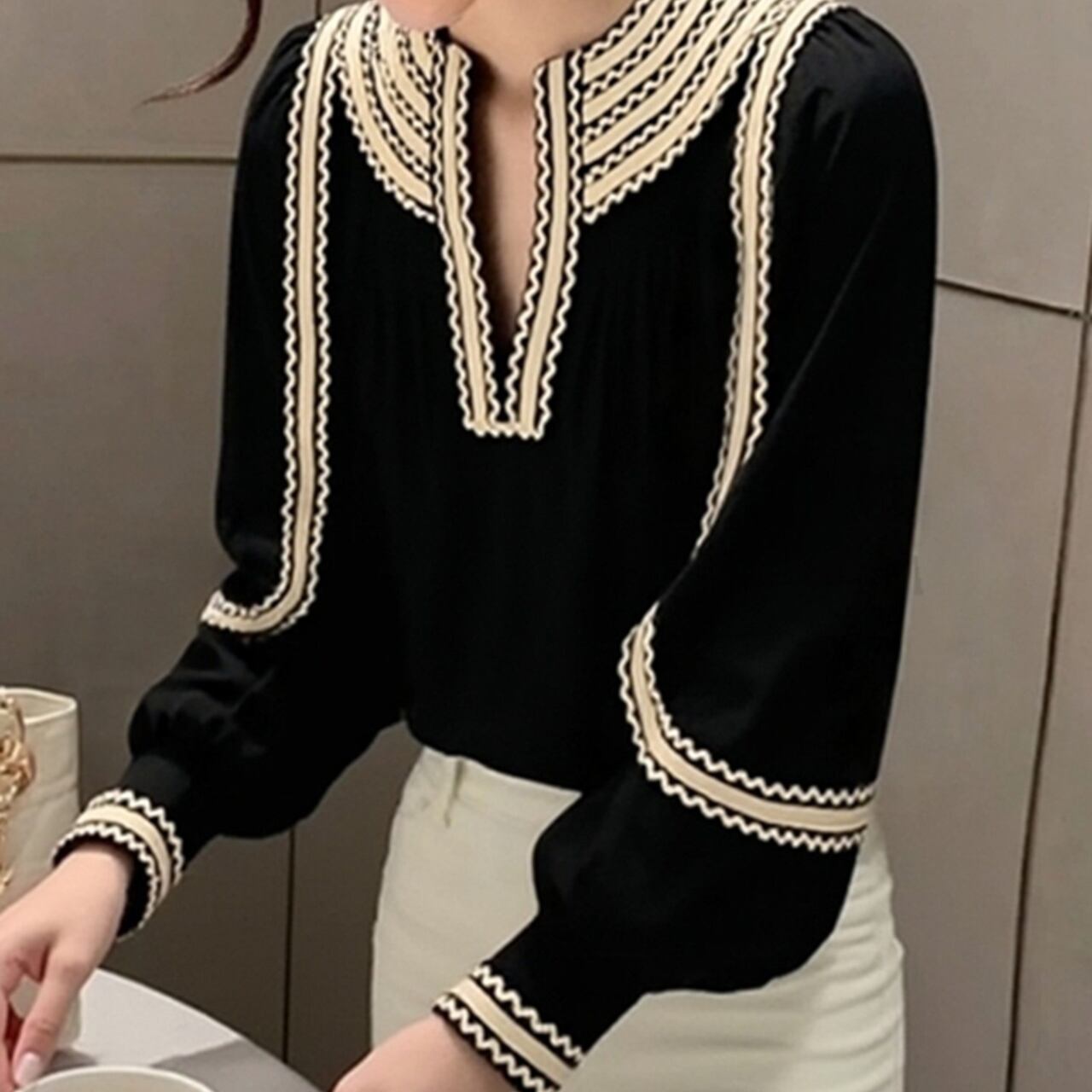 Long Sleeve V-Neck Lace Trim Blouse L00751