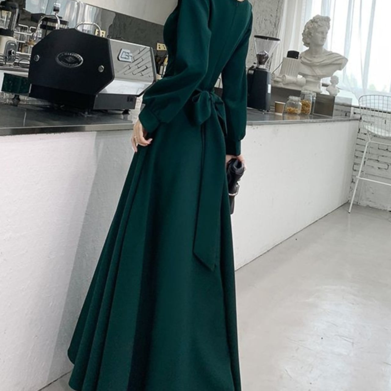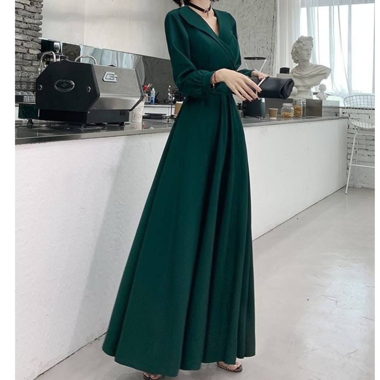 上品なAラインシルエットが魅力的なロングワンピース。