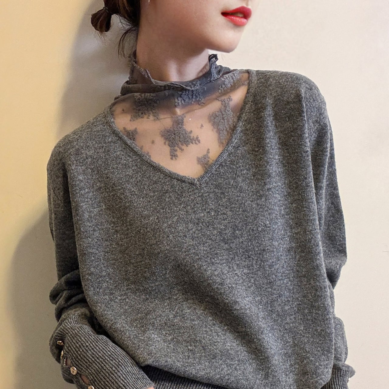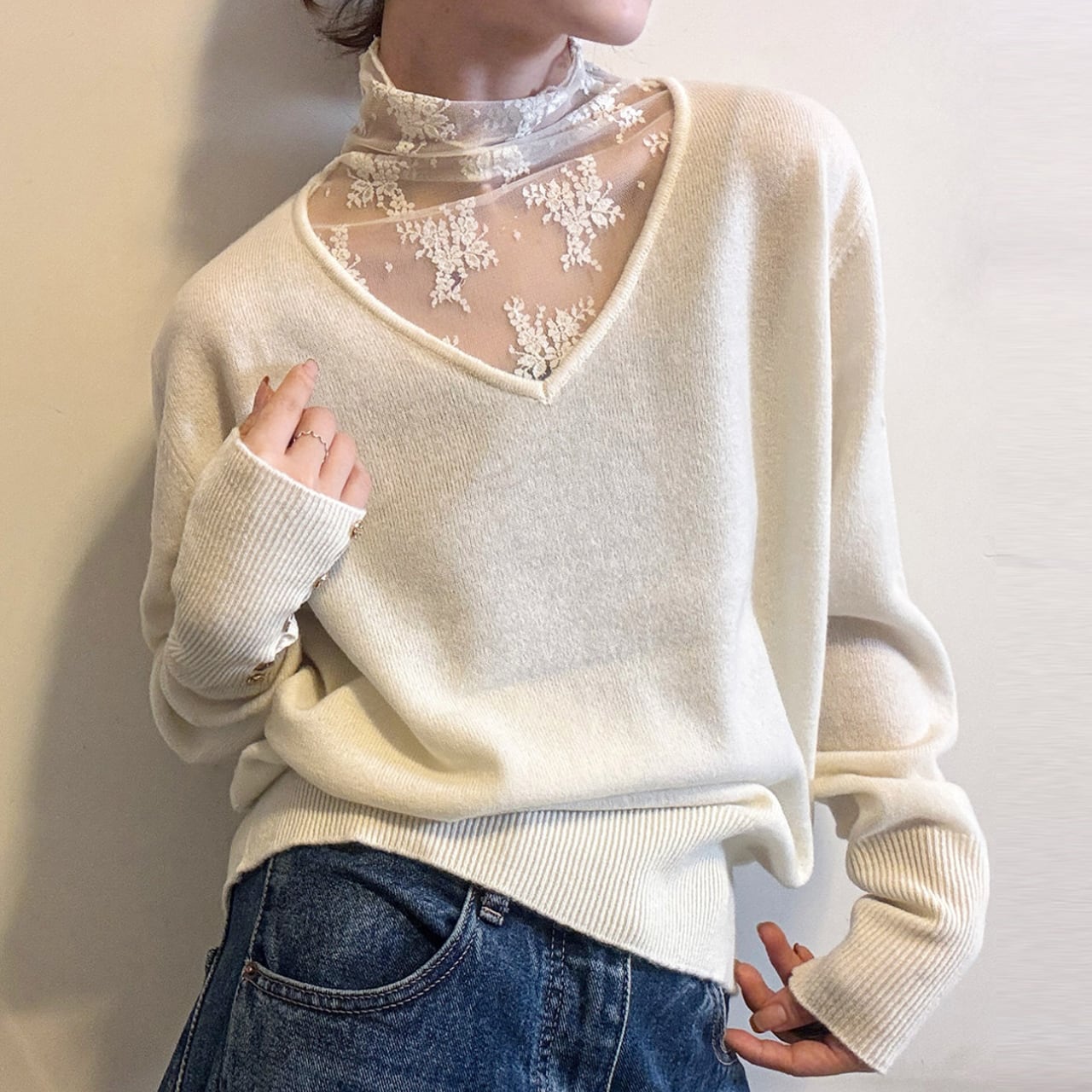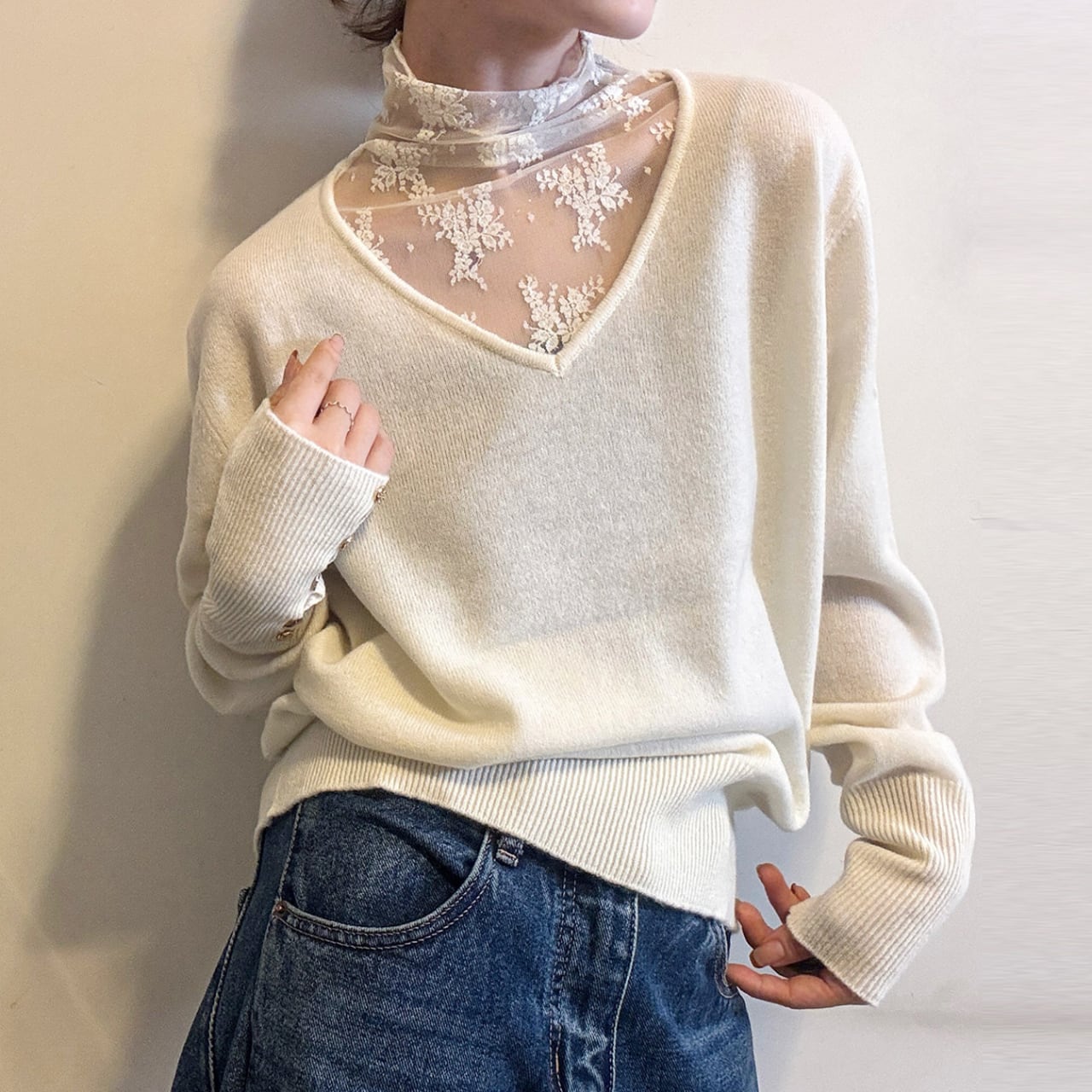 デコルテを美しく見せるVネックに、繊細なレースが上品な印象を与えます。