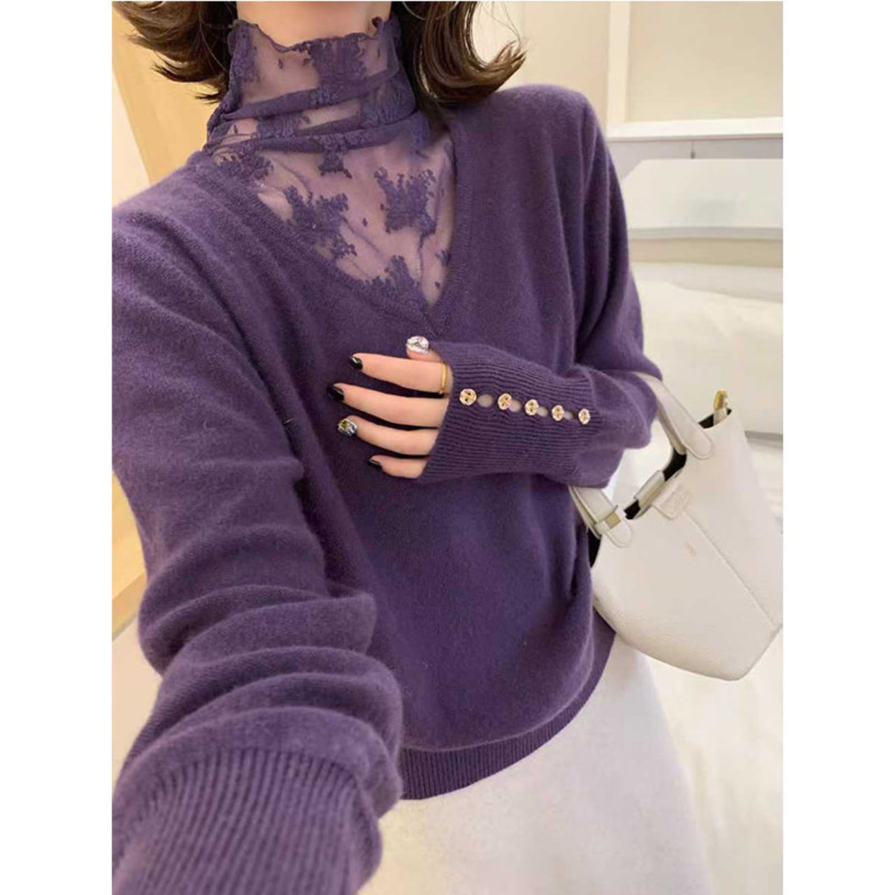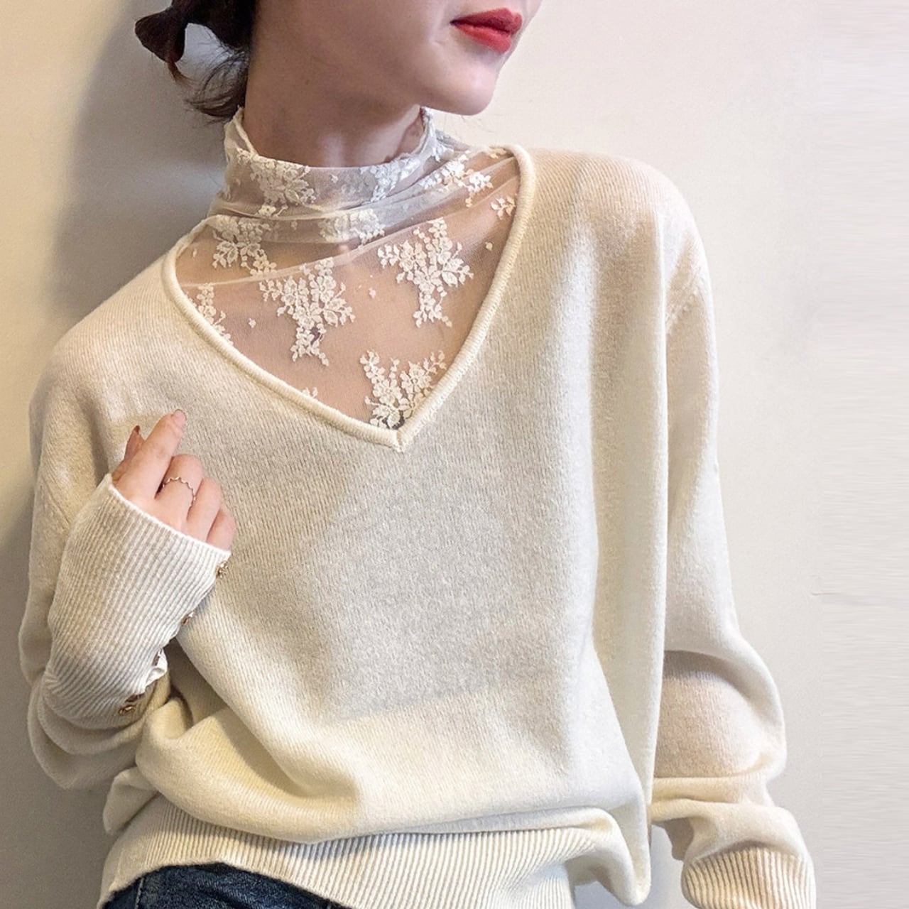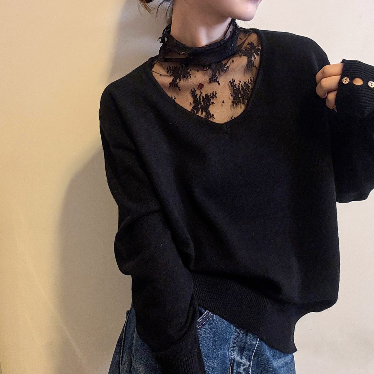 long-sleeve V-neck lace switch knit pullover L00765