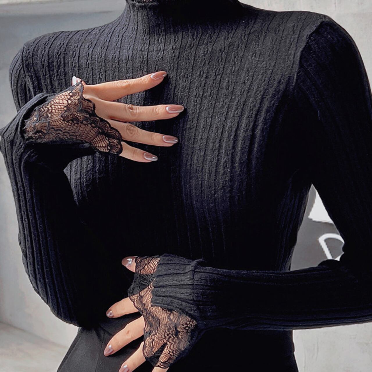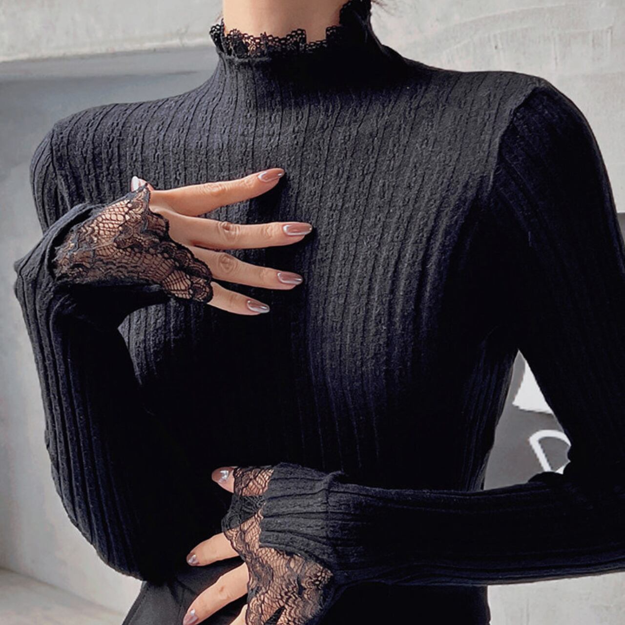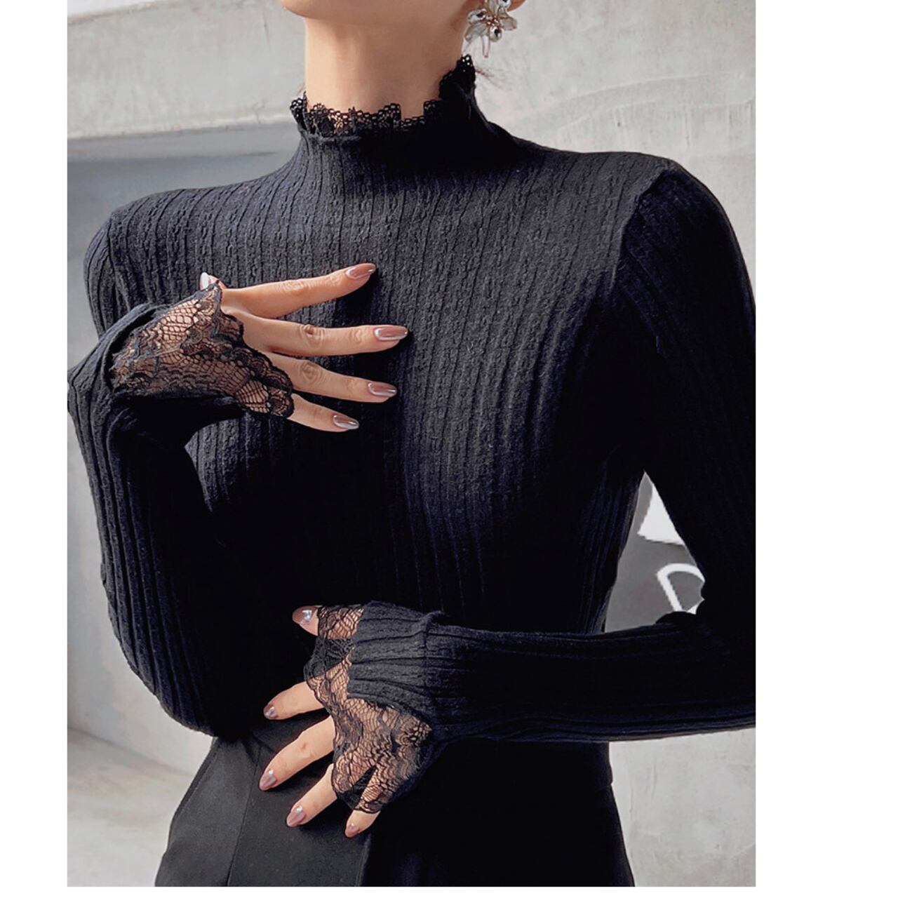 首元のレースがポイントのリブニットは、上品で女性らしい印象を与えます。