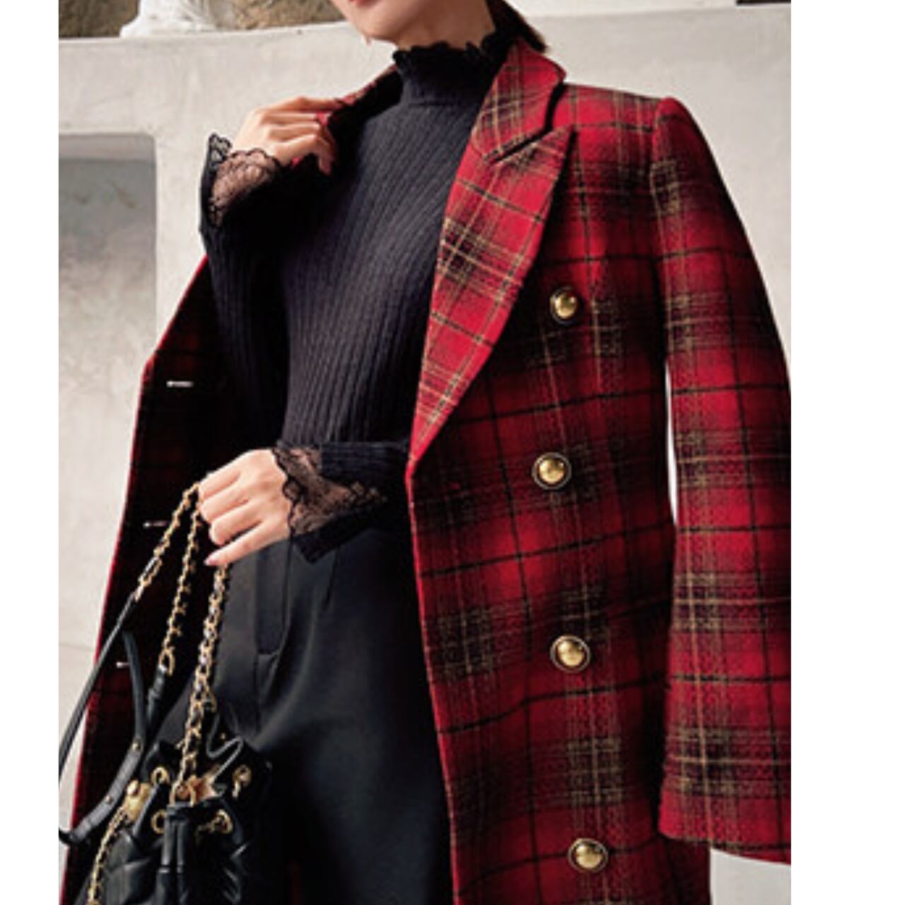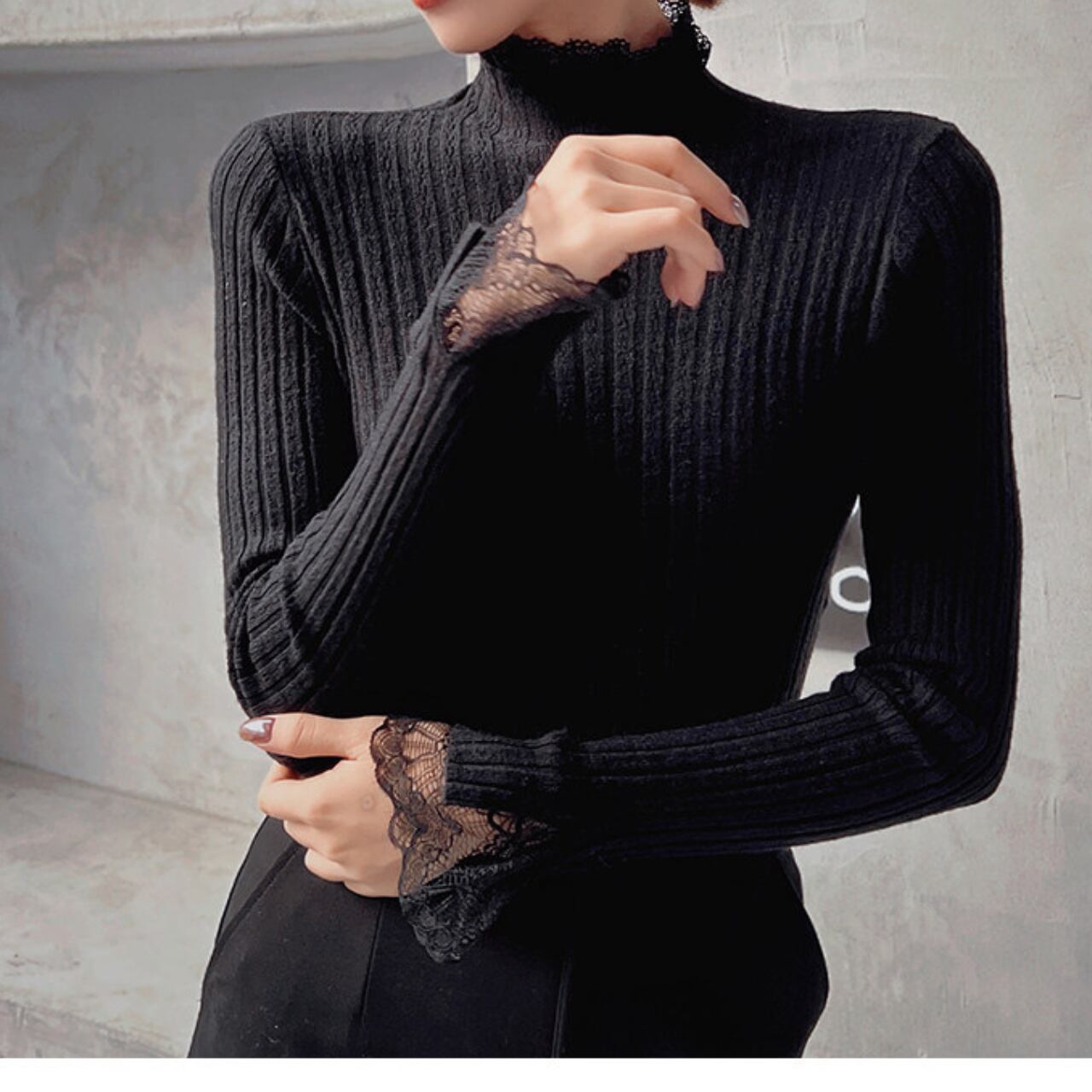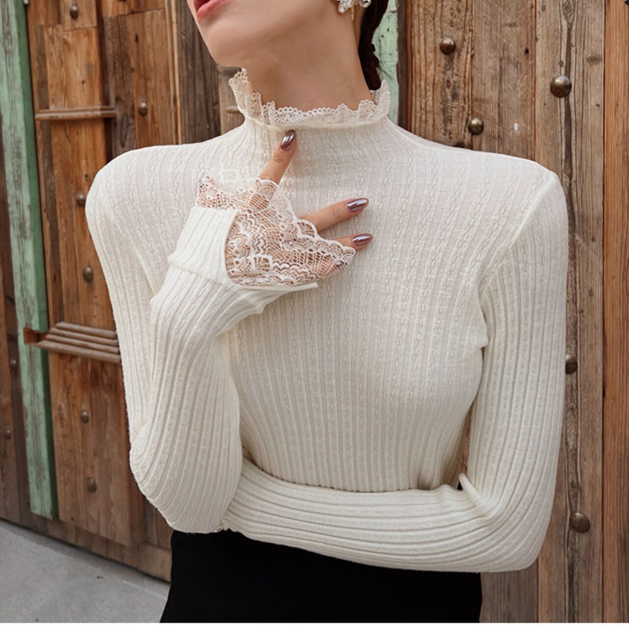 首元のレースがポイントのリブニットは、上品で女性らしい印象を与えます。