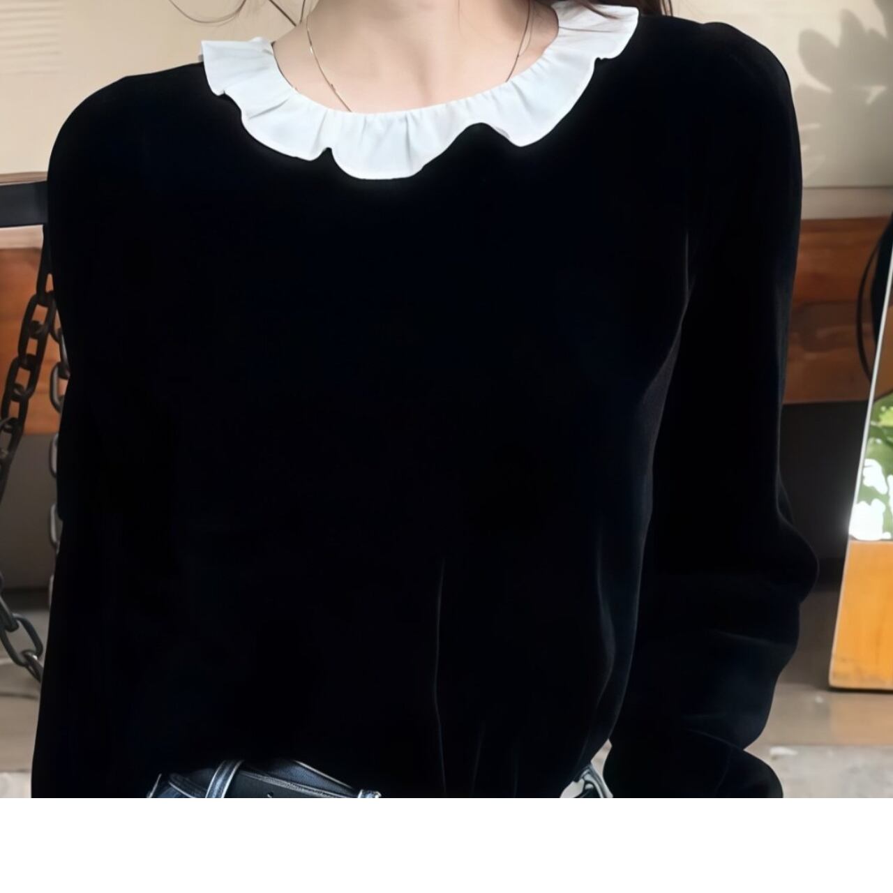 フリルネックが顔まわりを華やかに演出し、好印象を与えます。