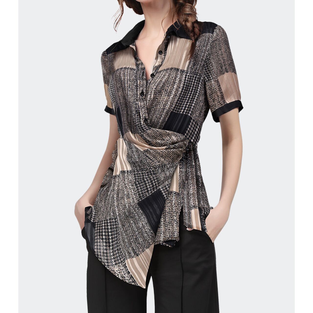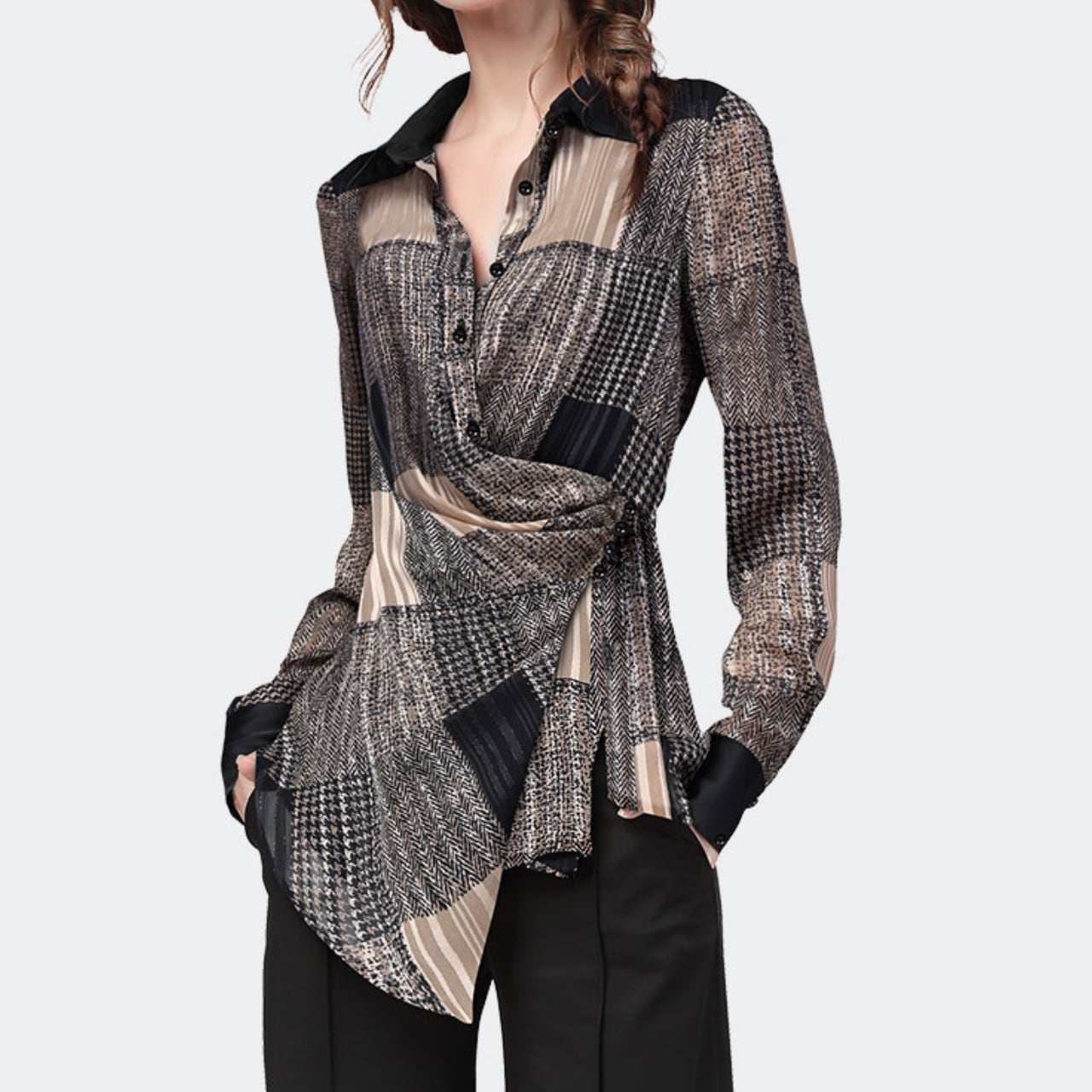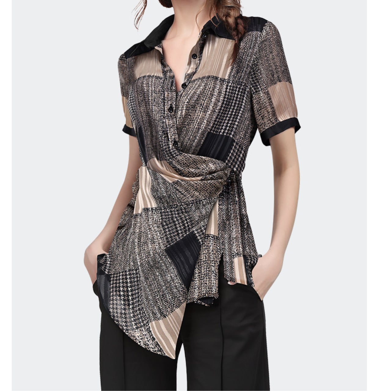 ・大人の女性らしさを引き立てる、ラップスタイルのブラウス。