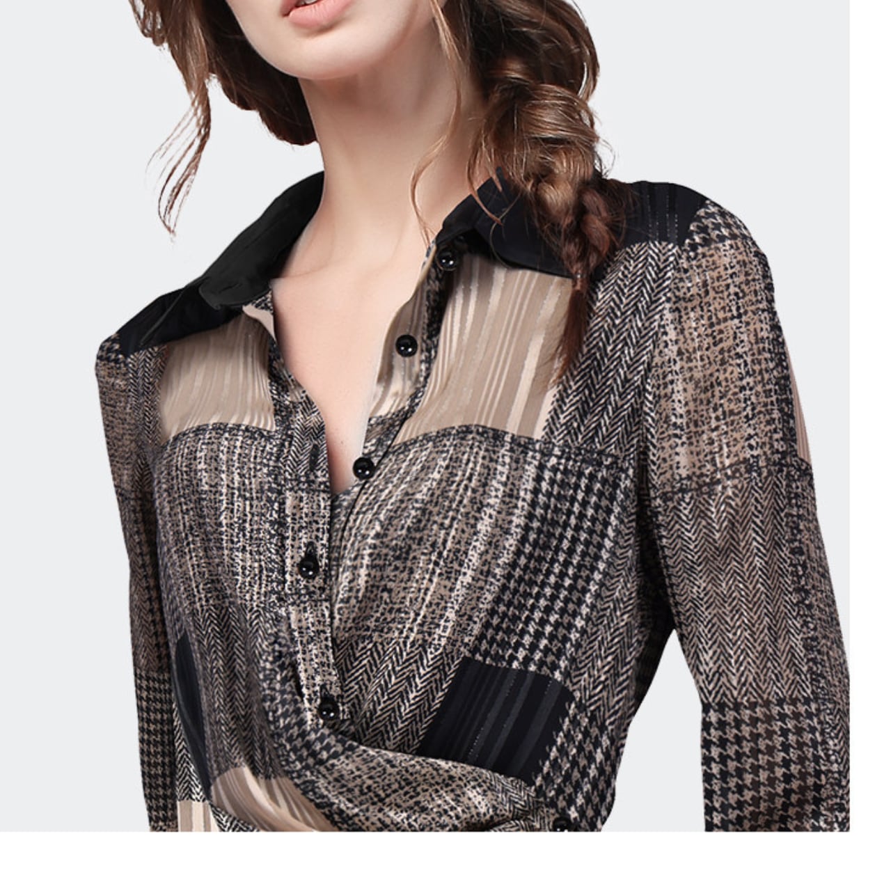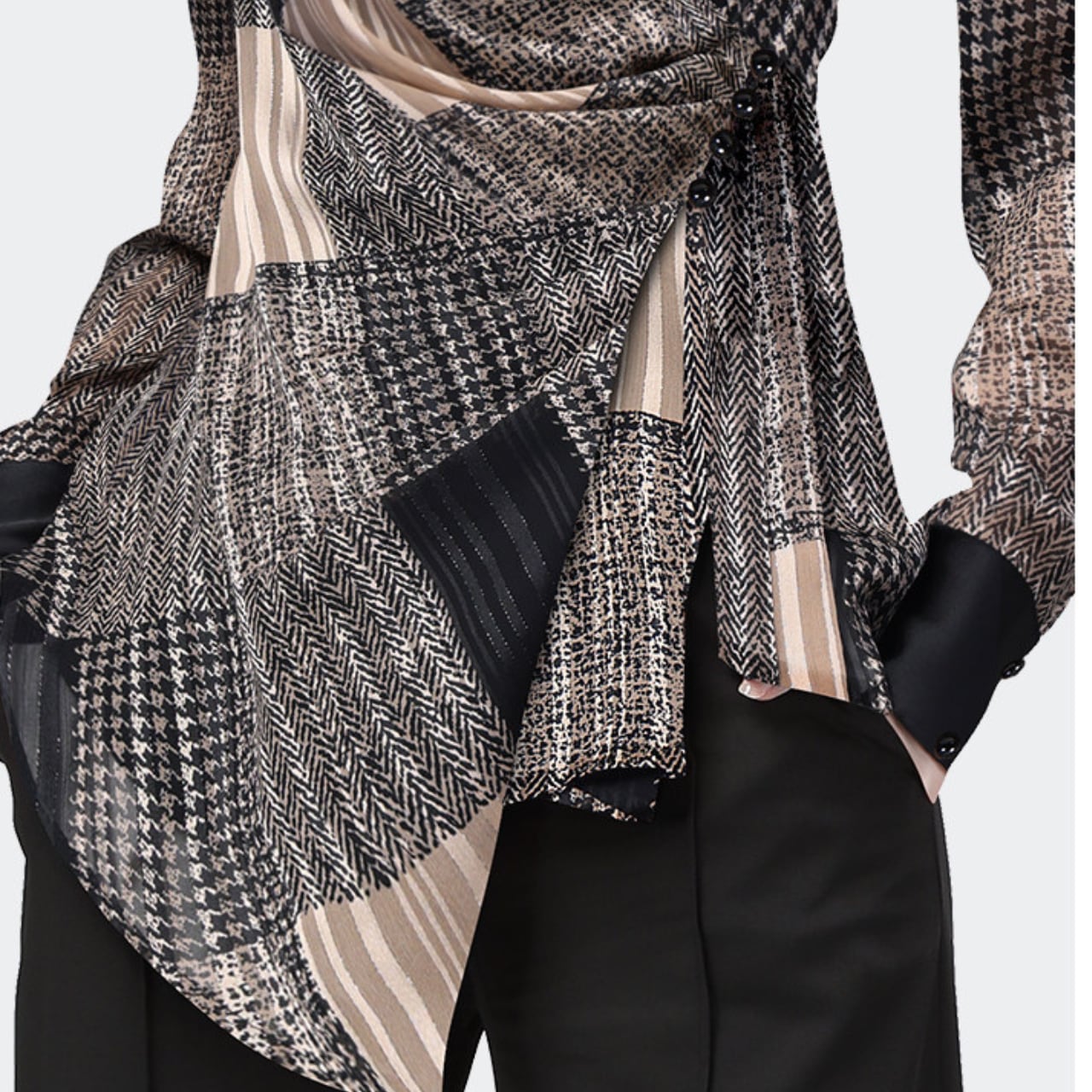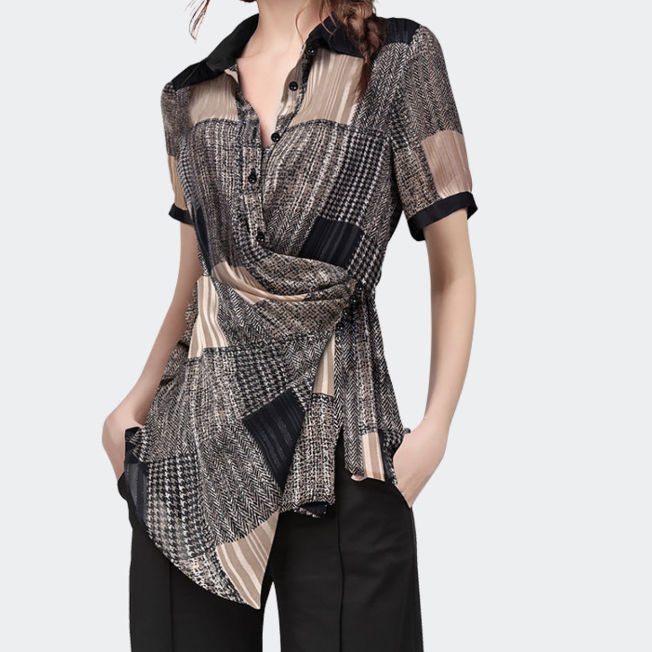 ・大人の女性らしさを引き立てる、ラップスタイルのブラウス。
