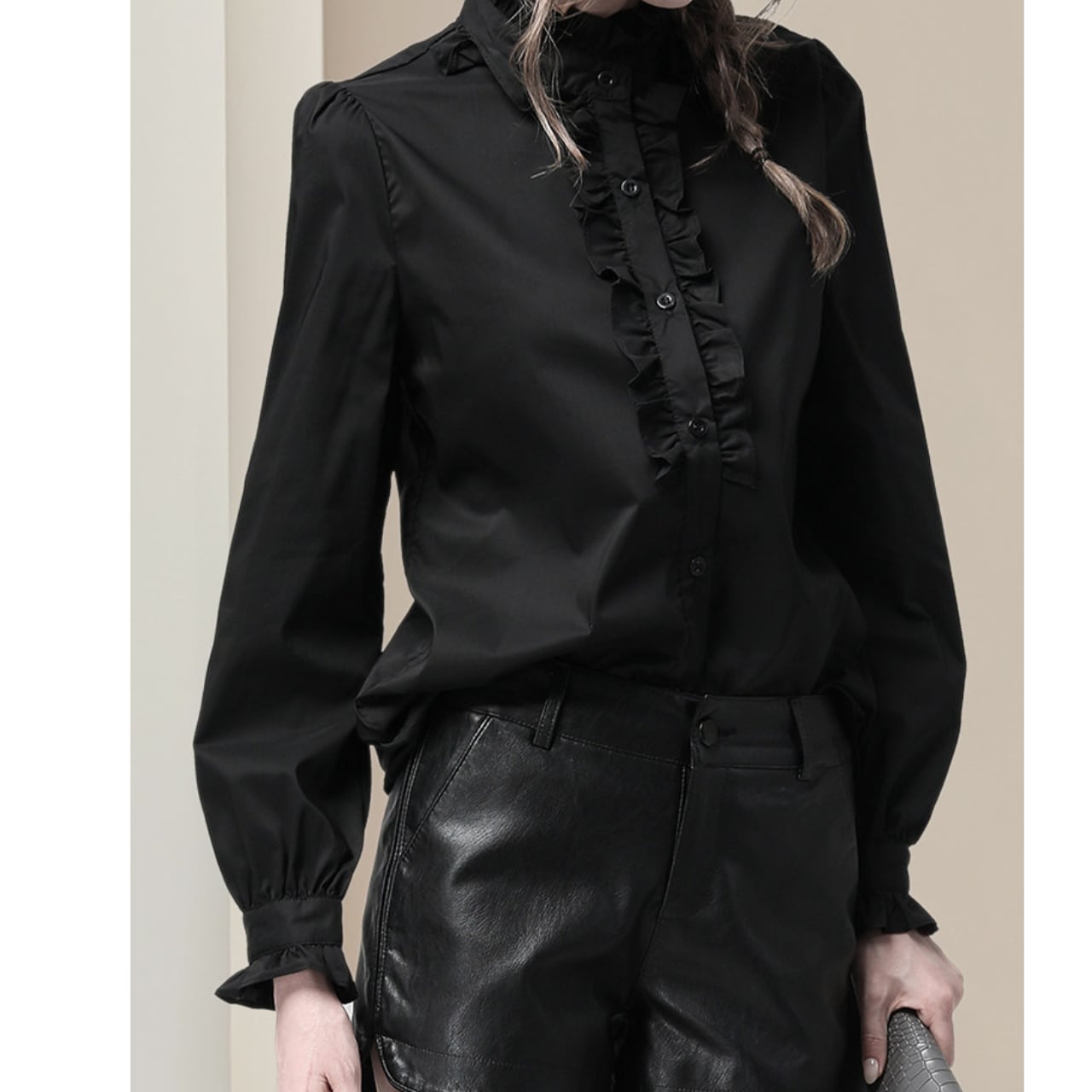 ・首元から胸元にかけてあしらわれたフリルが、顔周りを明るく、そして華やかに演出。オフィススタイルにはもちろん、パーティーシーンにもおすすめです。