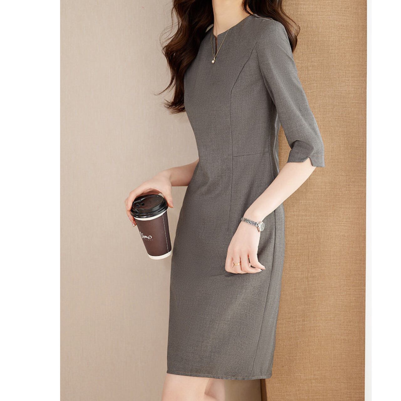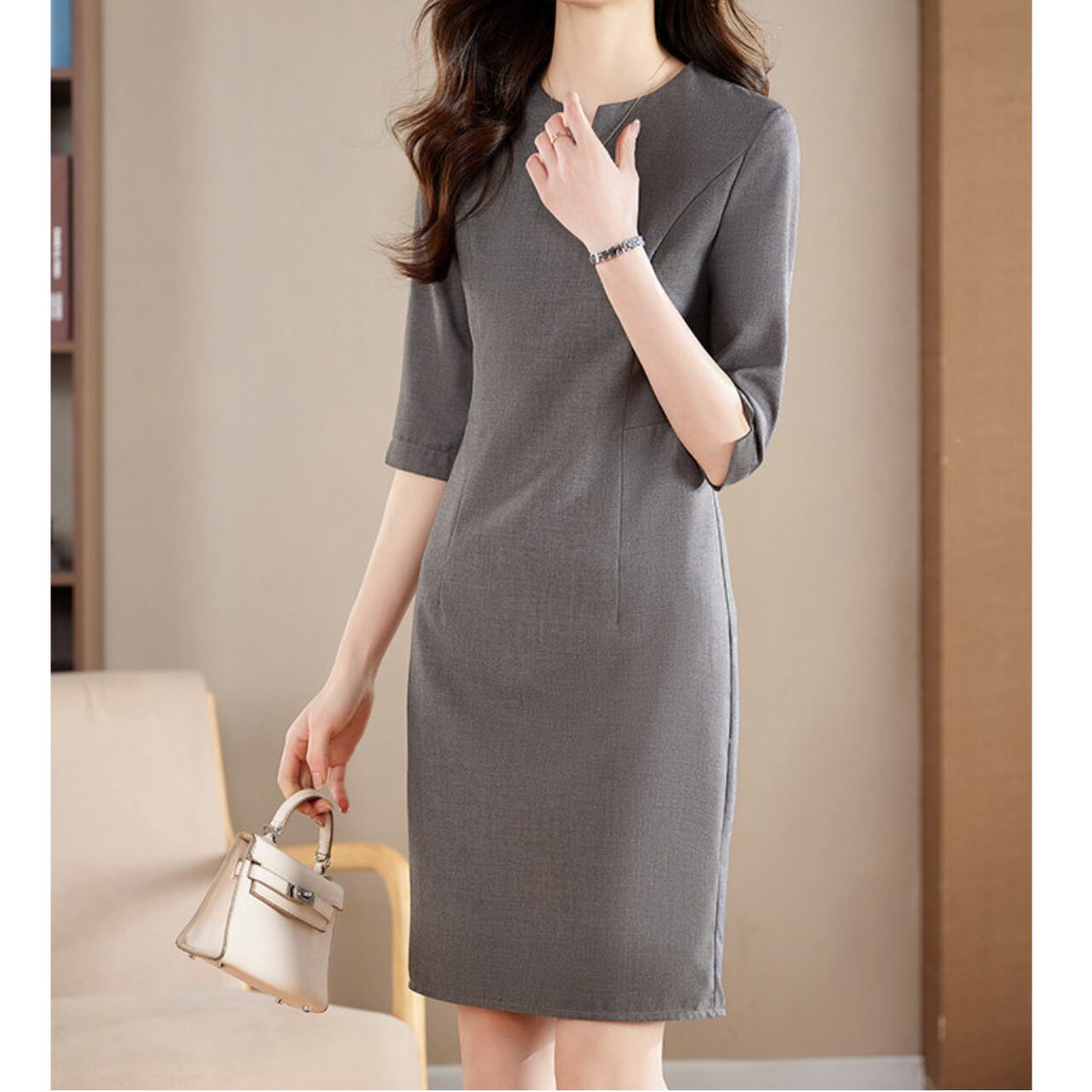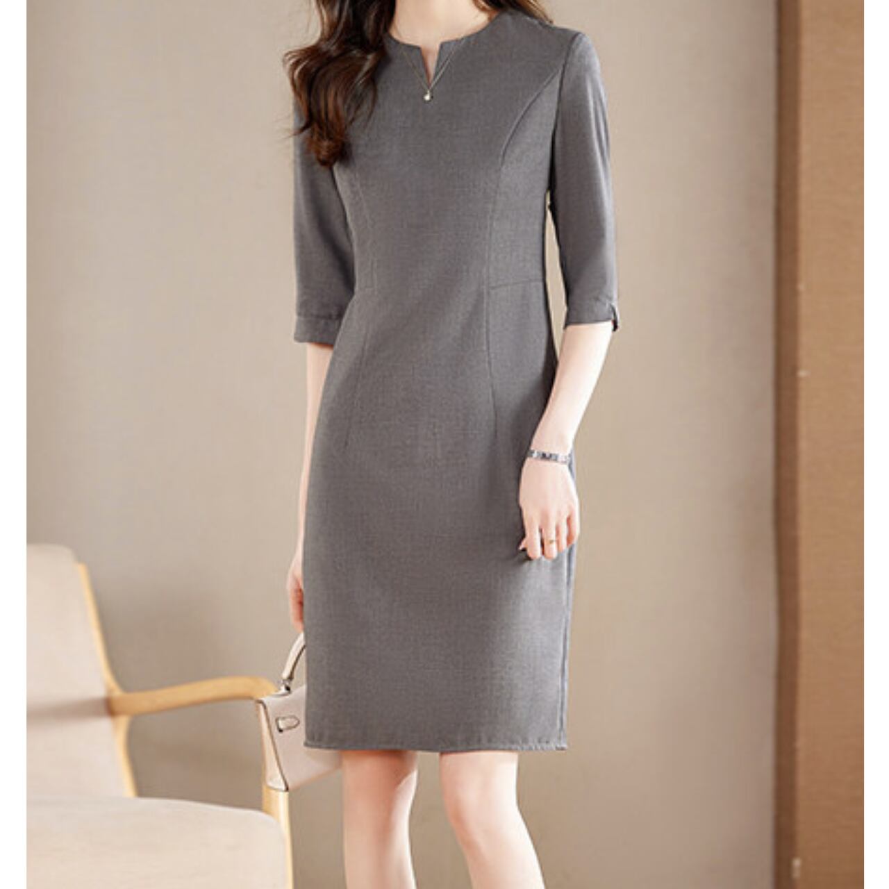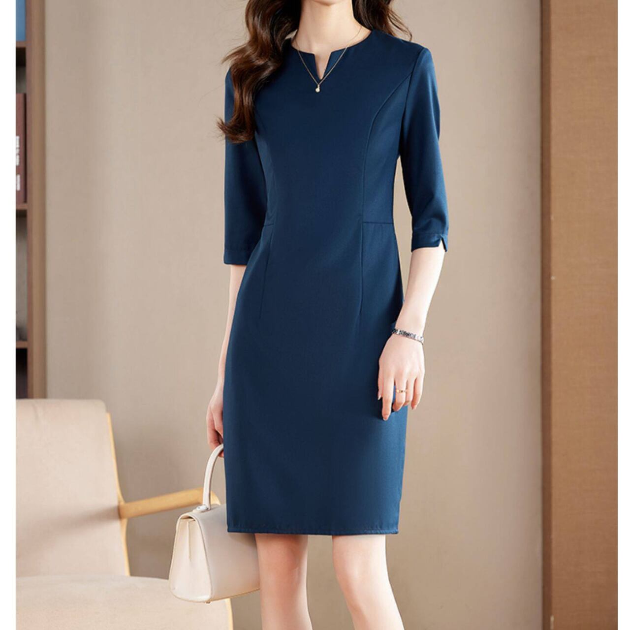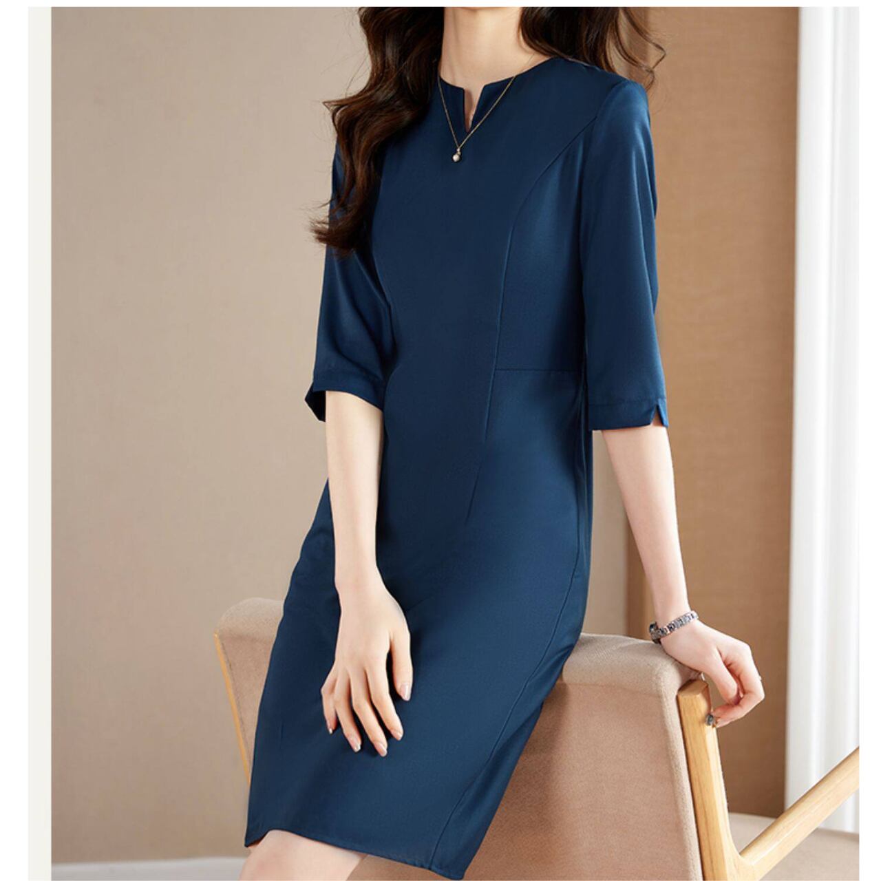 Three-Quarter Sleeve Midi Length Slit Neck Onepierce L00827
