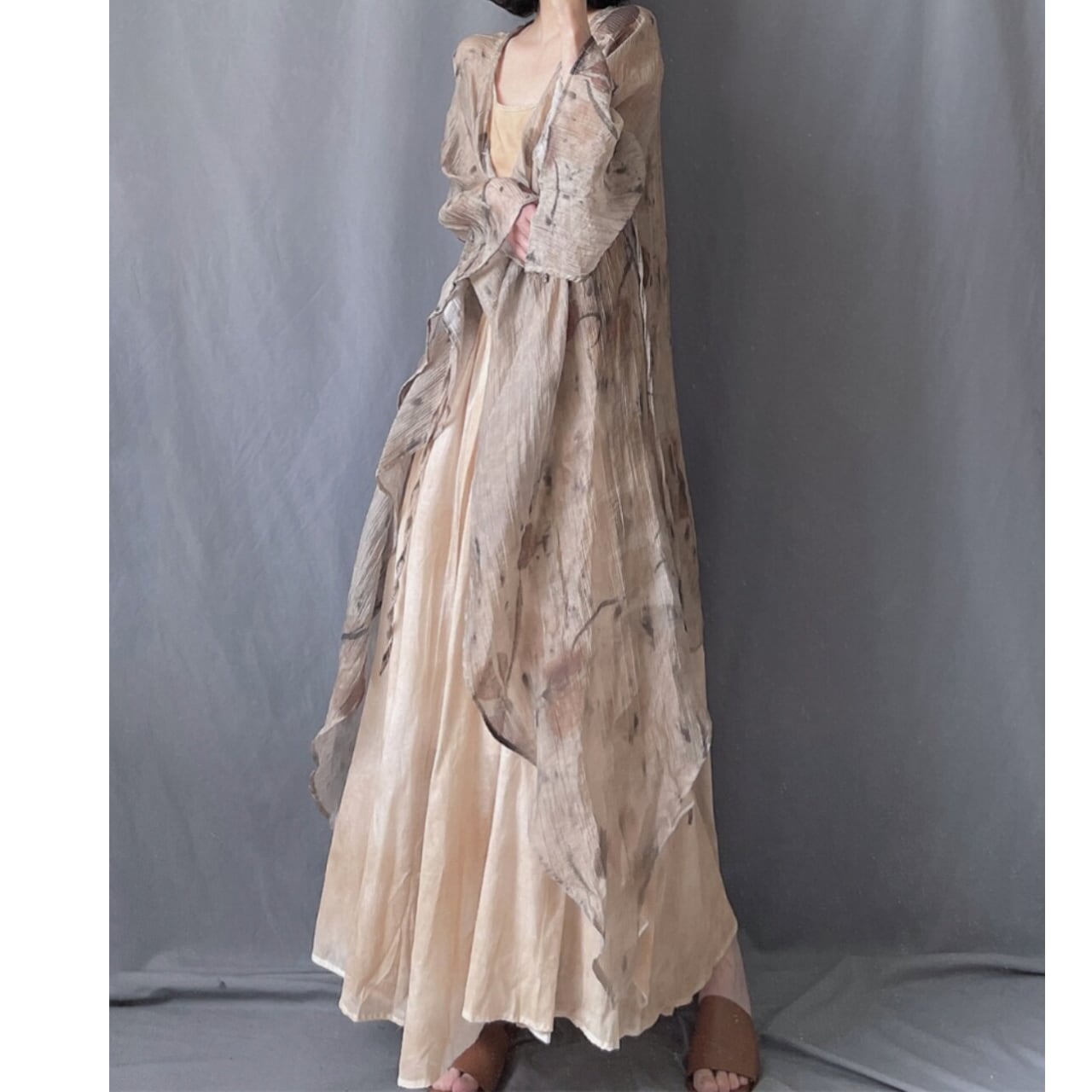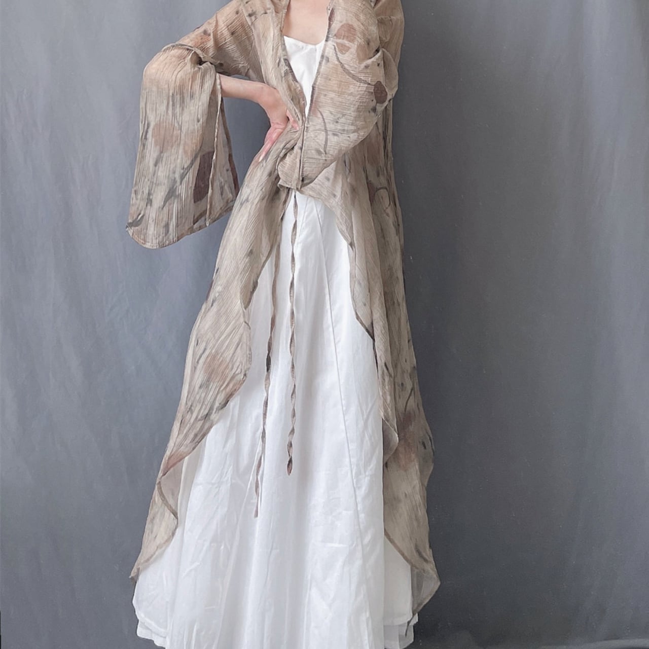 ・軽やかな透け感と、落ち着いたフラワー柄が印象的なロングカーディガン。