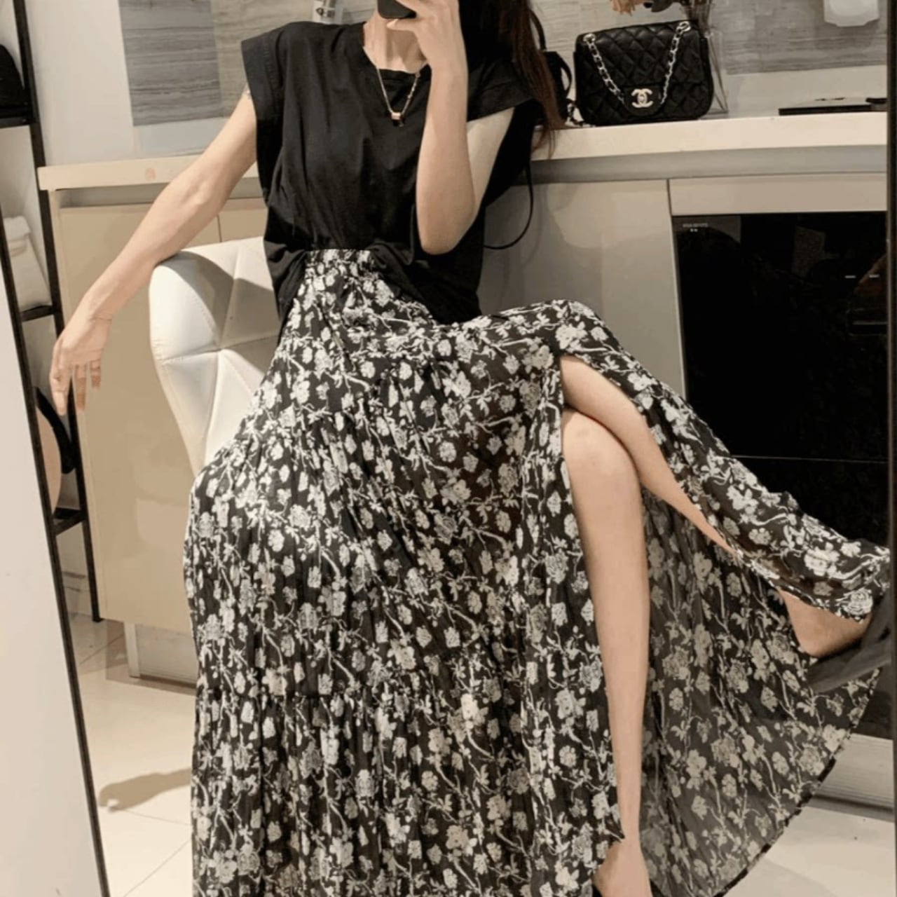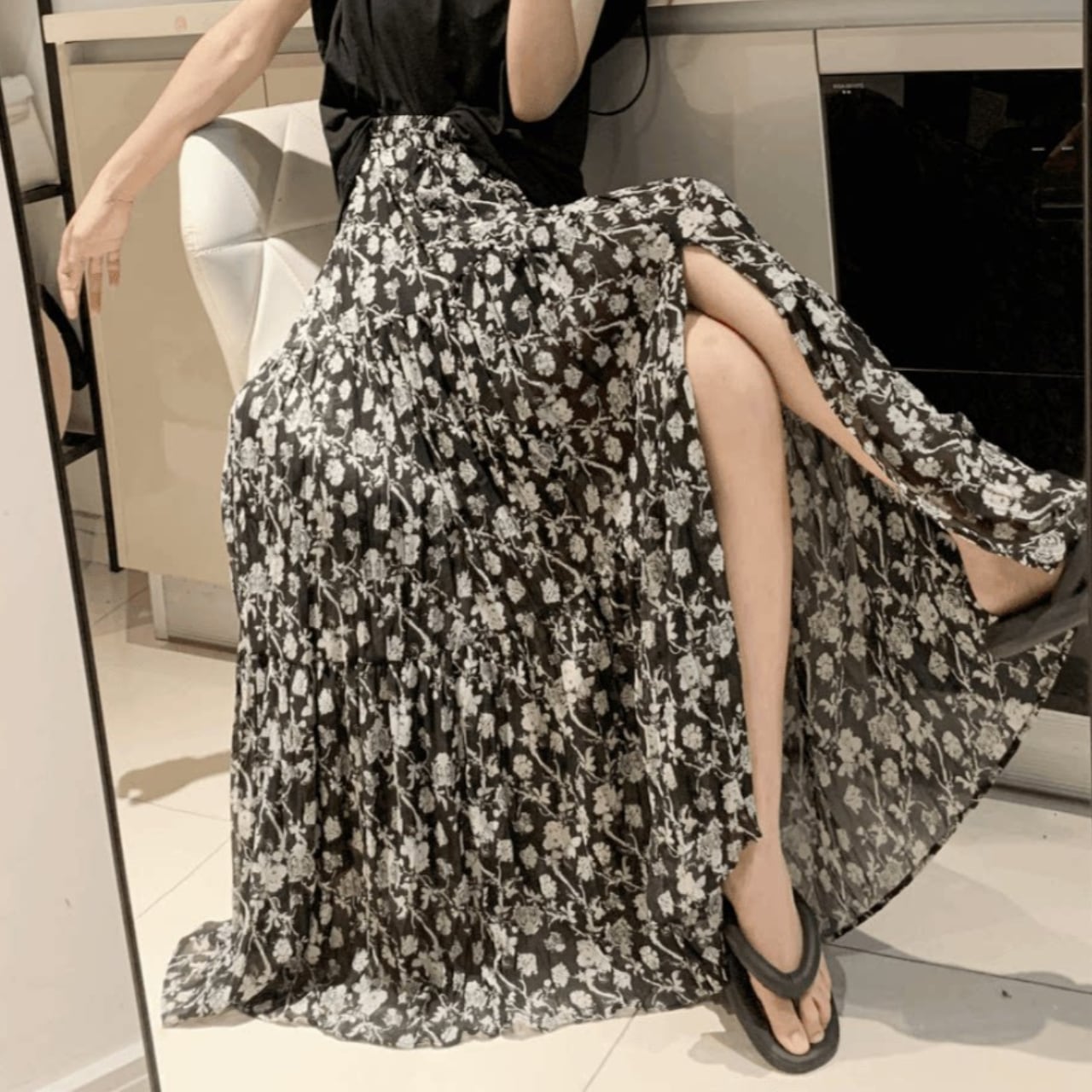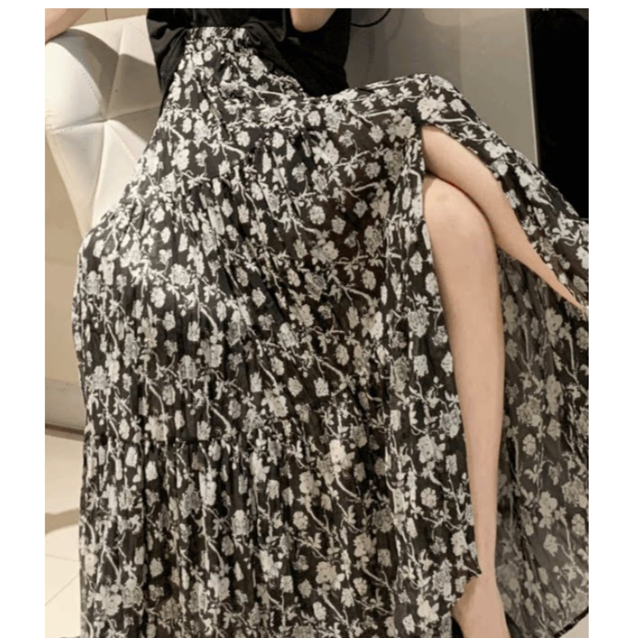 ・繊細なフラワープリントが目を引く、エレガントなロングスカートです。