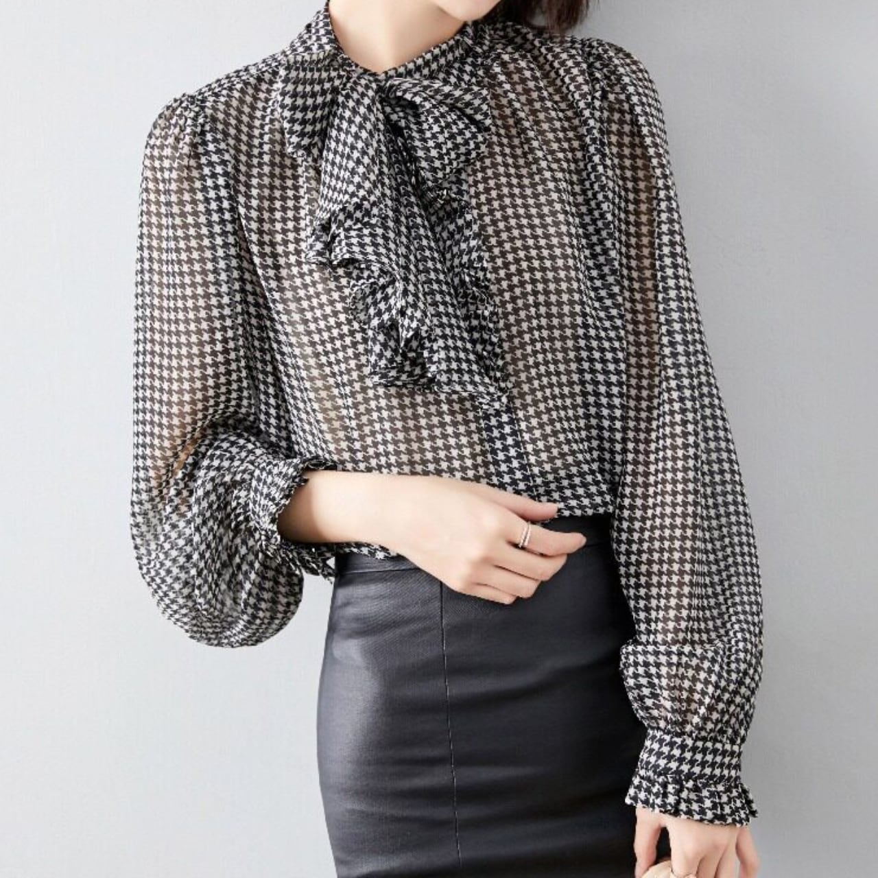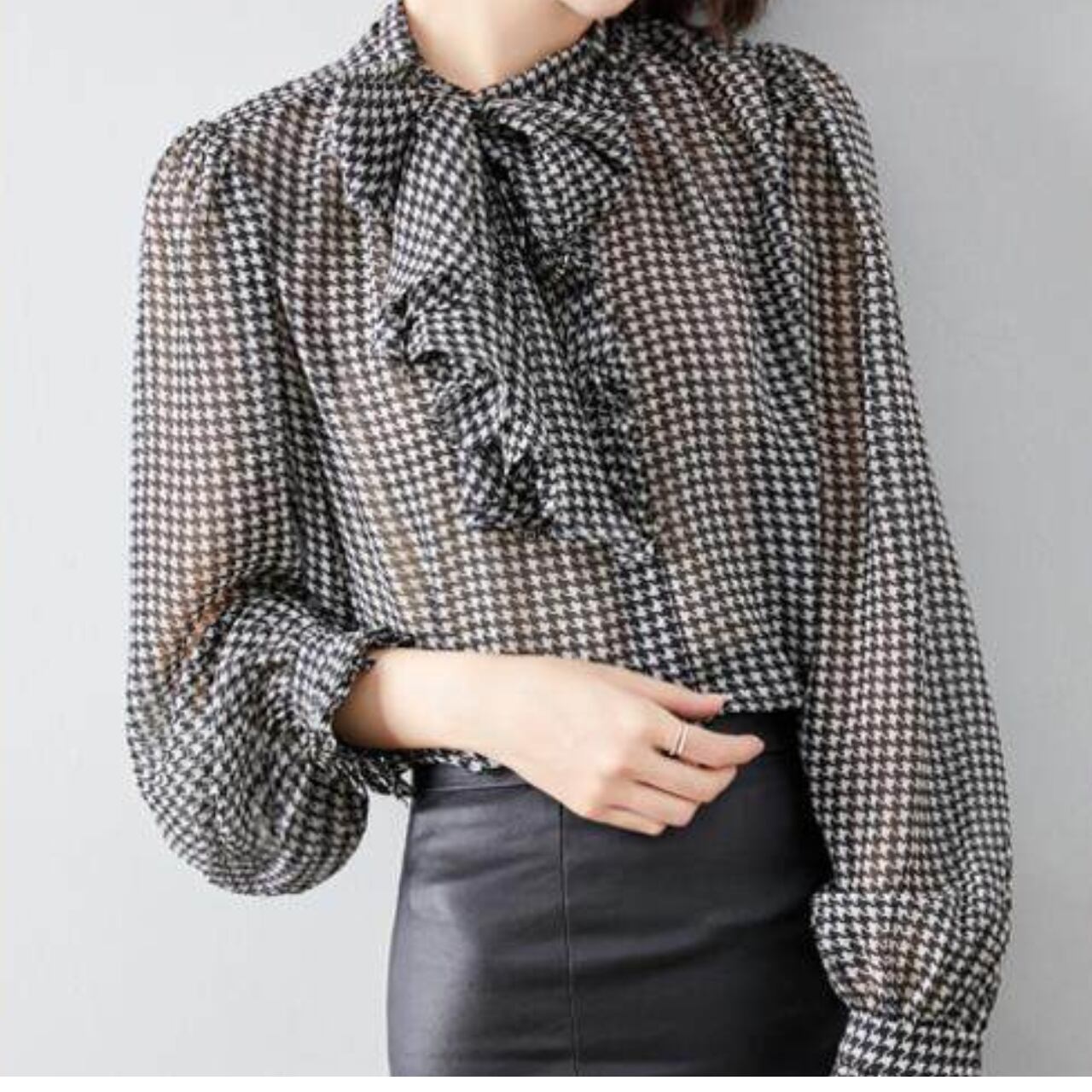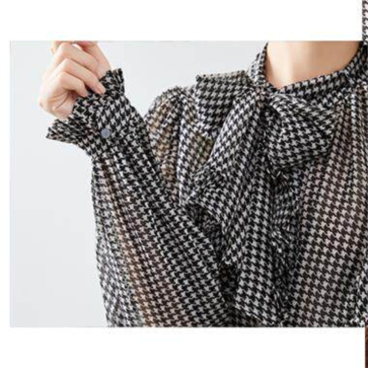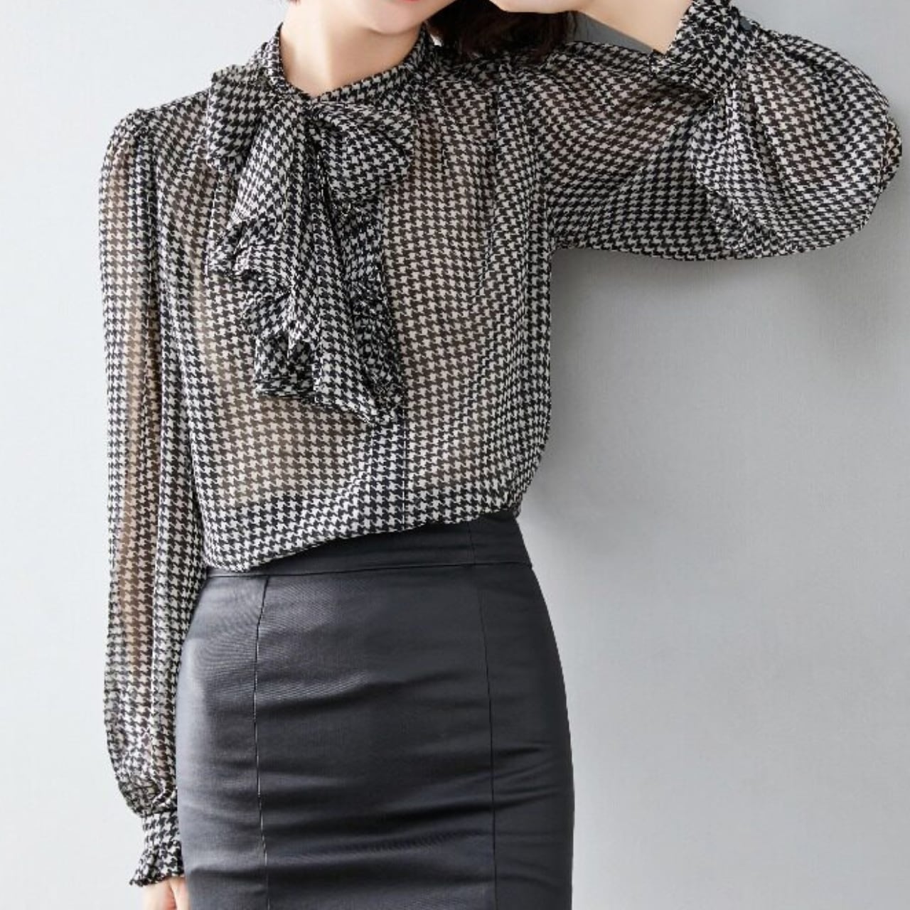 Bow Tie Long Sleeve Houndstooth Blouse L00850
