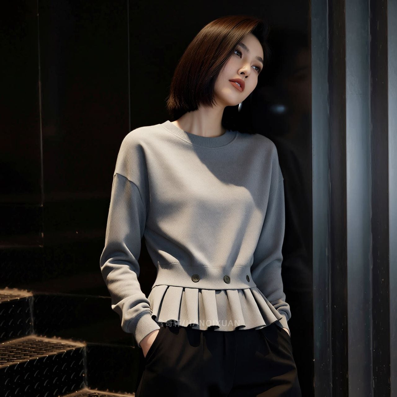・シンプルなトップスに、ウエスト部分のペプラムデザインをプラスした