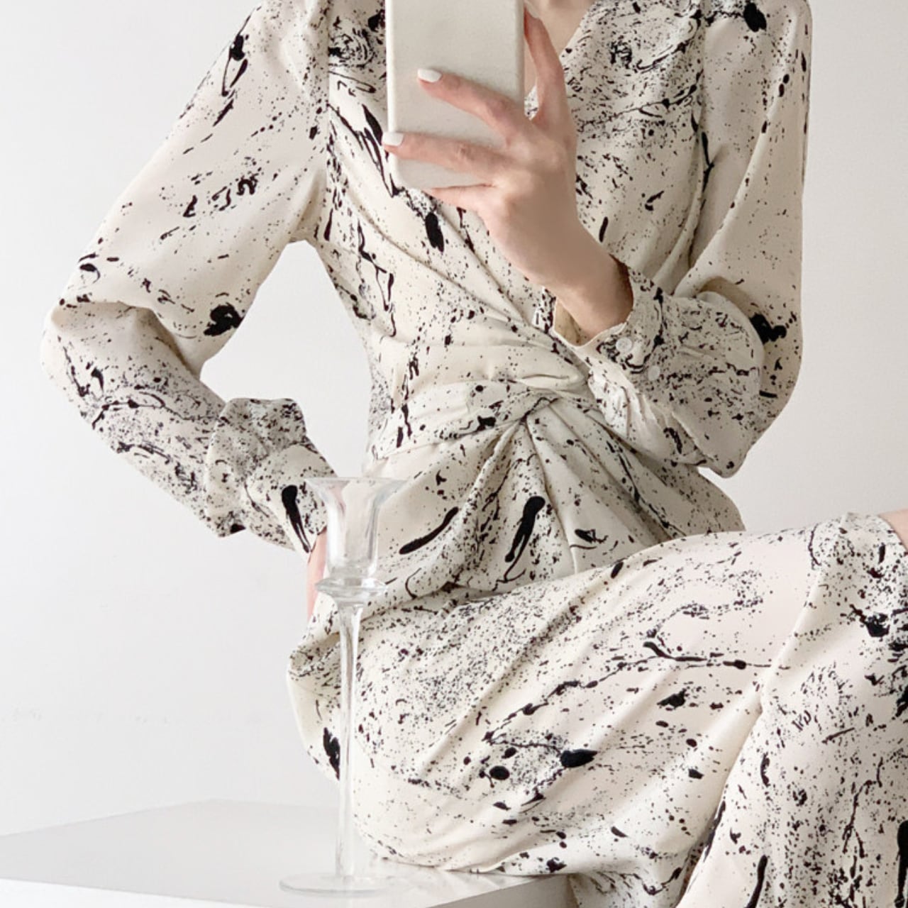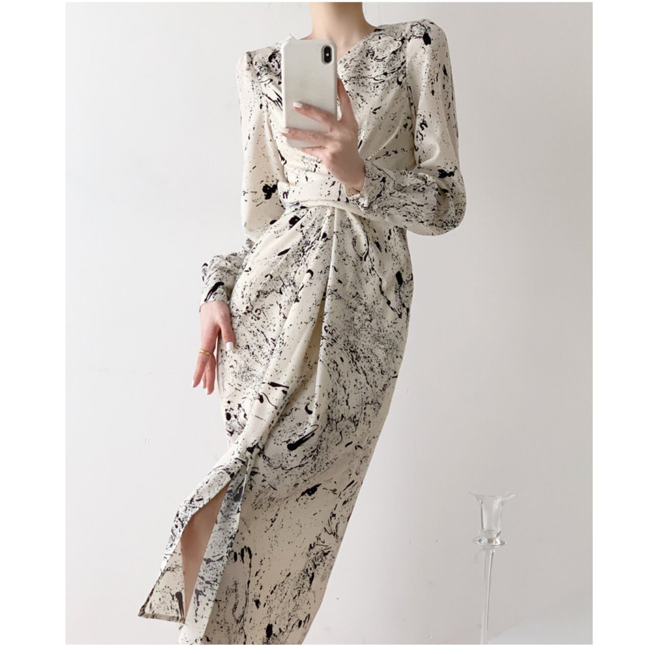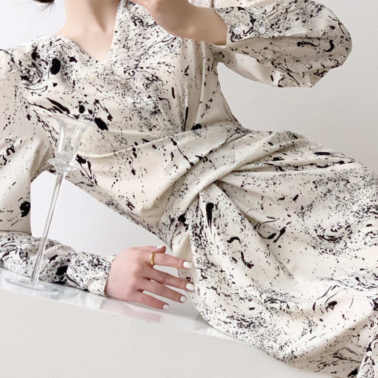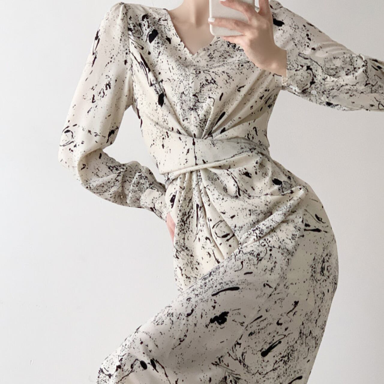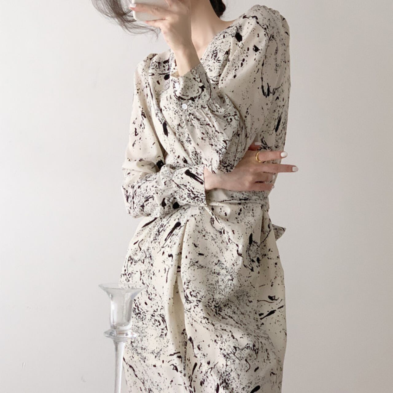 ・アートのような抽象プリントが目を引く、モード感のあるワンピース。