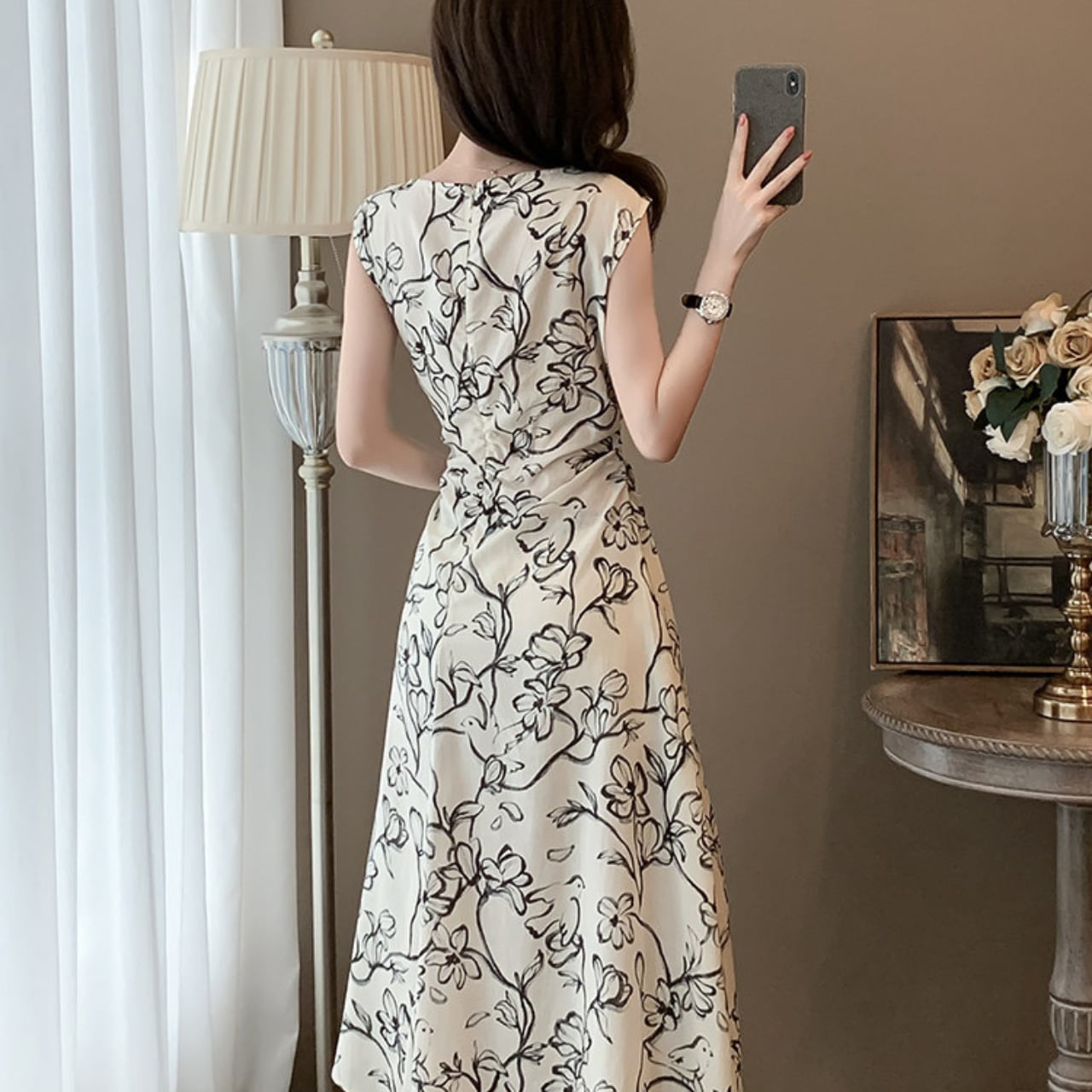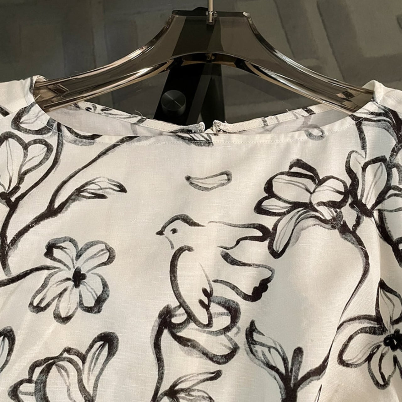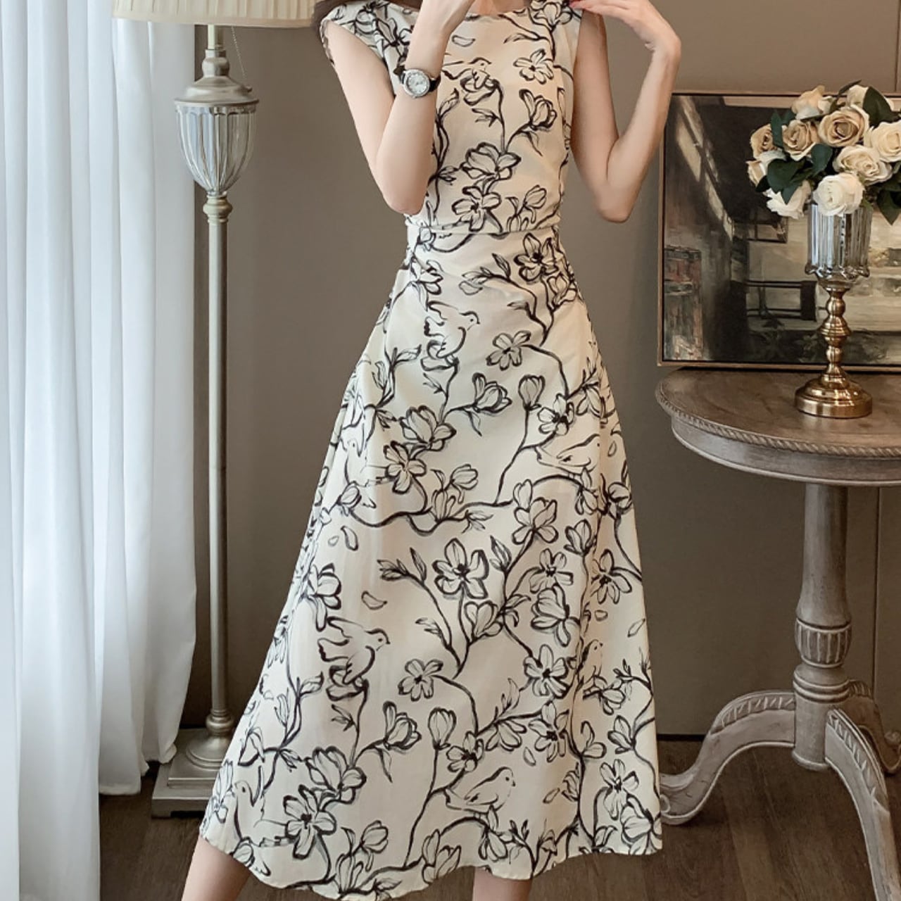 ・落ち着いたモノトーンのフラワープリントが上品な印象を与えるミディ丈ワンピースです。