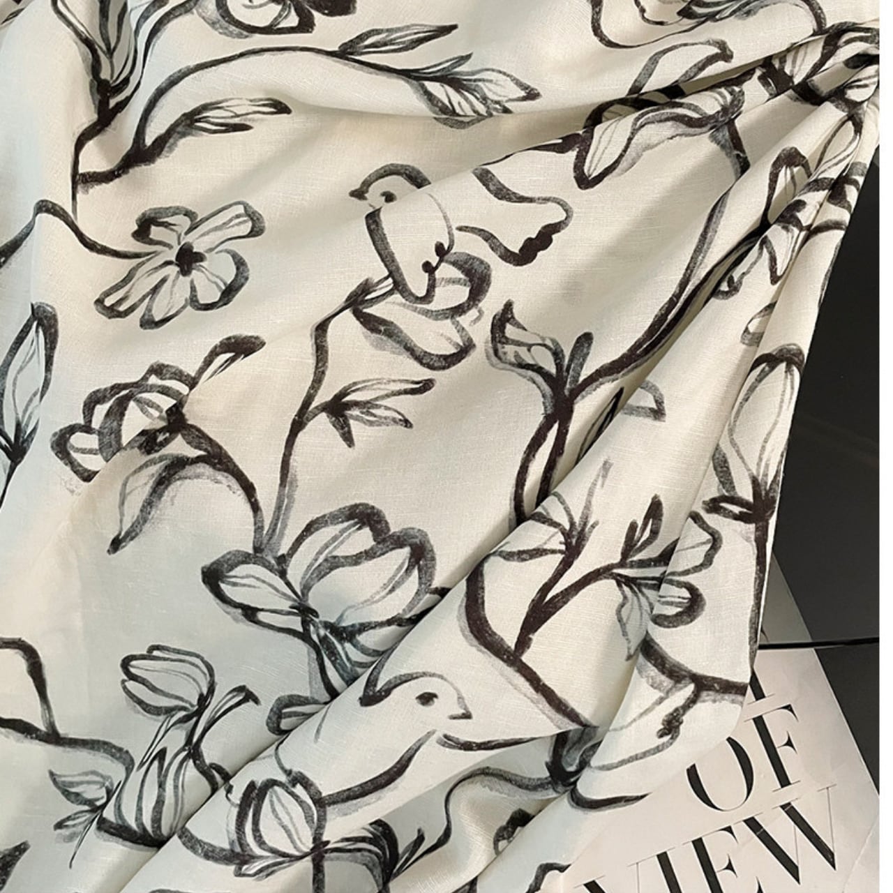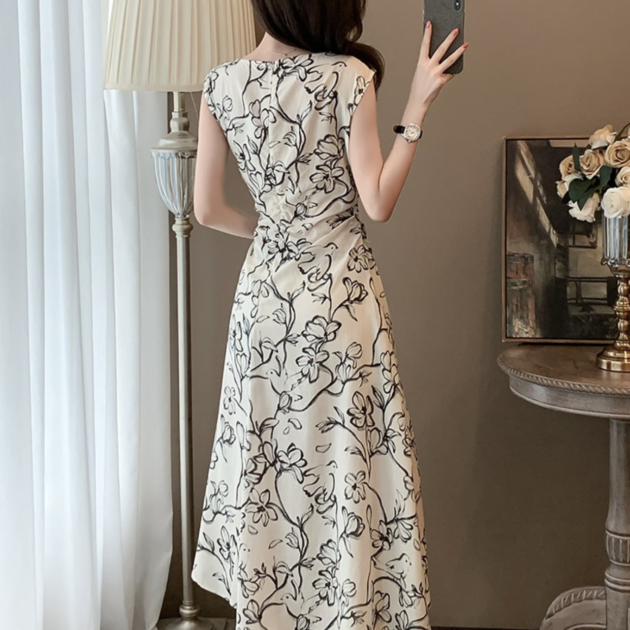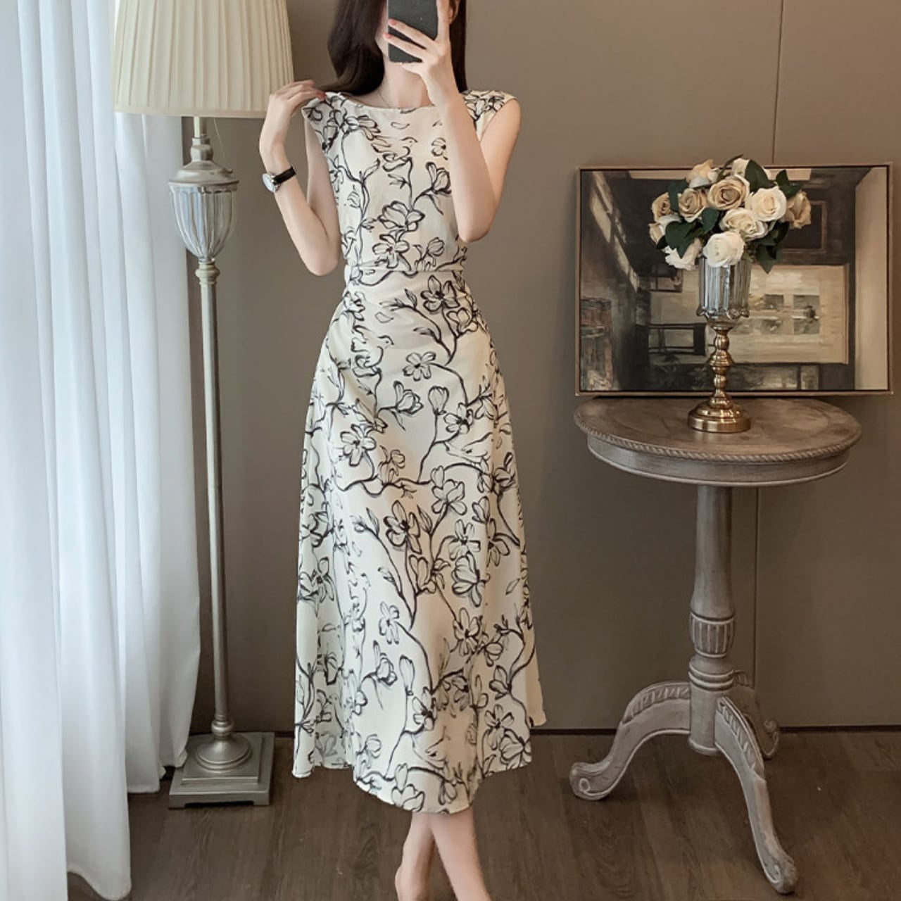 ・落ち着いたモノトーンのフラワープリントが上品な印象を与えるミディ丈ワンピースです。