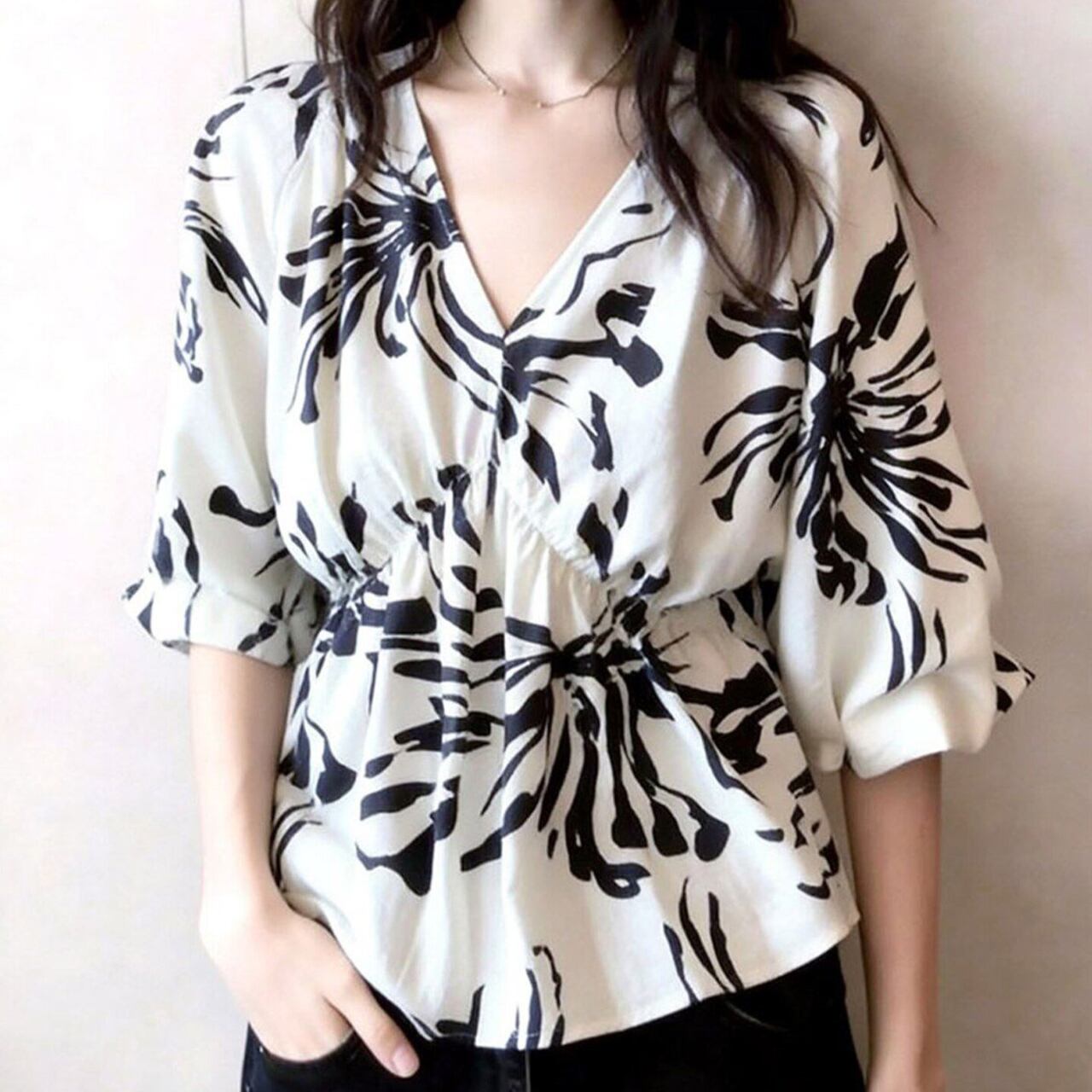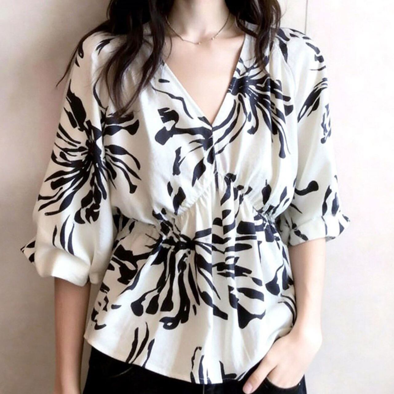 V-neck Waist Gather Long Sleeve Blouse L00861