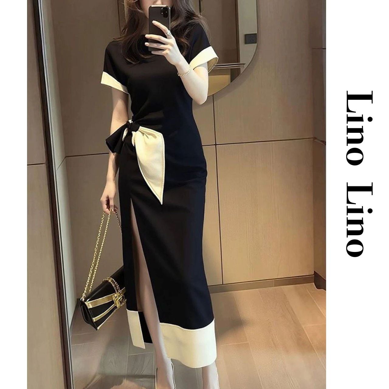 Ribbon Short Sleeve Slit Midi Onepierce L00863
