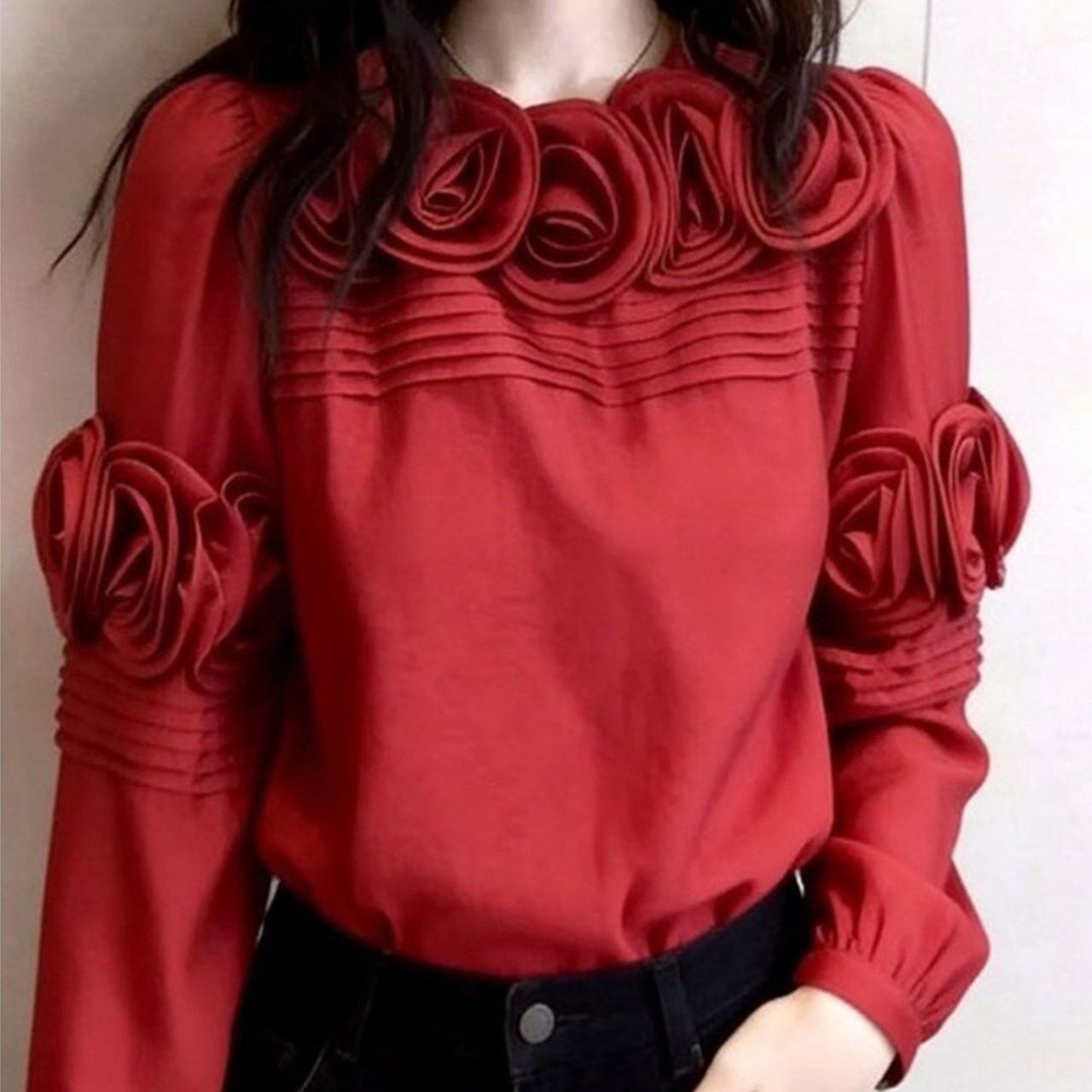 ・胸元と袖に立体的なフラワーモチーフをあしらった、華やかな印象のブラウスです。