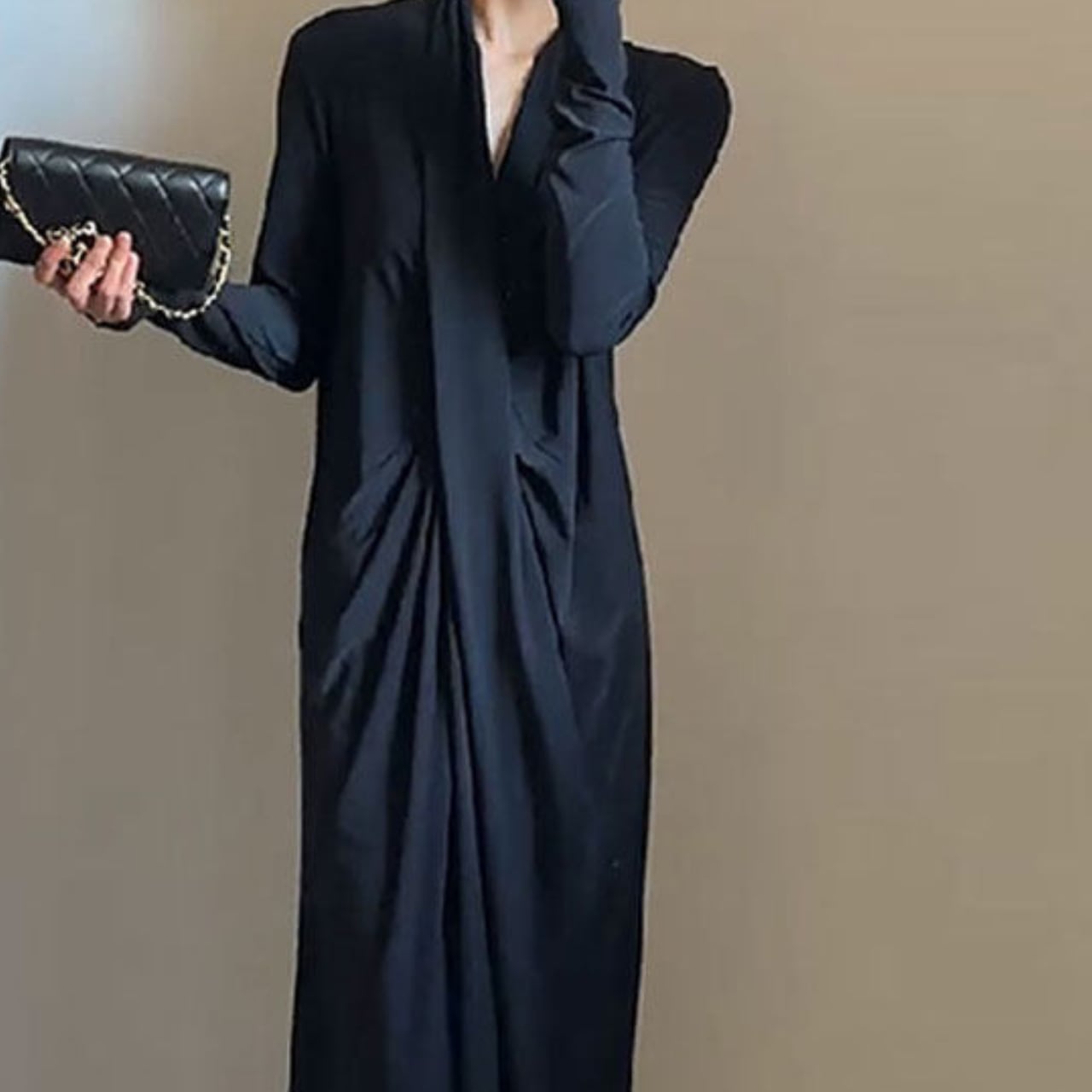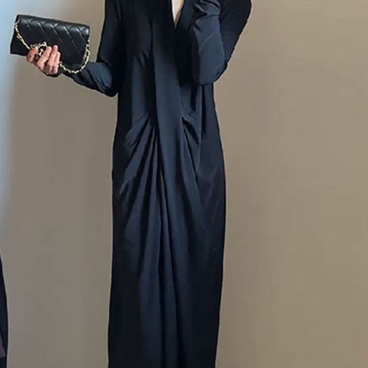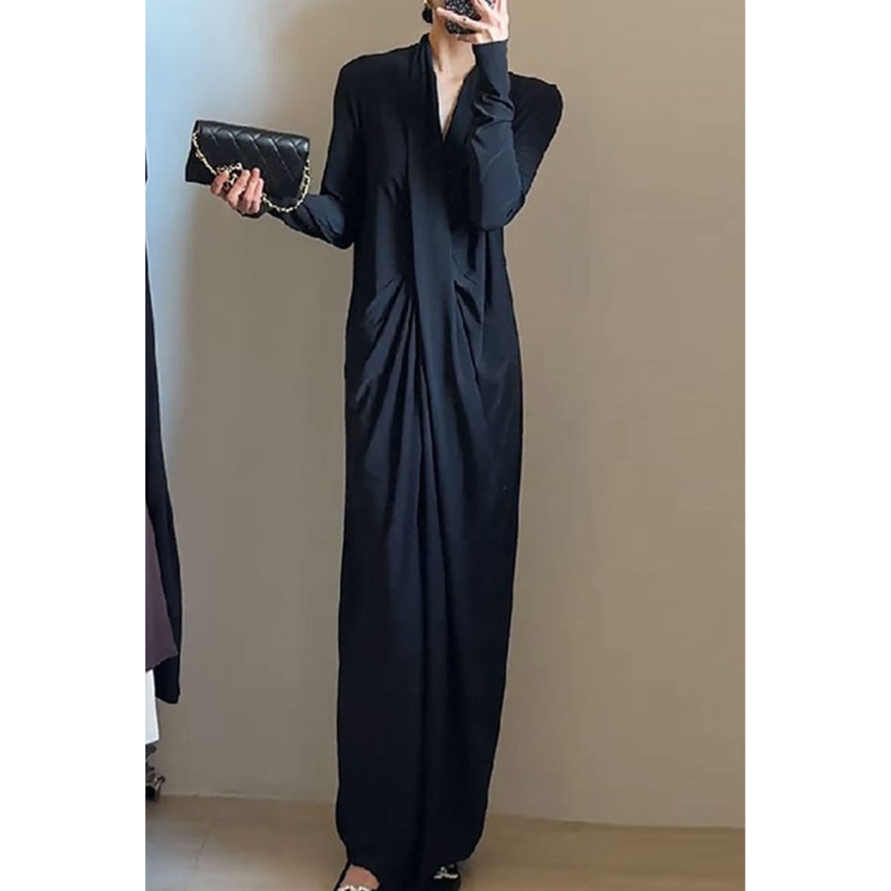 ・深めのVネックが印象的なマキシ丈ワンピース。
