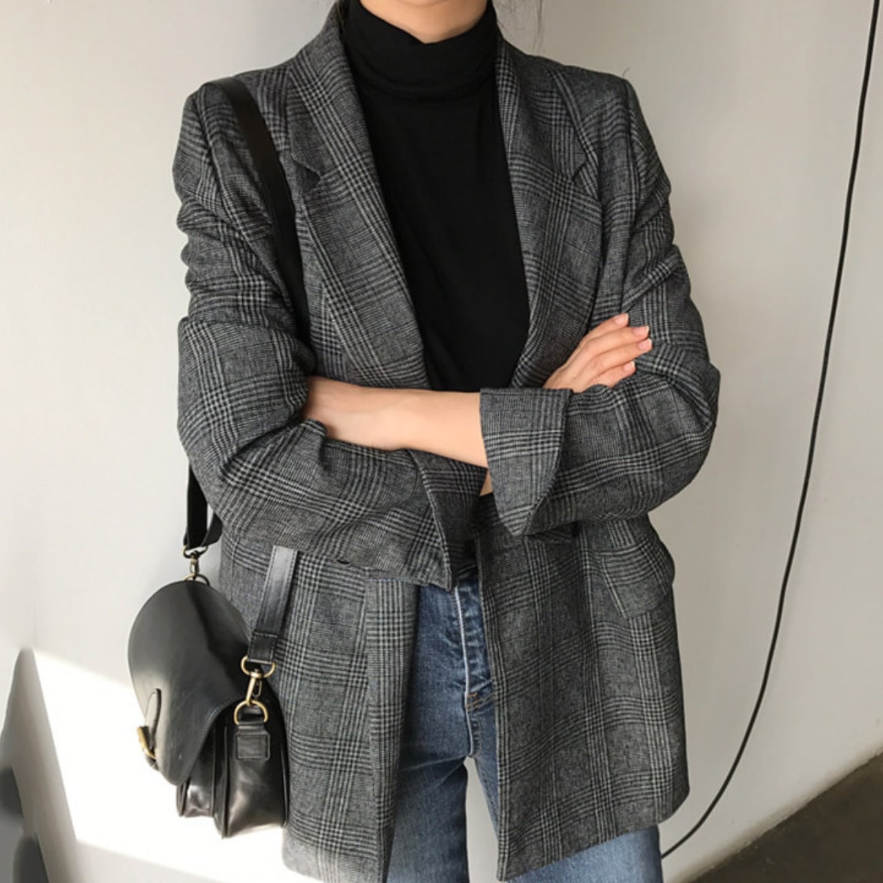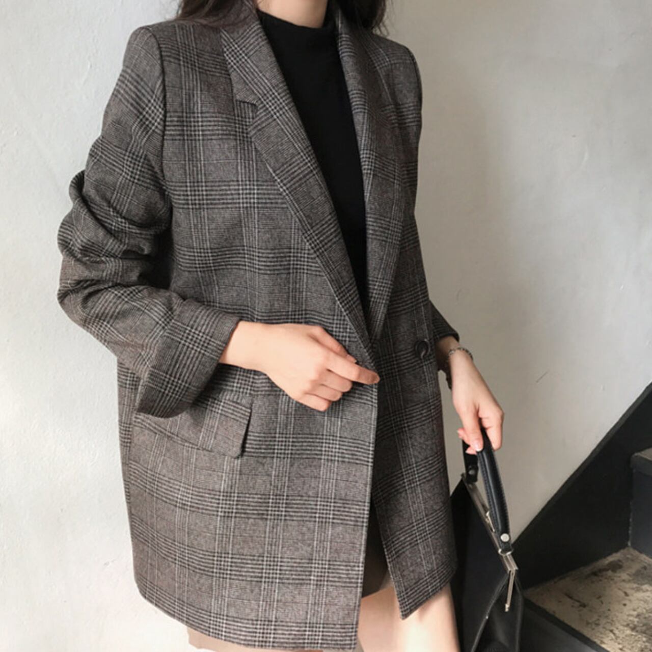 Check Pattern Double-Breasted Loose Jacket L00873