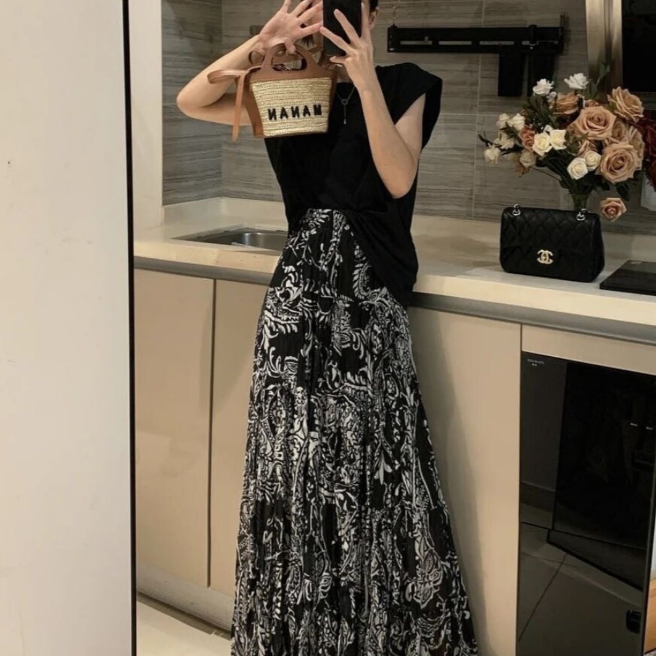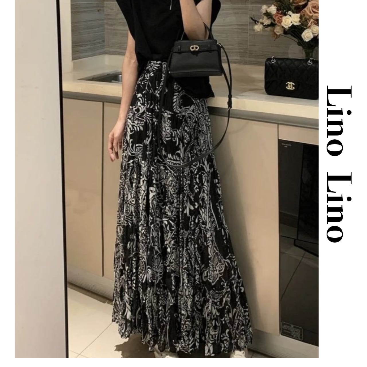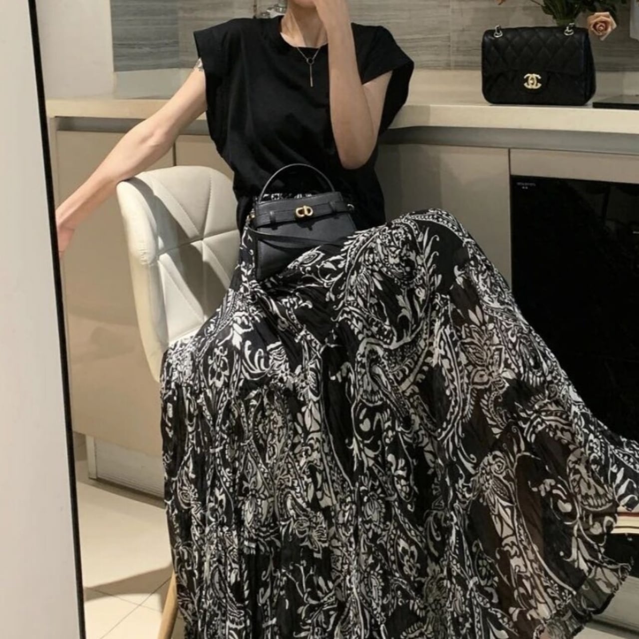 ・モノトーンのペイズリー柄が大人っぽく、甘さを抑えたモードフェミニンな印象に仕上げてくれます。