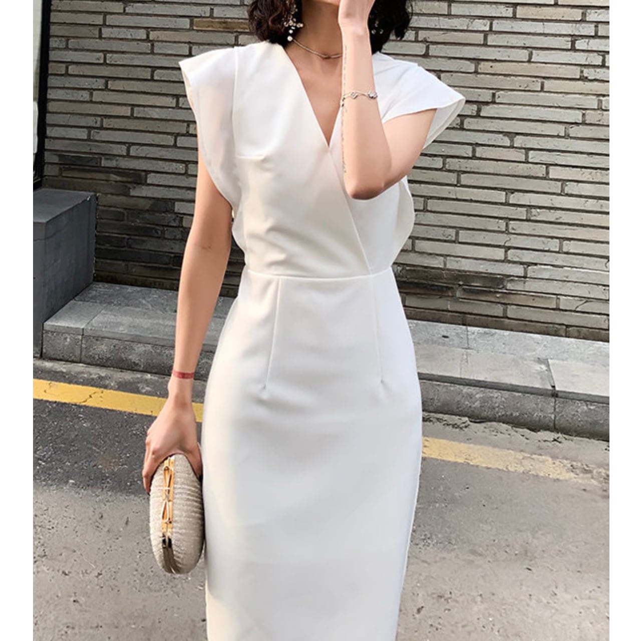 ・深めのVネックと立体感のあるショルダーデザインが、顔まわりをすっきりと見せつつ、女性らしい華やかさを演出します。