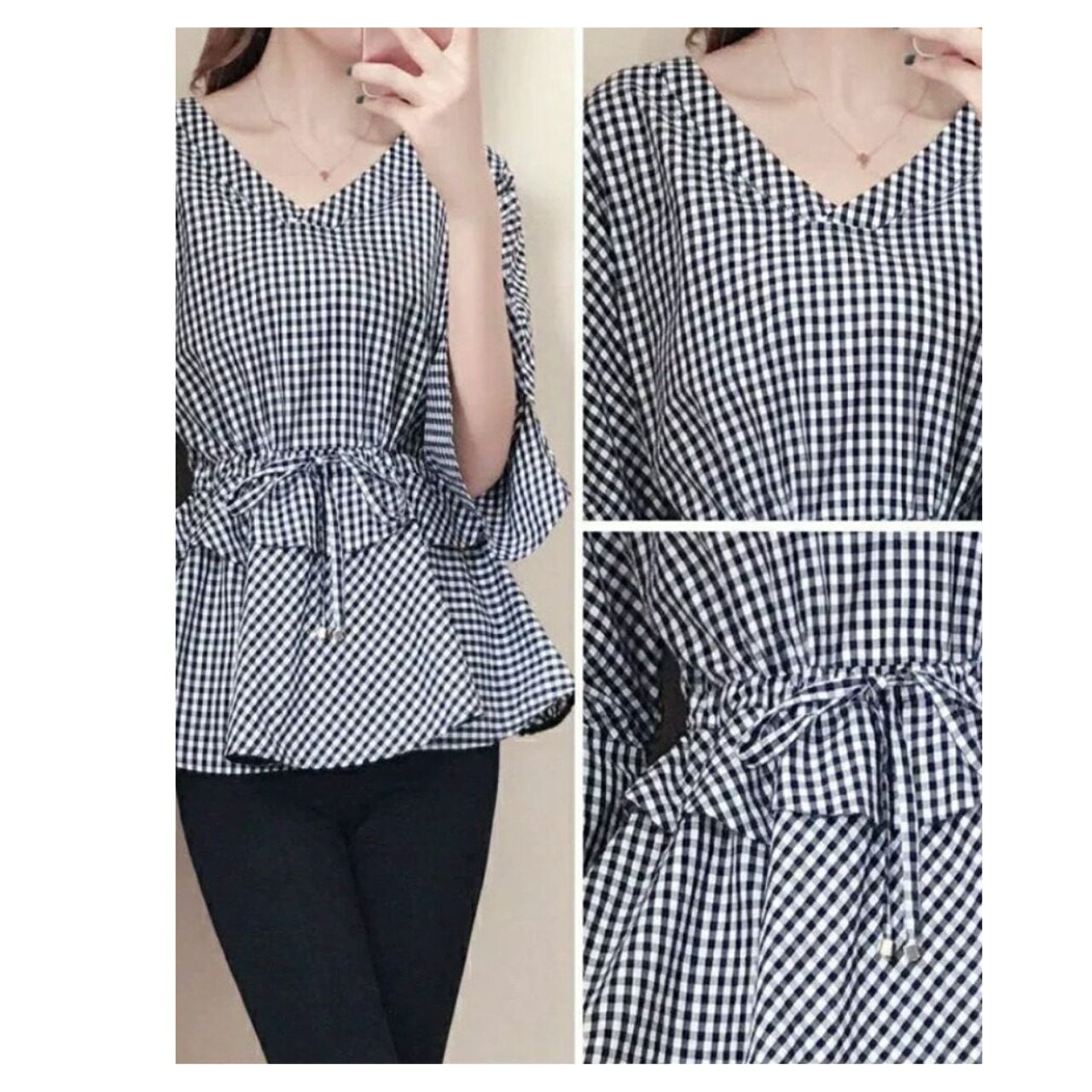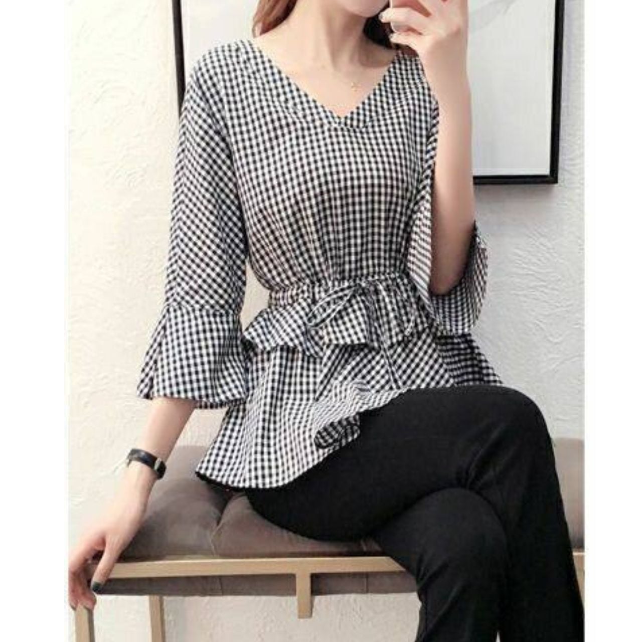 Gingham Check Waist Ribbon Top L00882