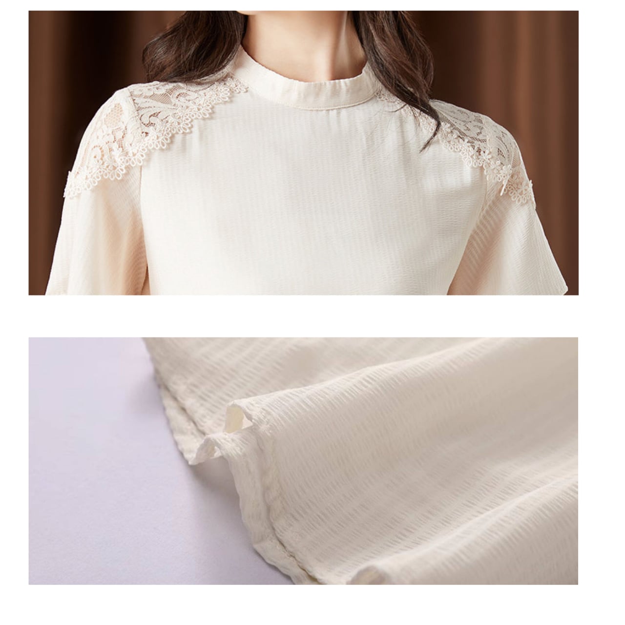 ・肩にあしらわれたレースが、さりげない華やかさをプラス。