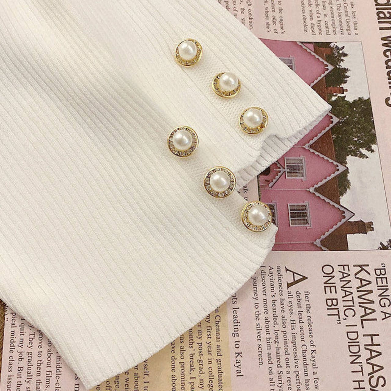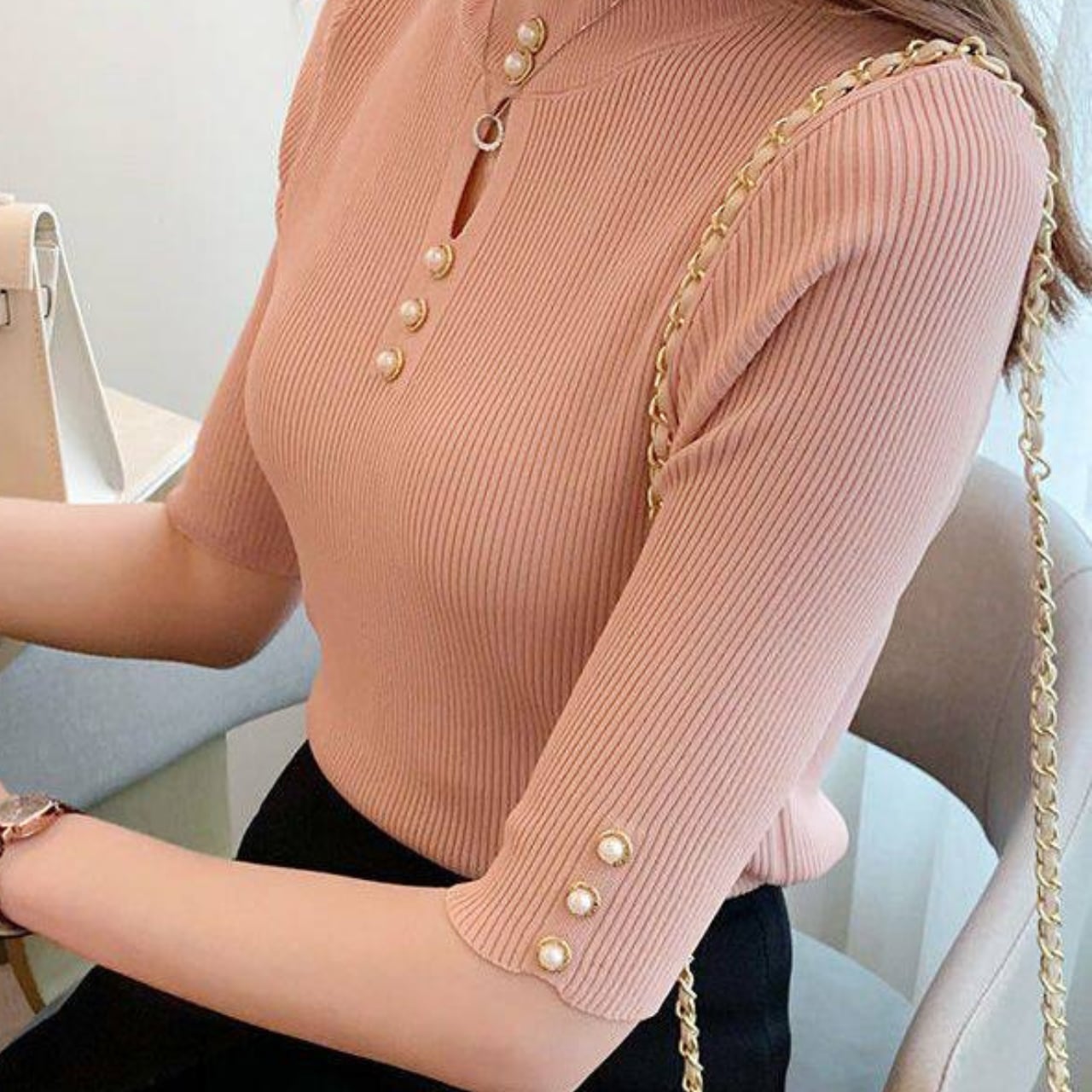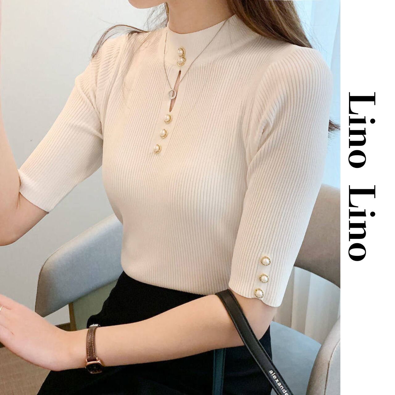・首元のボタンとハーフスリーブが、きちんと感を演出しつつ、女性らしさを引き立てます。