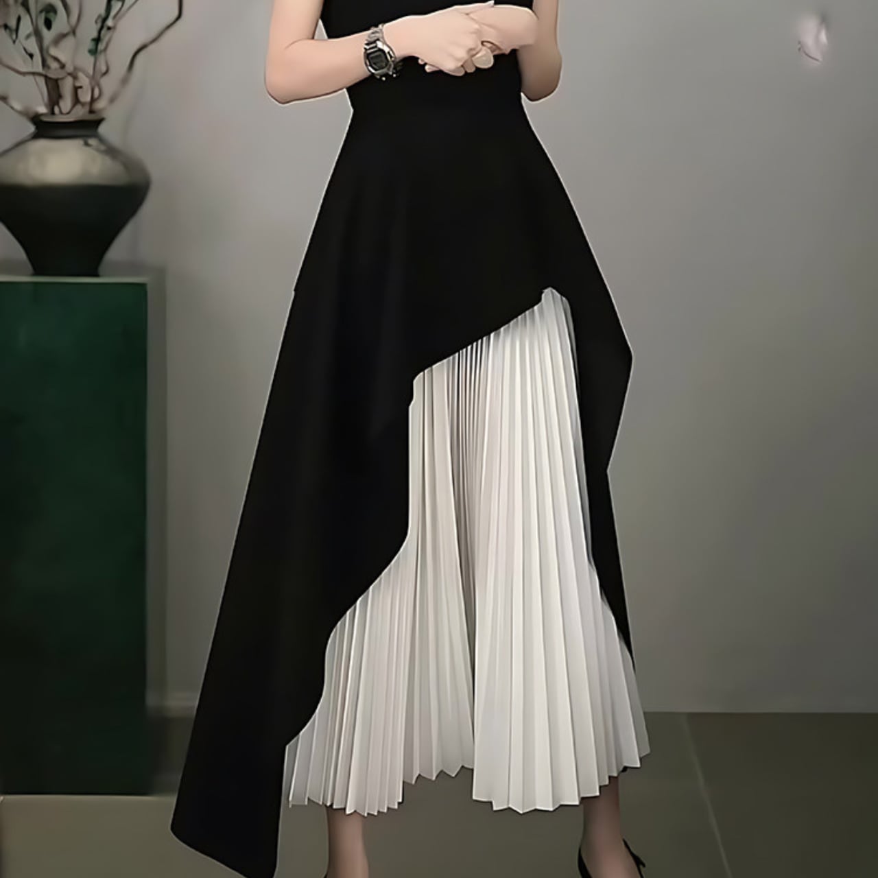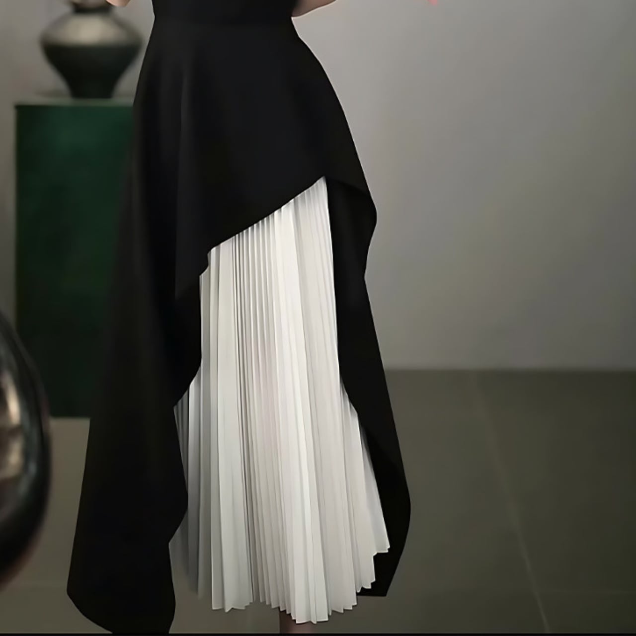 ・ミディ丈のスカート部分から覗くプリーツが、エレガントな雰囲気を演出します。
